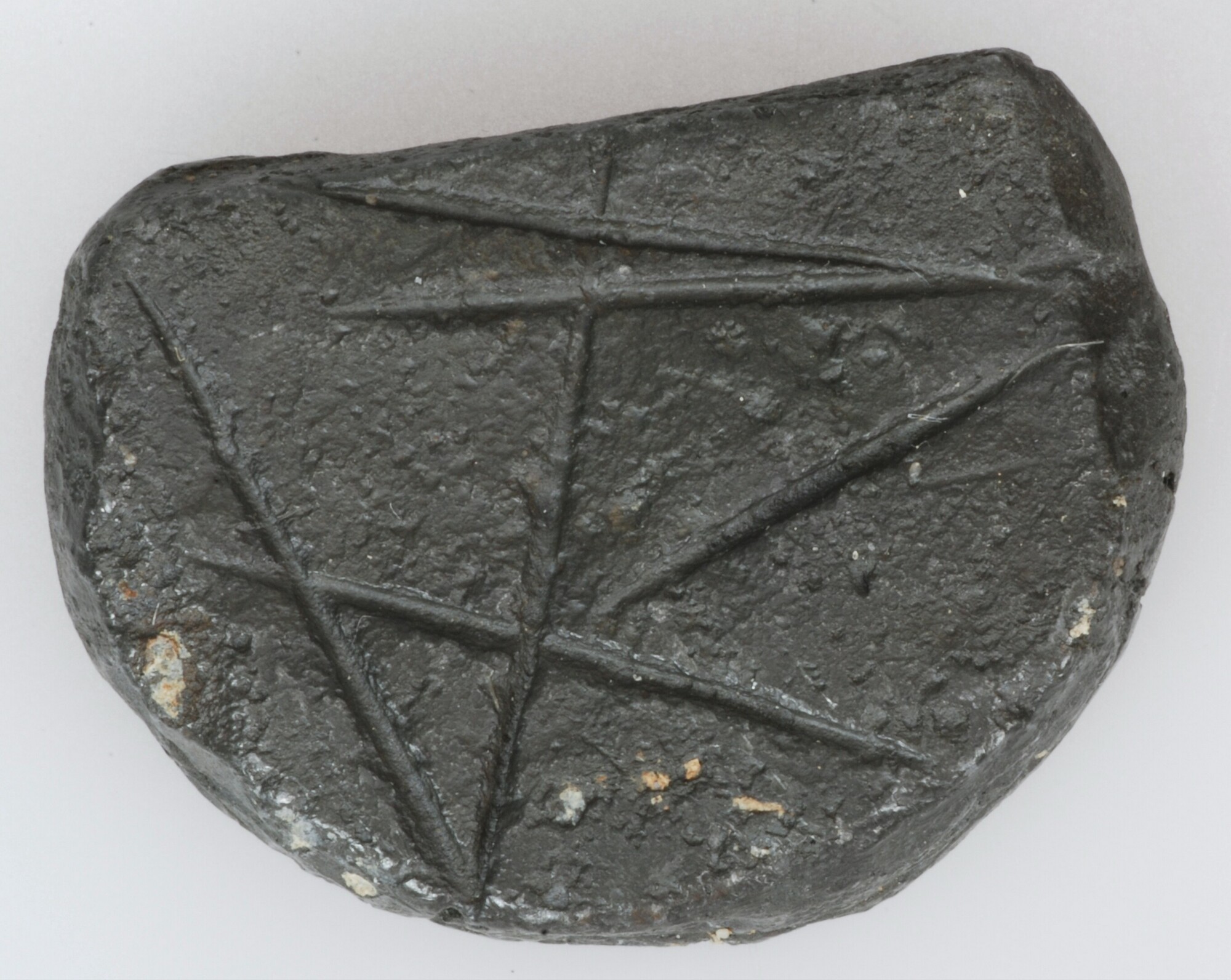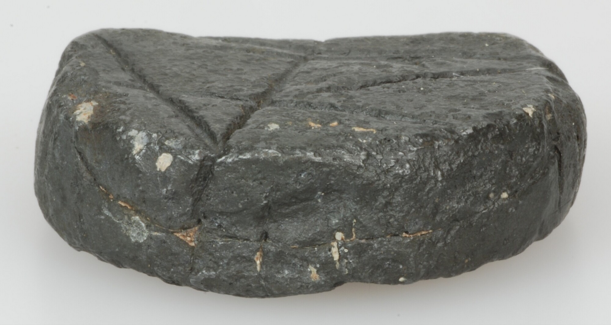Blokgewicht/speelschijf; ingekraste lijnen in geometrisch patroon (merk?), mogelijk merkteken eigenaar; halfronde vorm (gedeelte afgesneden);70 gram; vondstomstandigheden: stort