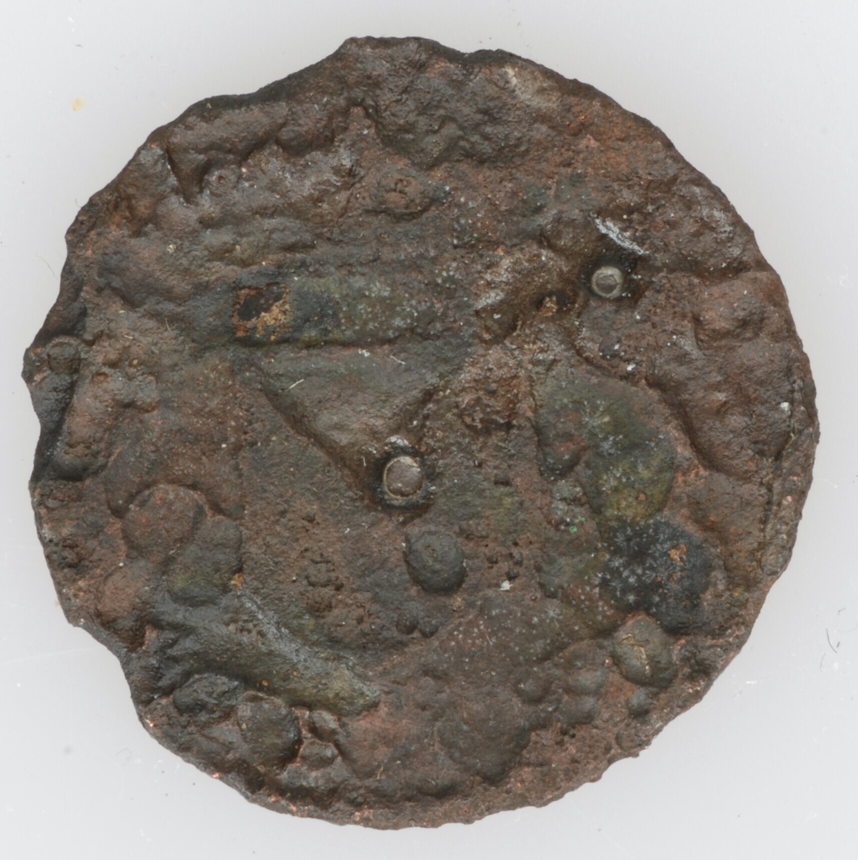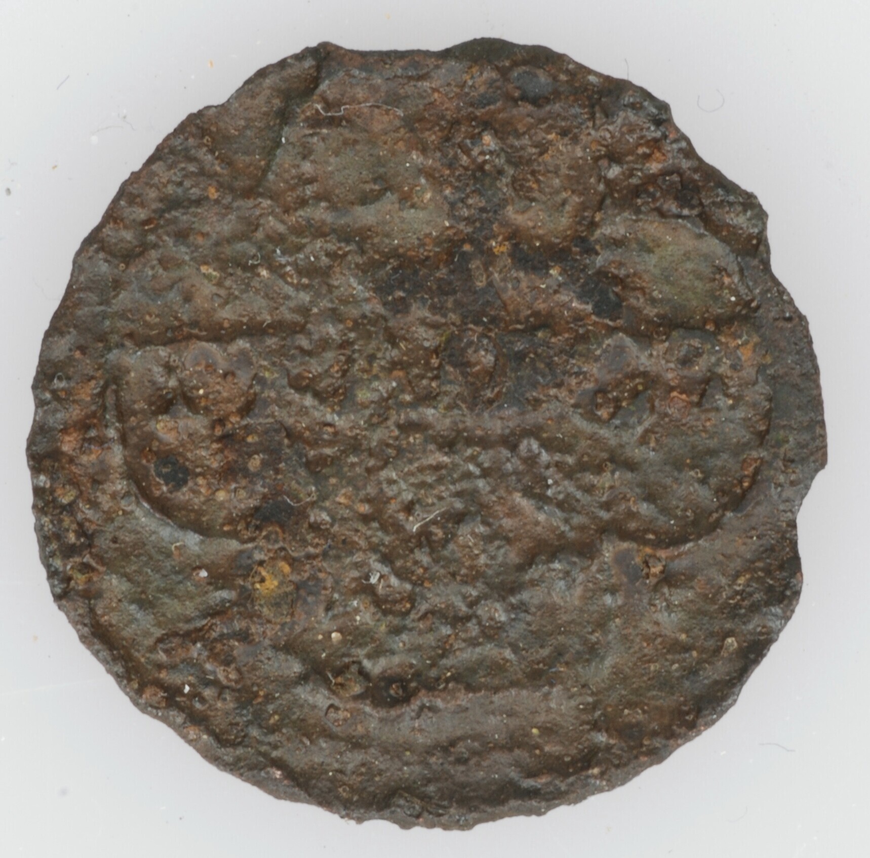 Duit Stad Utrecht; vz.: Een versiering van vier bogen (vierpas) met daarin de tekst UTRECHT in twee regels; kz.: Stadswapen van Utrecht dat wordt vastgehouden door twee leeuwen; gewicht: 2.04 gram
