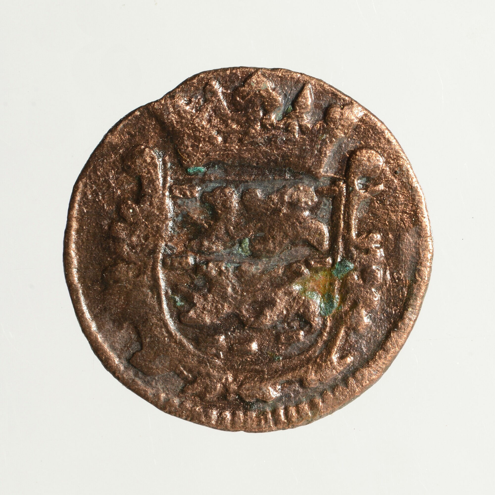 Duit; Friesland provincie (1581-1795); vz.: in vier regels: muntteken klimmende leeuw tussen twee bladornamenten / FRISIA / (rozet) 1682 (rozet) / rozet tussen twee bladornamenten; kz.: met open kroon gekroond en versierd wapenschild van Friesland; muntplaats: Leeuwarden; gewicht: 2.03 gram