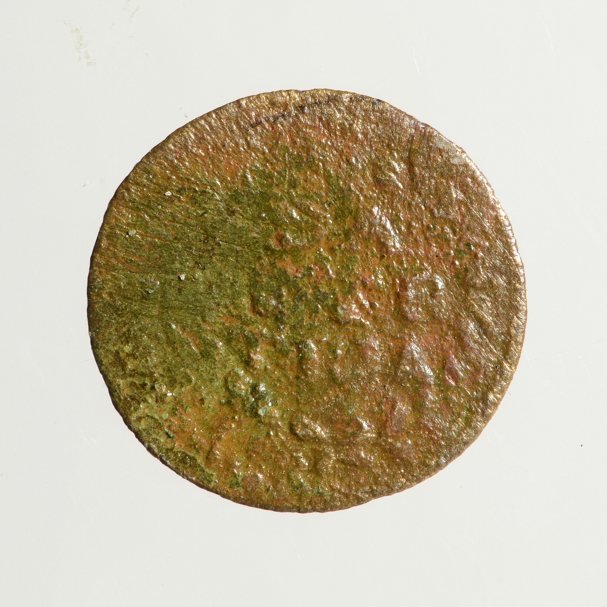 Duit; Reckheim Rijksgraafschap (1623-1795); imitatie Friesland; vz.: binnen bladerkrans in drie regels: DA / ETR/ TRIA; kz.: versierd maar ongekroond wapenschild met twee gaande leeuwen naar links, omschrift: • CONT [...]; muntplaats: Reckheim; gewicht: 1.39 gram