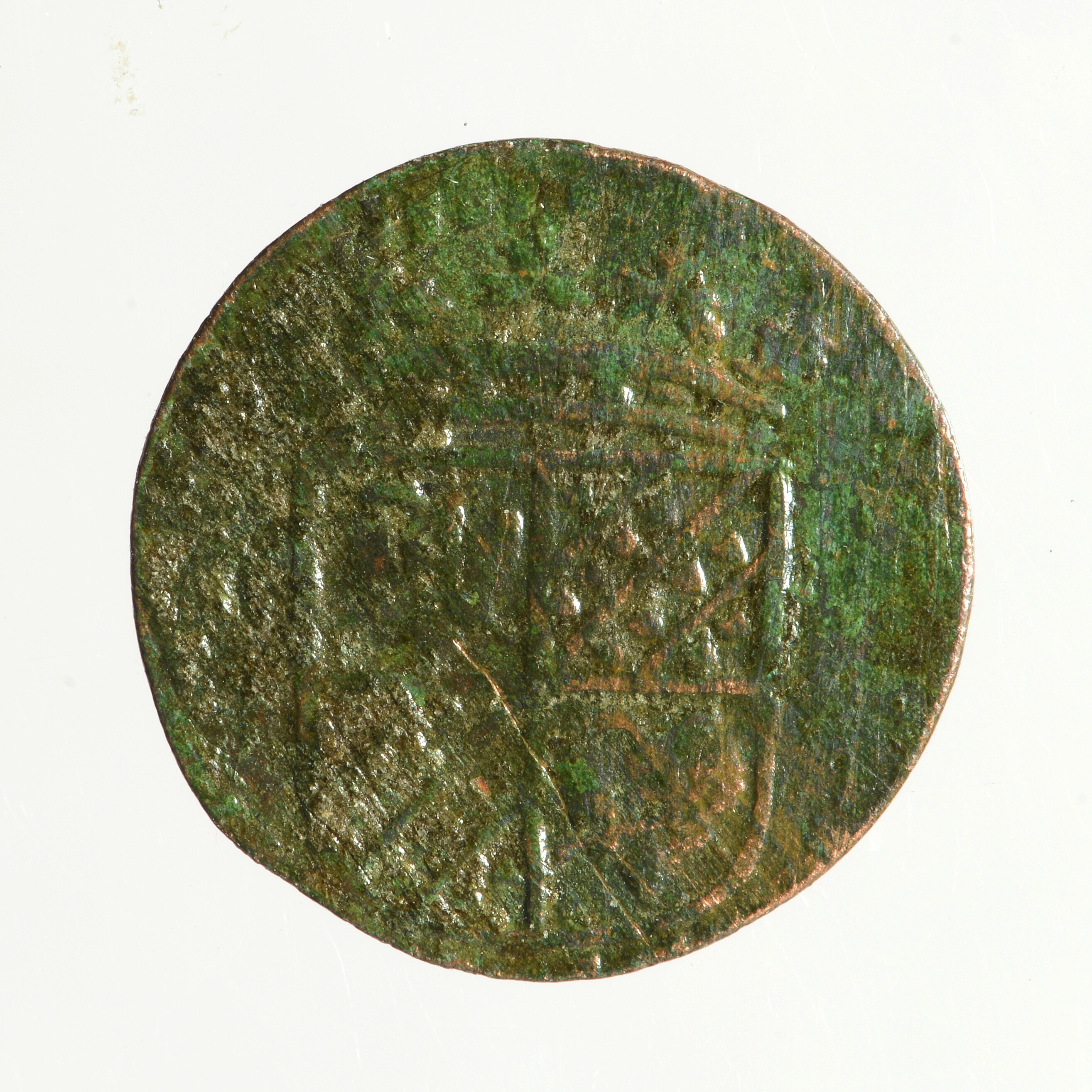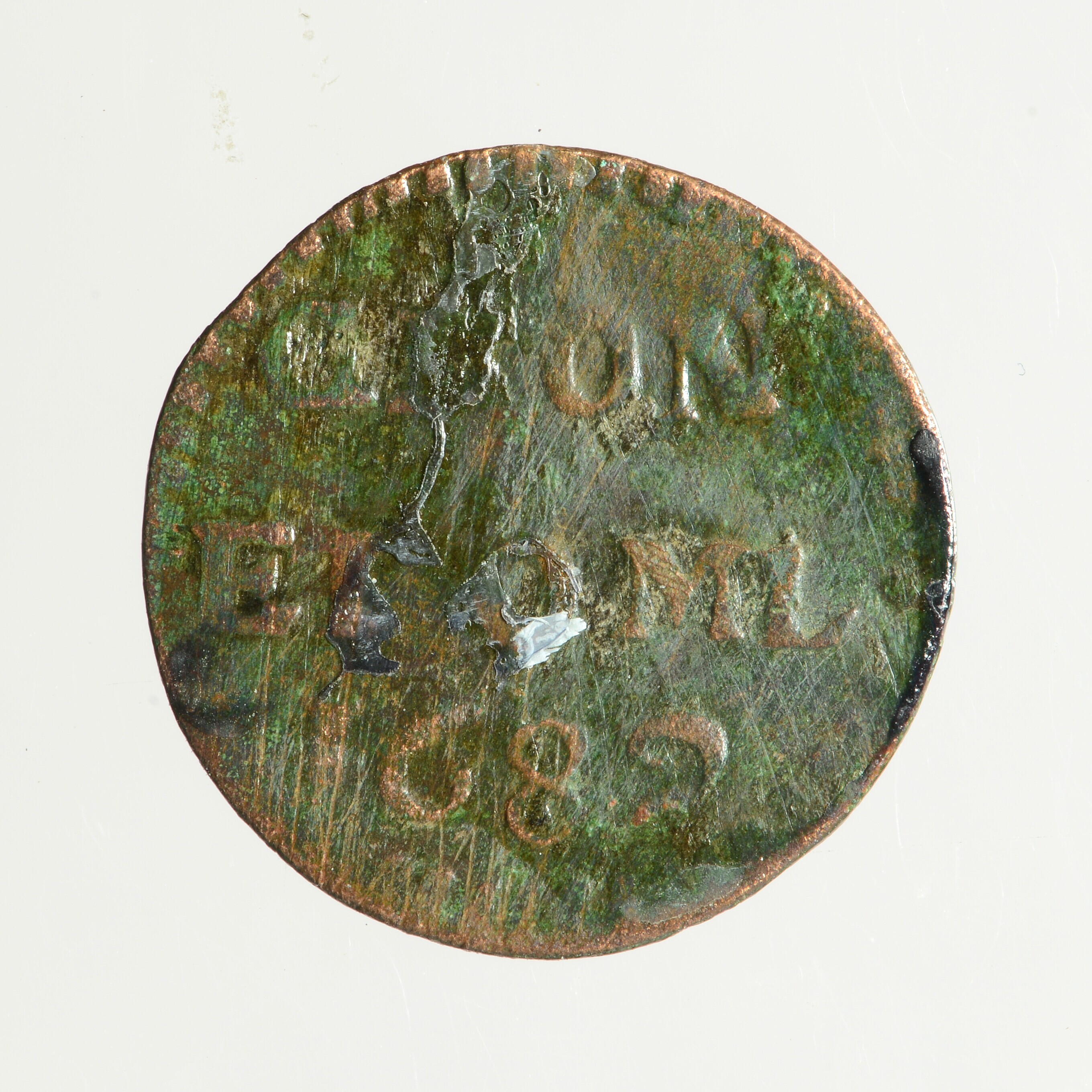 Duit; Groningen en Ommelanden; vz.: in drie regels: GRON / ET OML / 1682; kz.: gekroond wapen van Groningen en Ommelanden; muntplaats: Groningen; gewicht: 1.63 gram