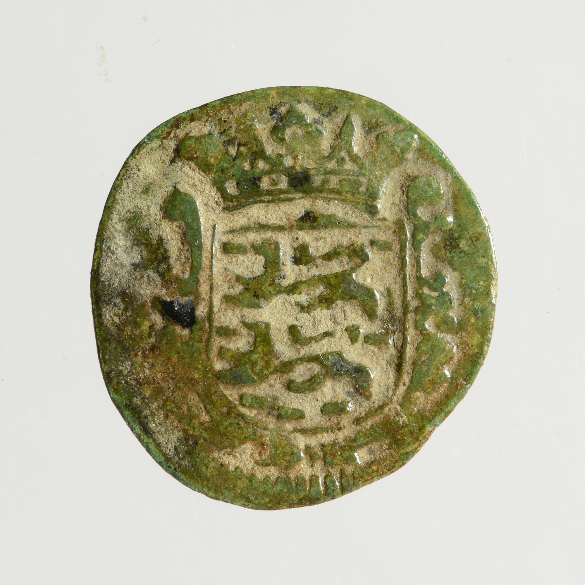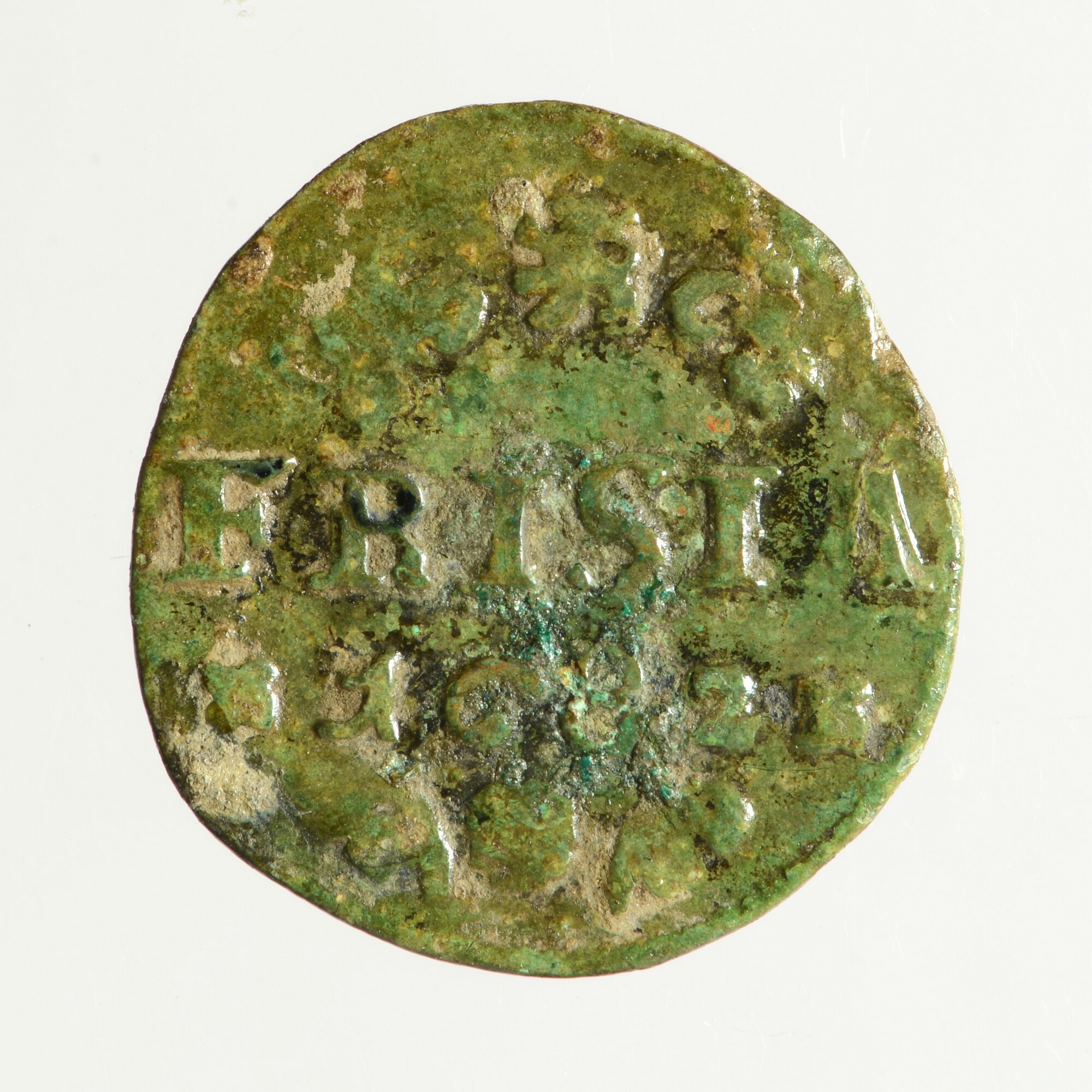 Duit; Friesland provincie (1581-1795); vz.: in vier regels: muntteken klimmende leeuw tussen twee bladornamenten / FRISIA / (rozet) 1682 (rozet) / rozet tussen twee bladornamenten; kz.: met open kroon gekroond en versierd wapenschild van Friesland; muntplaats: Leeuwarden; gewicht: 2.04 gram