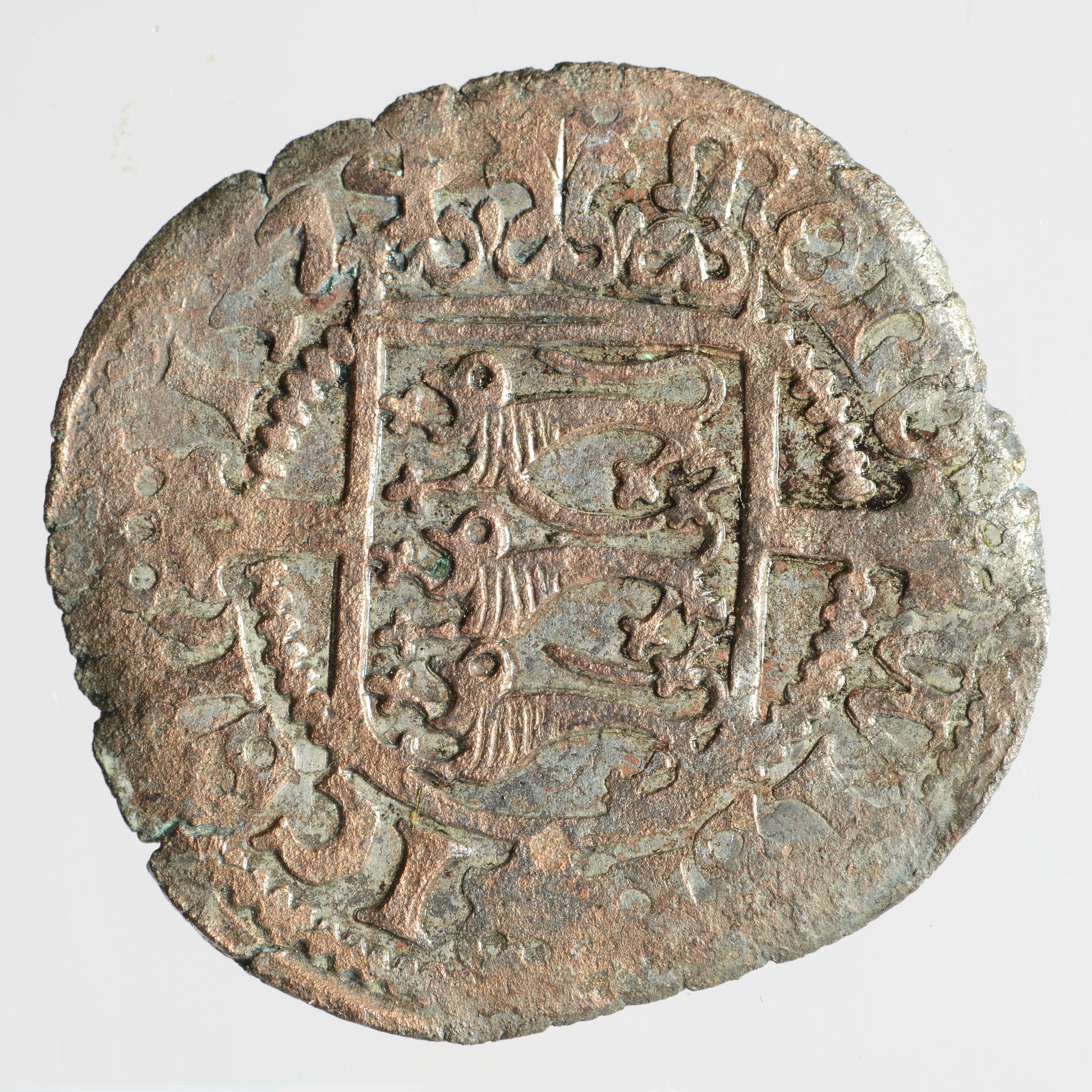 Skilling; Visby, Gotland; Søren Norby (1517-1525); vz.: gedeeld wapenschild met links (heraldisch rechts) een balk, omschrift: SEVERIN NORBI; kz.: gekroond wapenschild met drie leeuwen, op kruis, omschrift: MONO – WISB – ICEN – 1524; gewicht: 3.96 gram