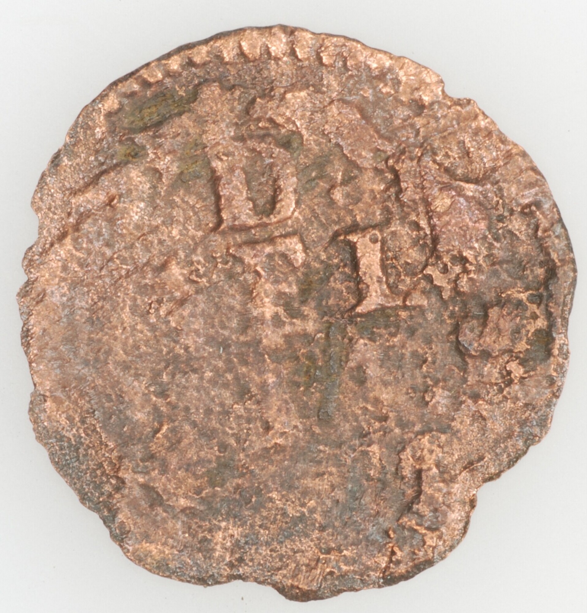 Duit; Gelderland Provincie (1581-1795); vz.: tulpkrans met daarin de tekst .D. GEL RIÆ in drie regels en daaronder het jaartal (onleesbaar); kz.: indet.; gewicht: 0.79 gram