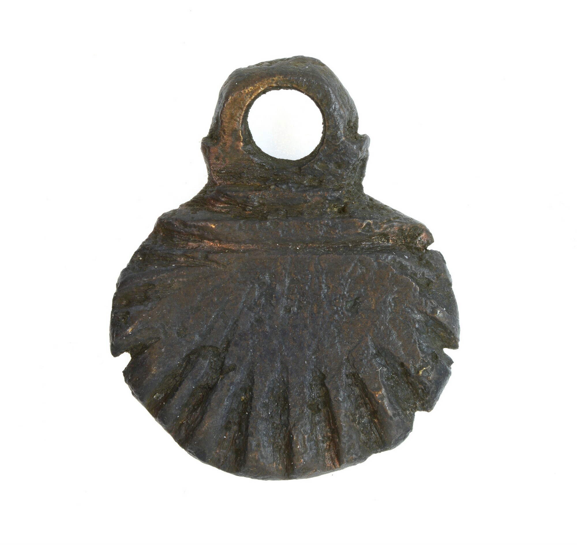 Insigne; hanger in de vorm van een gestileerde Jacobsschelp met ophangoog aan bovenzijde