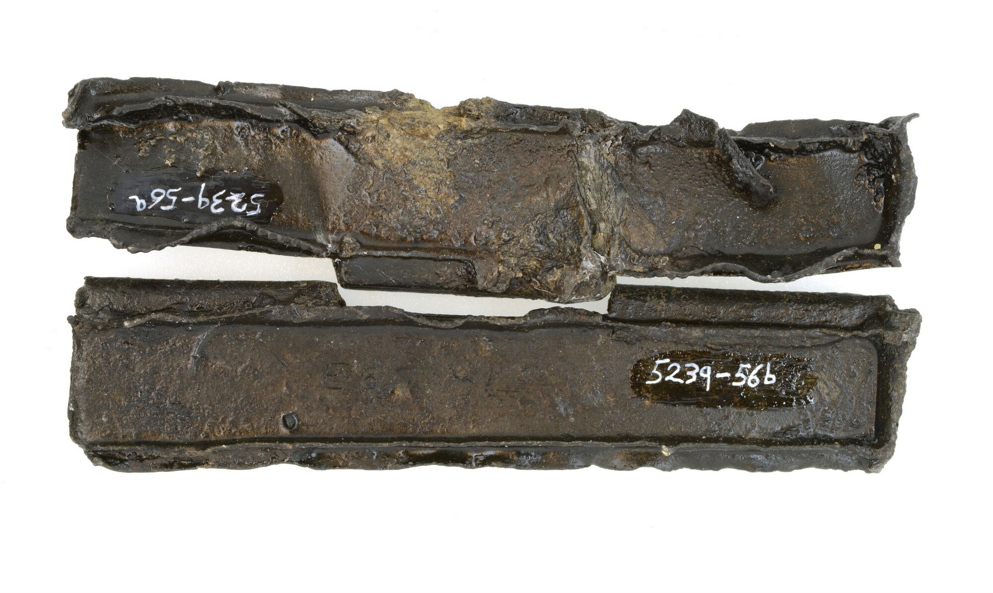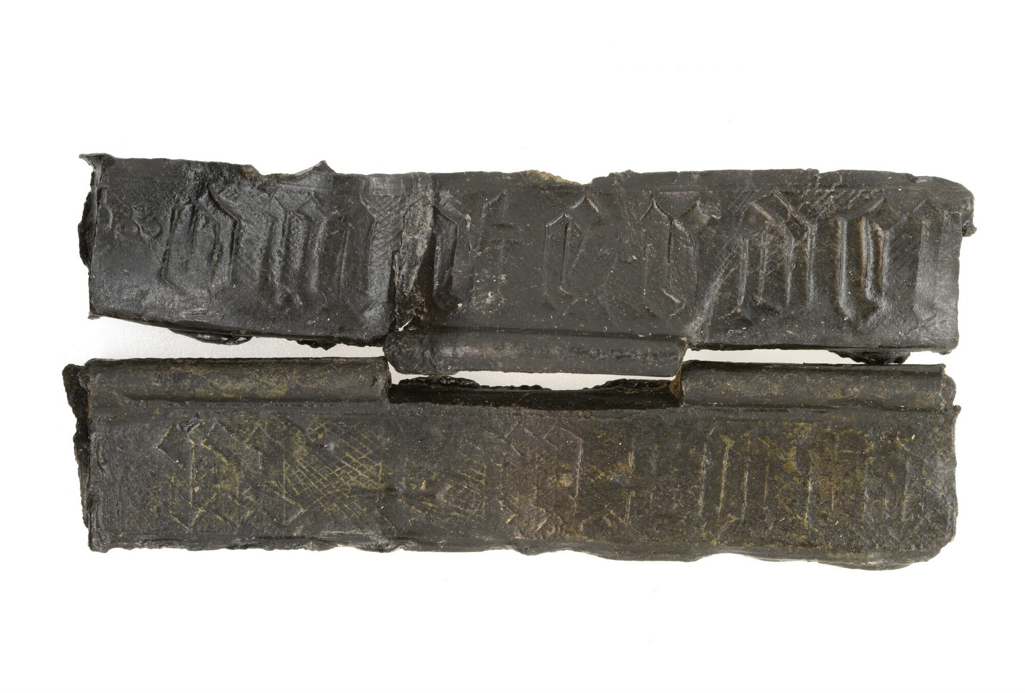 Altaar/diptiek; twee loodstrips met scharnieren; aan één zijde van beide strips gotisch schrift in reliëf: ‘MEMENTO’ en ‘O MATER DEI’; herkomst: Aken, Duitsland
