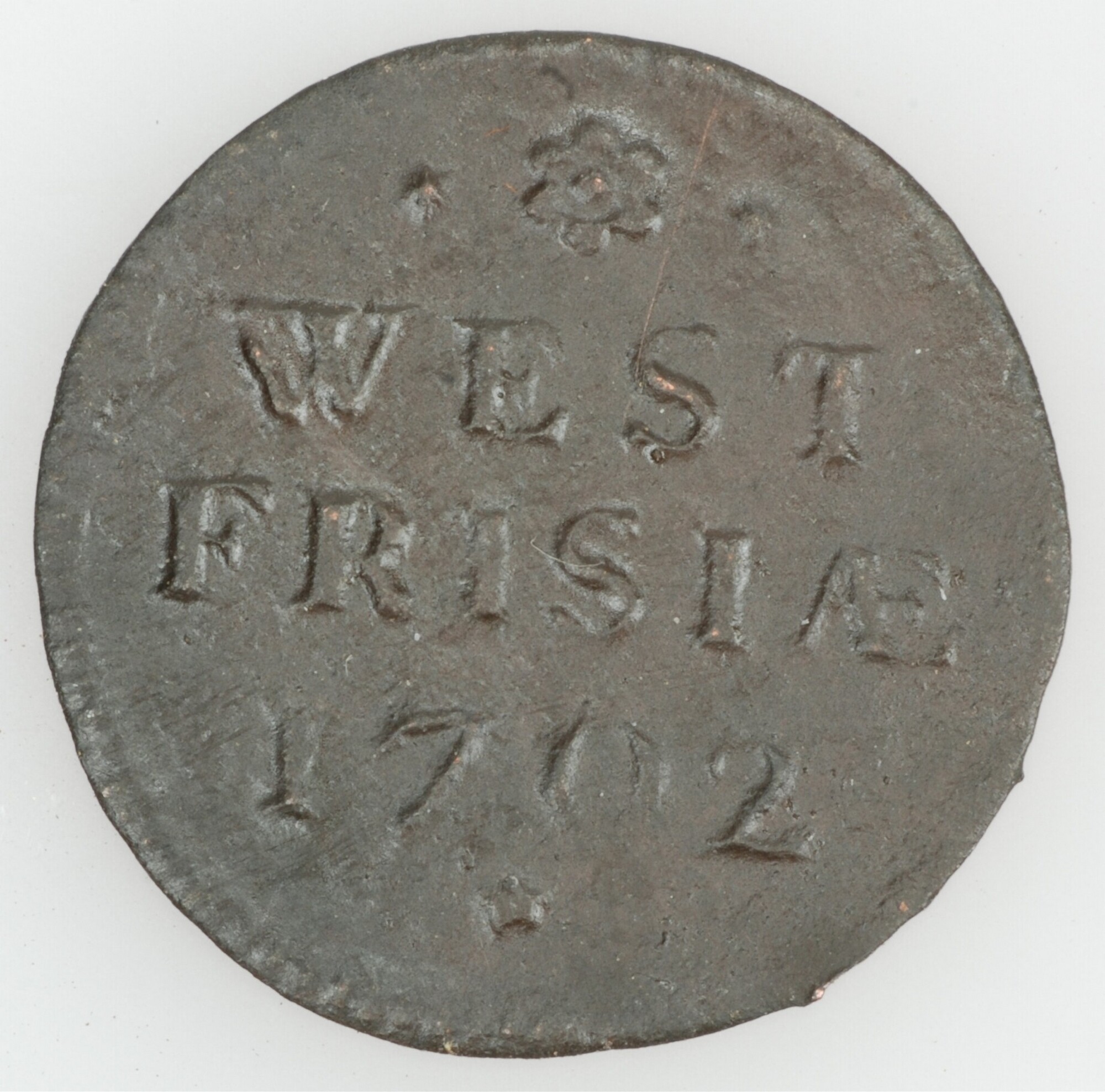 Duit West-Friesland; vz: rozet en daaronder WEST FRISIAE in twee regels en jaartal 1702; kz: Gekroond ingebogen wapenschild met twee gaande leeuwen boven elkaar. De leeuwen hebben hun kop 'en face' gericht en het wapen aan weerszijden versierd met bladertakken; gewicht: 1.85 gram