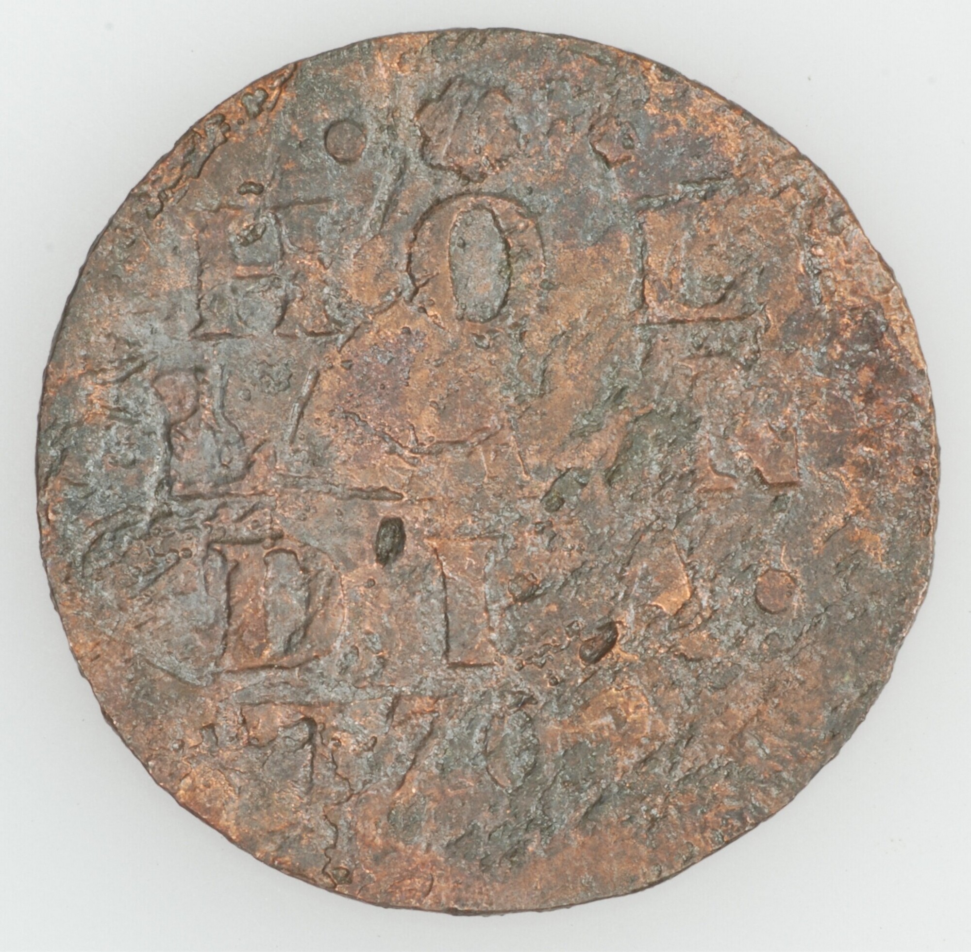 Duit; Holland Provincie (1581-1795); vz.: HOL LAN DIA. in drie regels en het jaartal 1702; kz: Een leeuw naar links in een gesloten Hollandse tuin. De leeuw heeft met zijn klauwen een speer vast met op de punt de zogenaamde vrijheidshoed