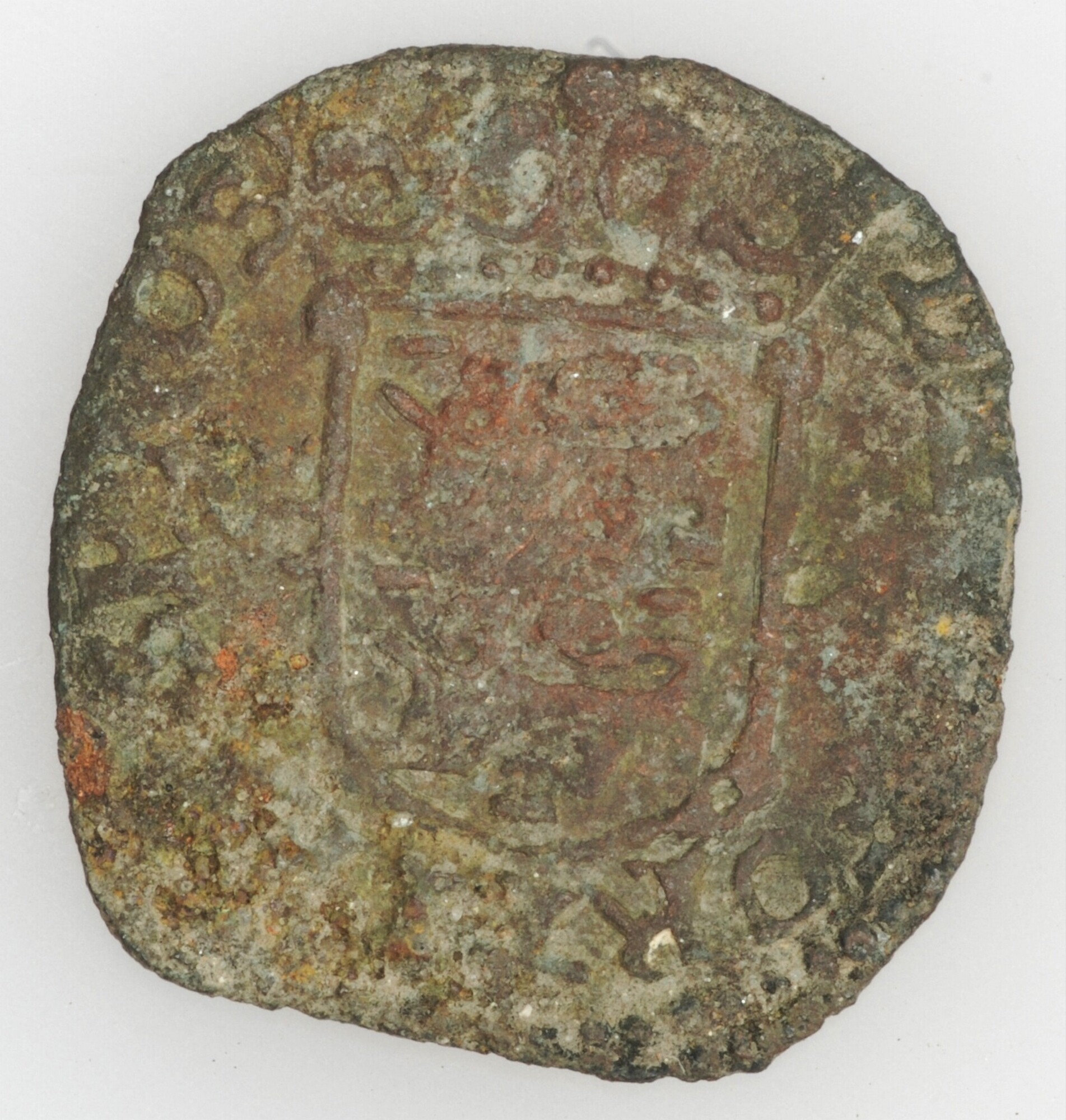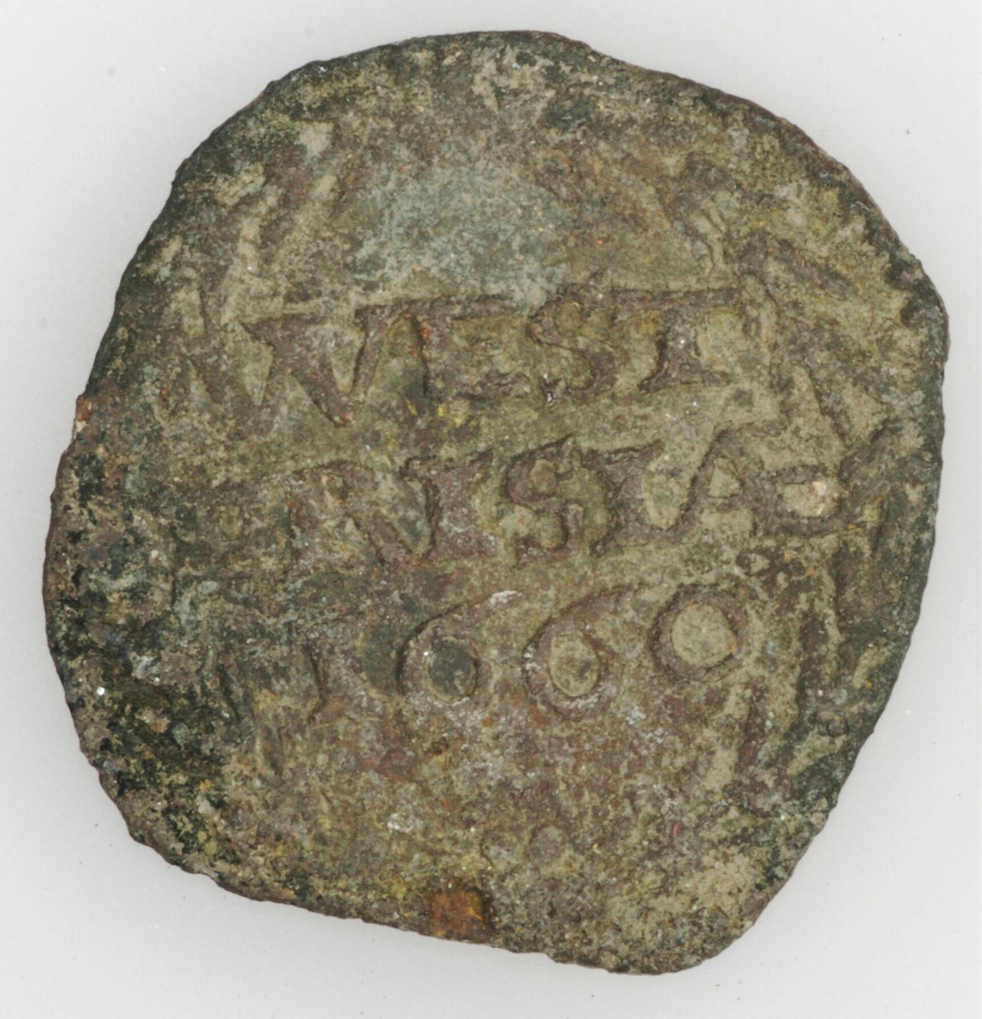 Duit; West-Friesland Provincie (1581-1795); vz.: in een bladerkrans in drie regels WEST / FRISIAE / 1660; kz.: gekroond en versierd wapenschild van West-Friesland, terzijde twee punten, met omschrift DEVS FORTI•[ET•S]P•NOS; muntplaats: Medemblik; gewicht:1.80 gram