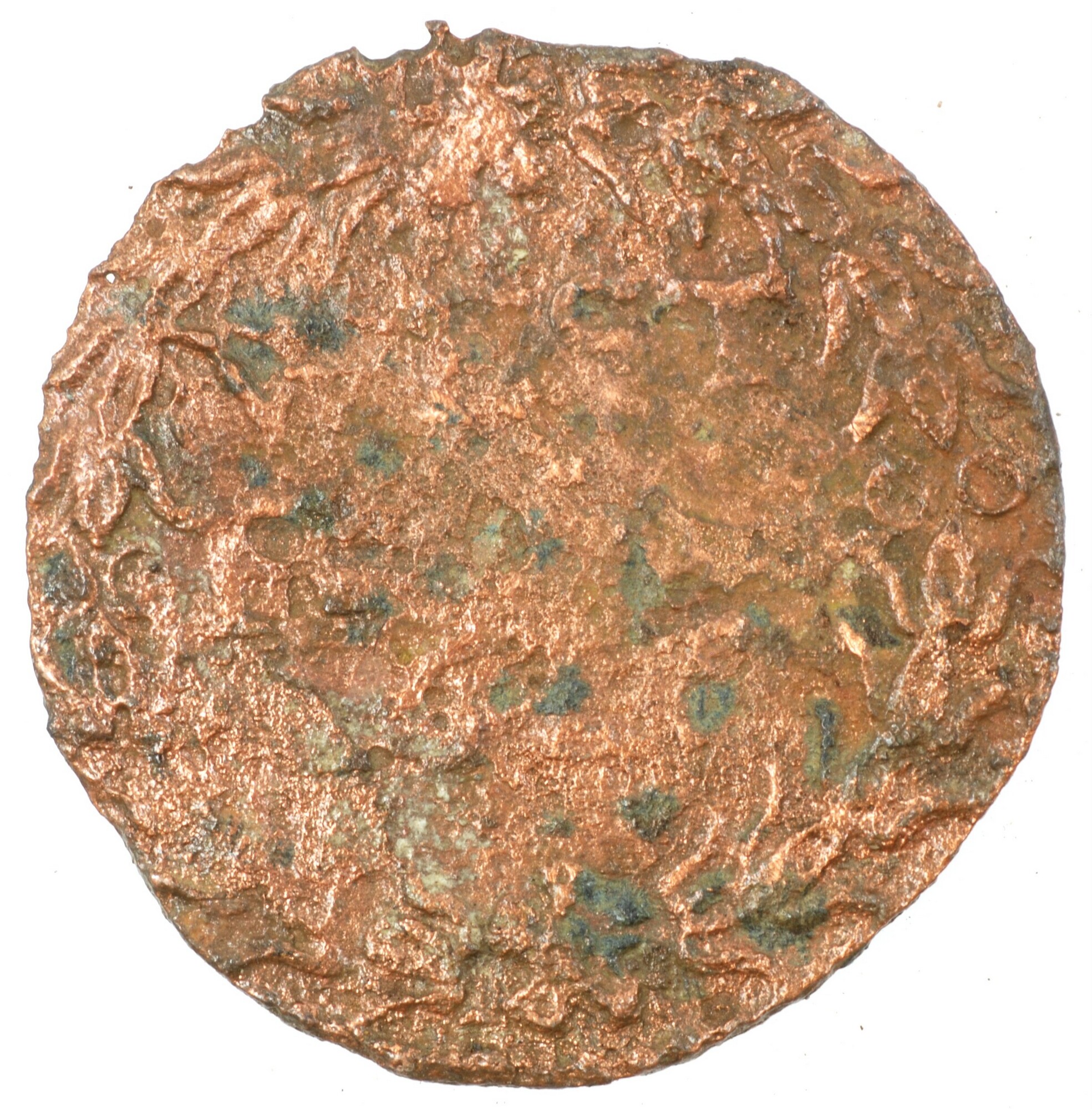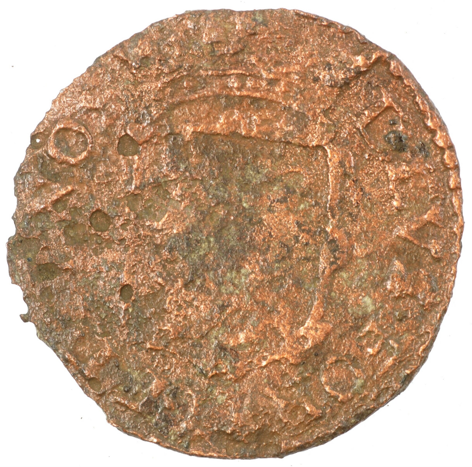Duit West-Friesland; vz.: een tulpkrans met daarin de tekst WEST FRISIAE in twee regels, daaronder het jaartal 16 (??); kz.: gekroond wapenschild met het wapen van West-Friesland, de leeuwen hebben hun kop 'en face' gericht, randtekst: DEVS. FORTI. ET. SP. NOS. Dit is voluit: Deus fortitudo et spes nostra, en betekent: God is onze kracht ...