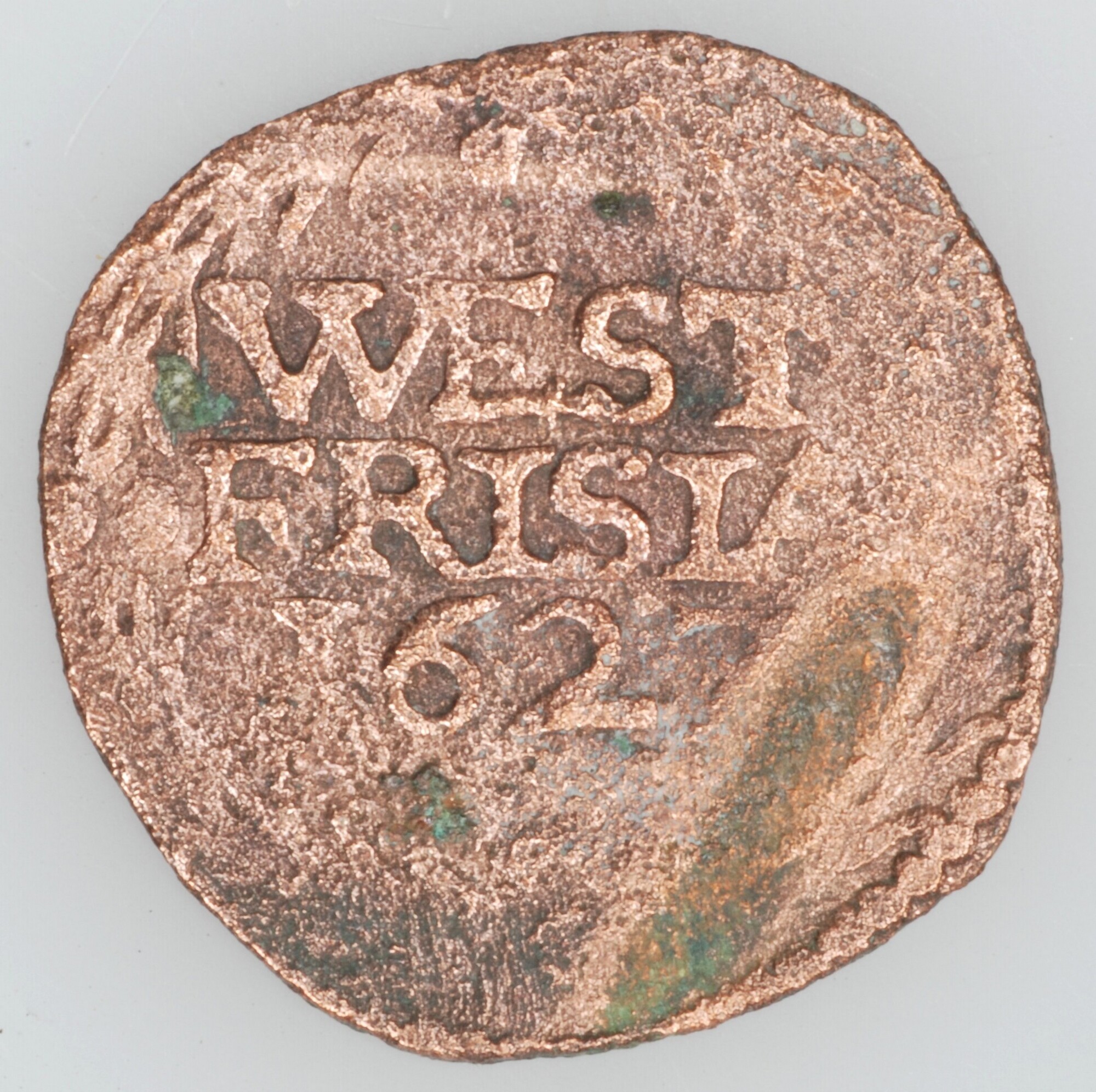 Duit West-Frisia; vz.: Een tulpkrans met daarin de tekst WEST FRISIAE in twee regels, daaronder het jaartal 1627; kz.: Gekroond wapenschild met het wapen van West-Friesland. De leeuwen hebben hun kop 'en face' gericht met het omschrift DEVS. FORTI. ET. SP. NOS (God is onze kracht en hoop); gewicht: 2.05 gram