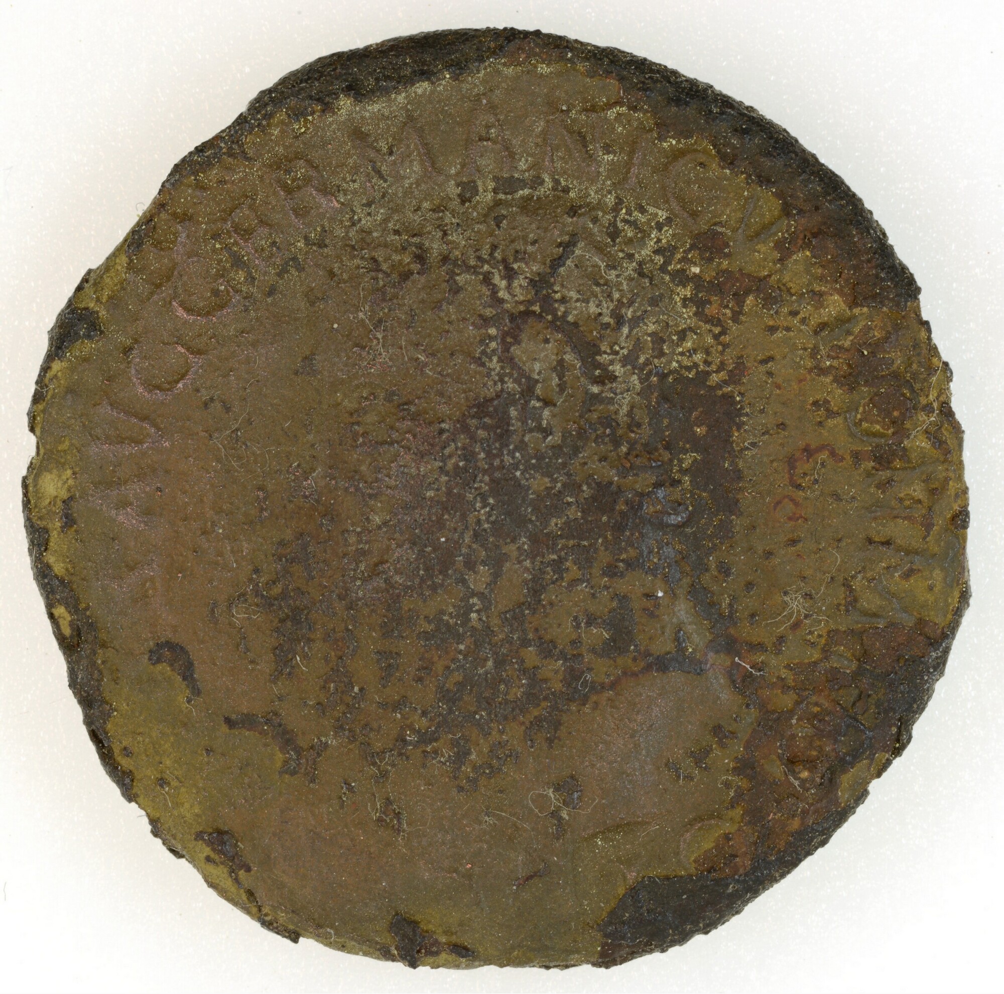 As Caligua; vz.: kop naar links met het omschrift C CAESAR AVG GERMANICVS PON M TR POT; kz.: godin Vesta zittend naar links met aan de linkerkant van Vesta de letter S en aan de rechterzijde de letter C en het omschrift VESTA; een deel van het omschrift is onduidelijk; gewicht: 9.25 gram