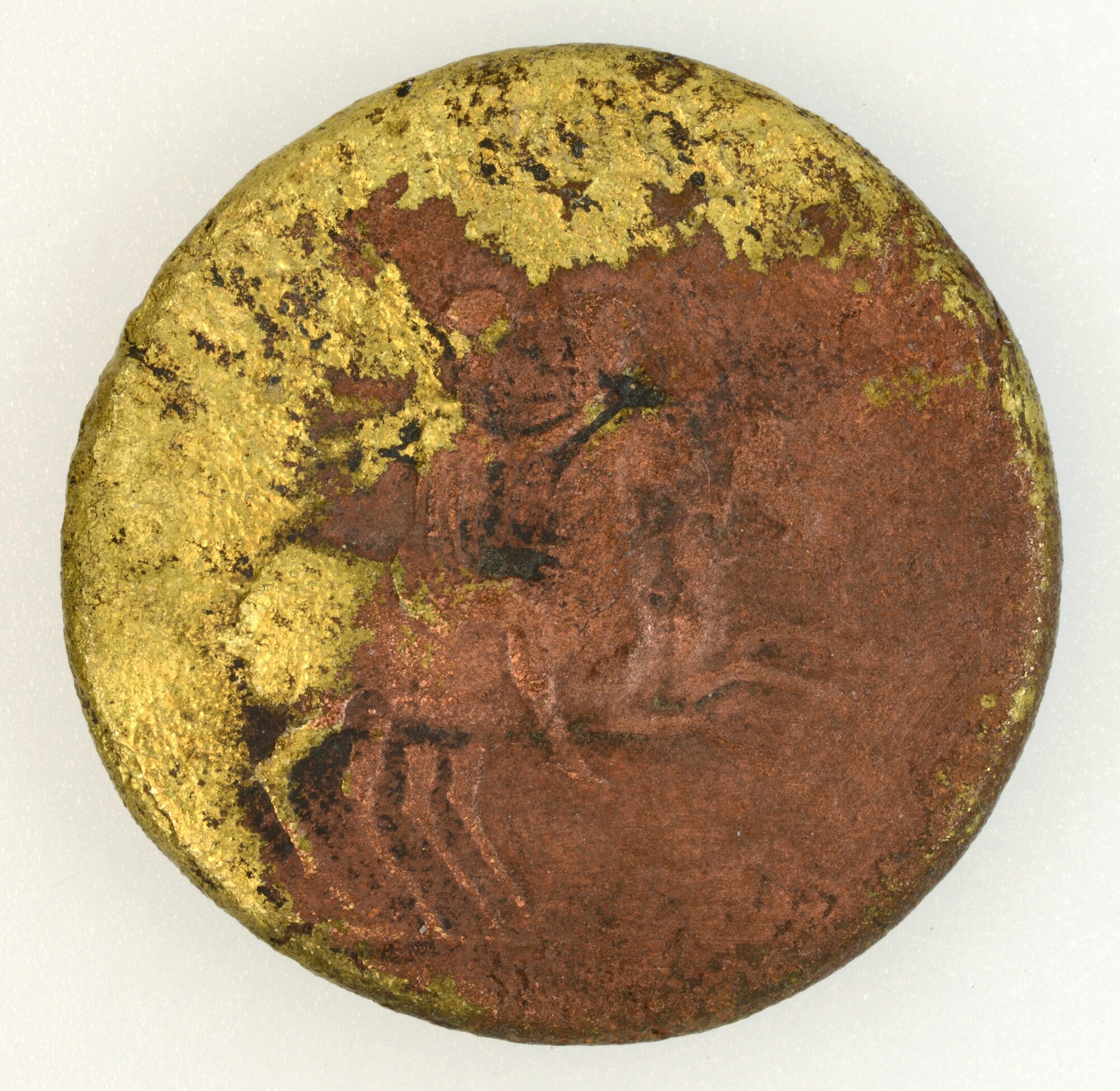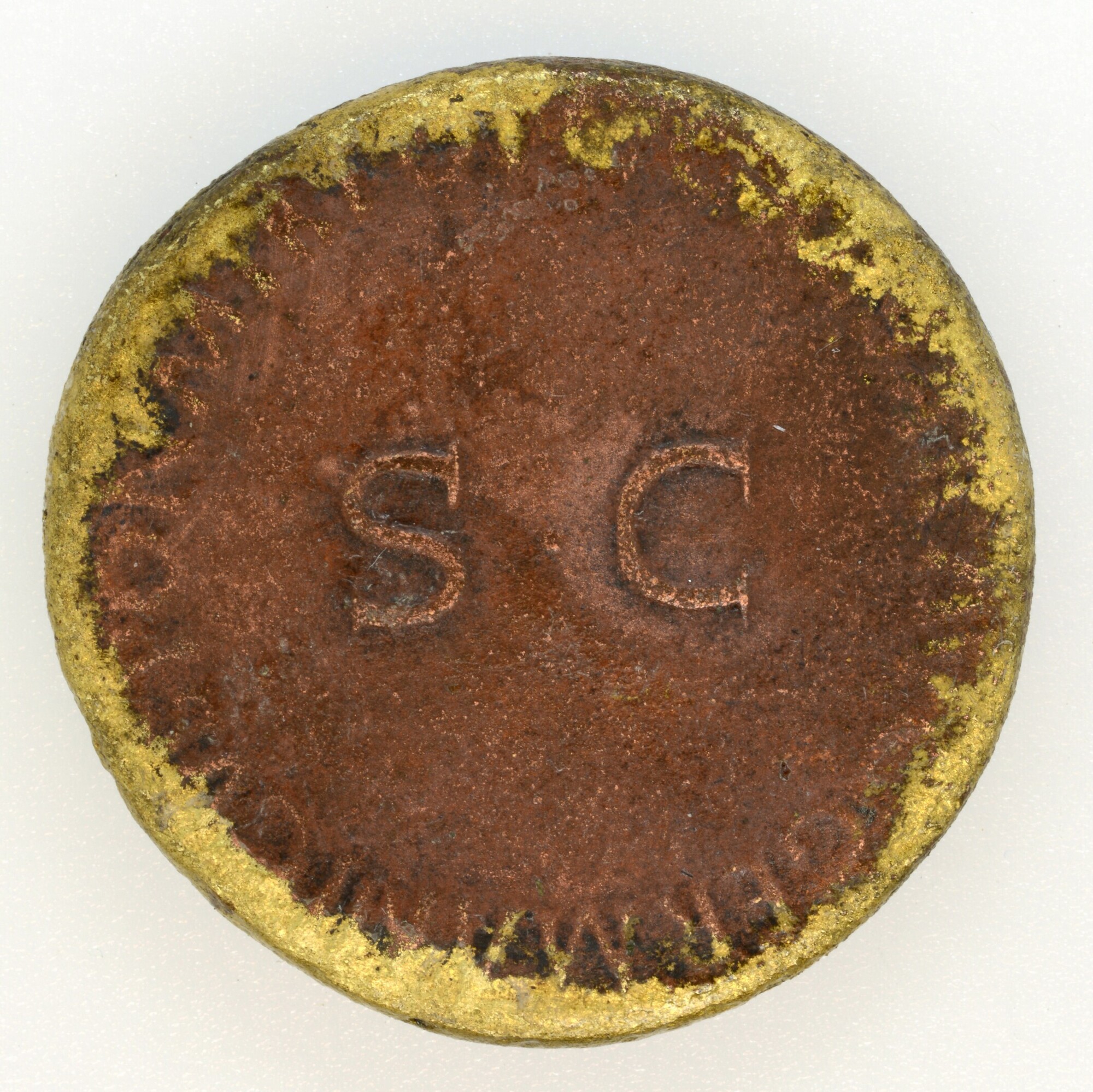 Dupondius Caligua; RIC2 34/BMC 44 vz.: de broers op 2 paarden naar rechts met omschrift NERO ET DRVSVS CAESARES; kz.: in het midden de letters SC en het omschrift C.CAESAR.AVG.GERMANICVS.PON.M.TR.POT; het oppervlak is meer gesleten waardoor het omschrift aan beide zijden minder duidelijk is; gewicht: 12.39 gram