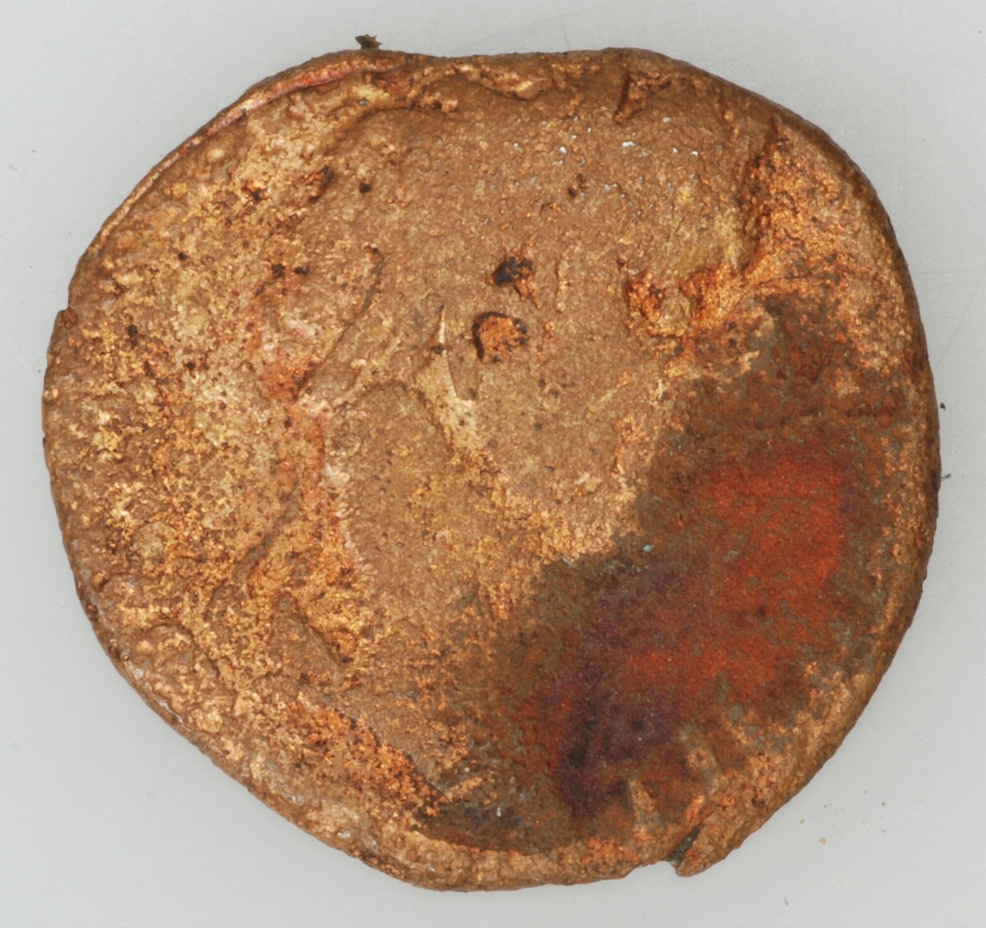 As Tiberius; imitatiemunt van RIC2 81/BMC 146; vz.: kop van Augustus naar rechts met randschrift [DIVVS AVGVSTVS PA]TER; kz.: altaar met randschrift [S]C, [PRO]VIDEN[T]. Het lijkt erop alsof een te klein muntplaatje is gebruikt, waardoor een deel van de tekst aan beide zijden mist. De randen kunnen zijn afgeknipt om koper te vergaren. Mogelijk een ...