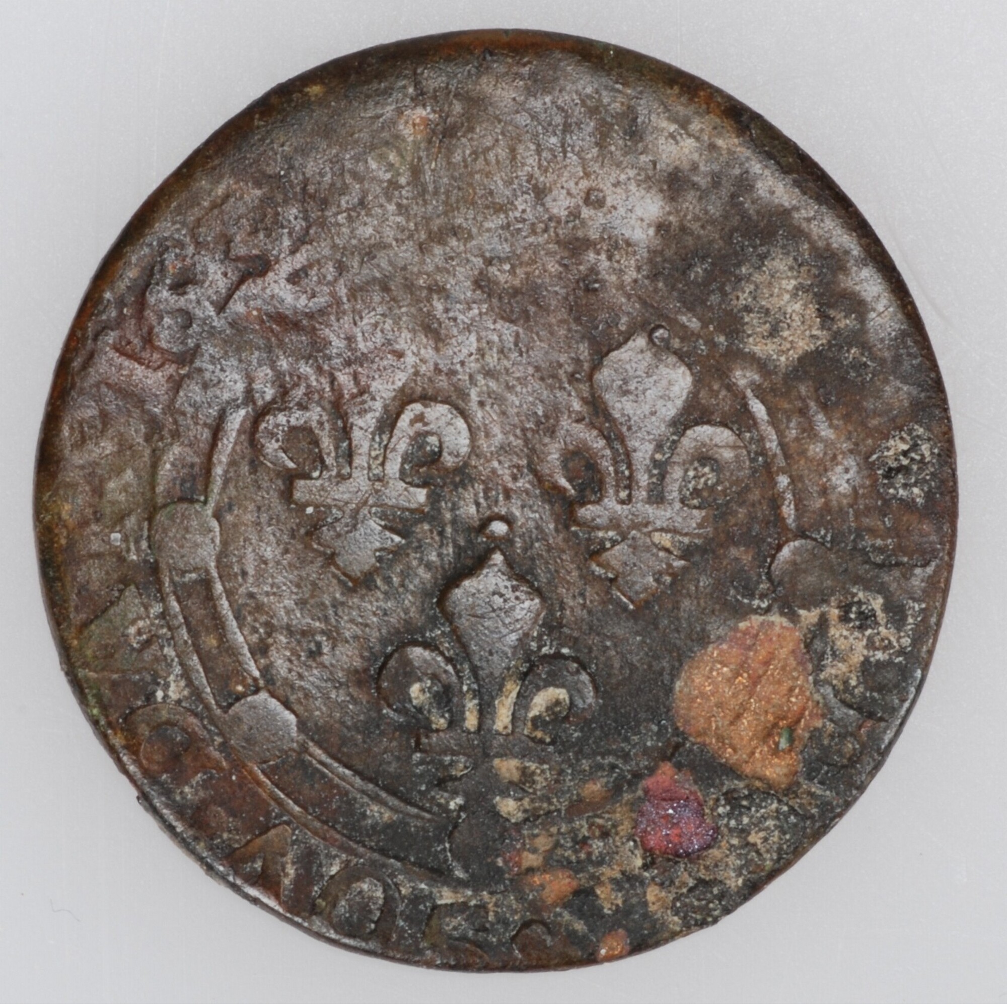 Double Tournois, Gaston d'Orleans; vz.: buste van Gaston d'Orleans kijkend naar rechts, tekst: +GASTON VSV D LA SOV DOM G; kz.: 3 lelies met daarboven een barensteel, tekst: DOVBLE TOVRNOIS 1635; gewicht: 2.18 gram; 05-10-2010; stortvondst.