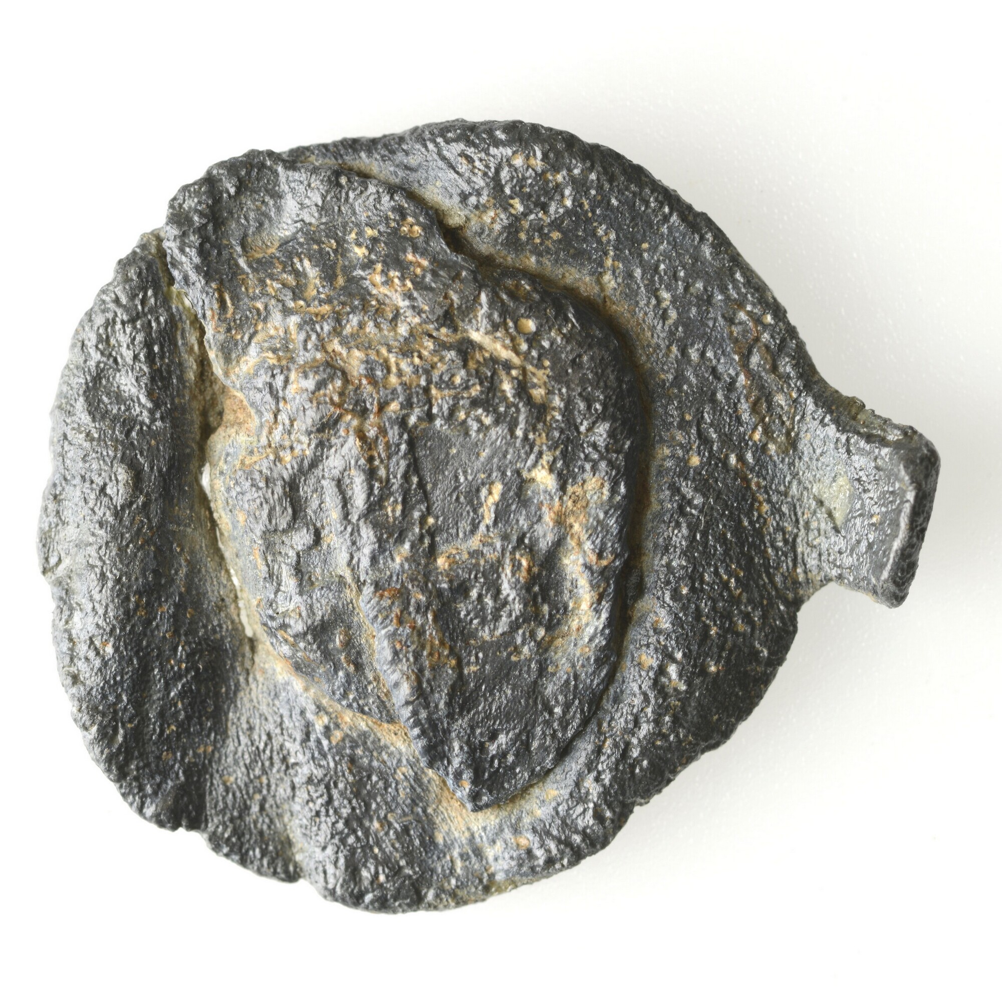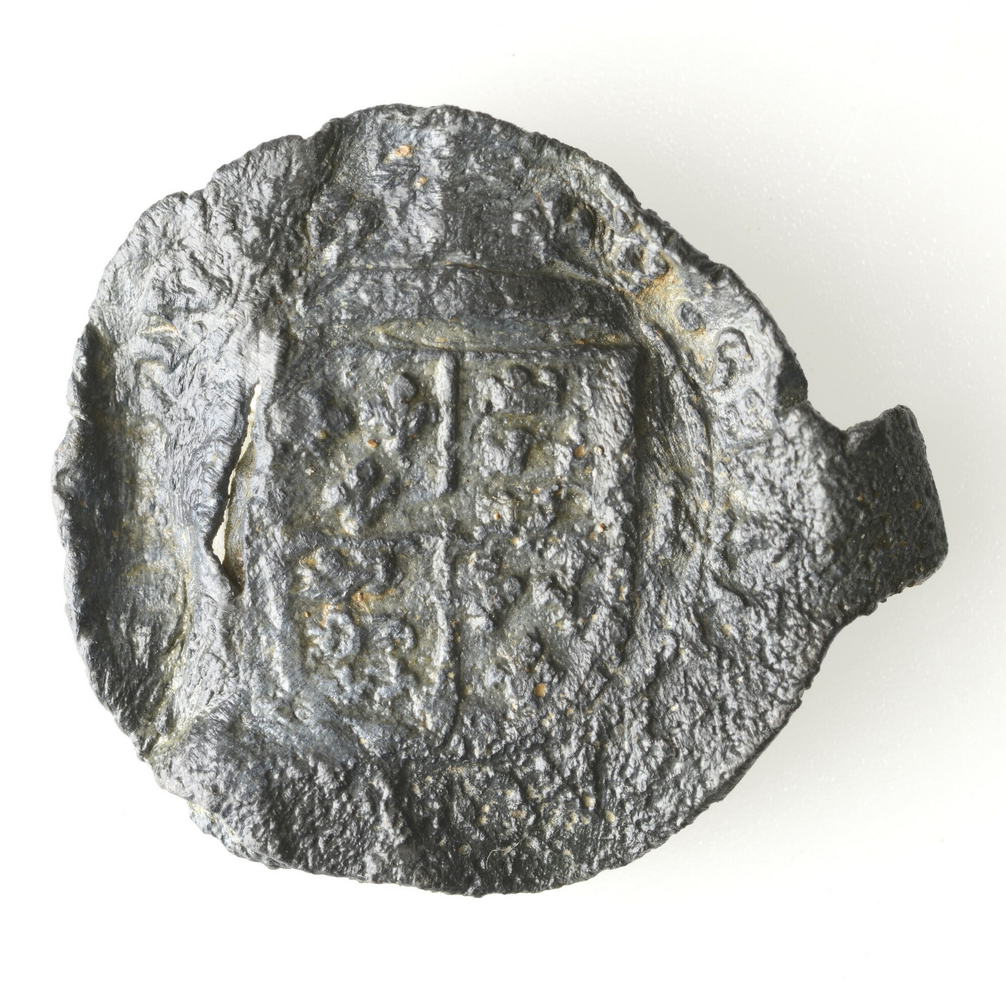 Textiellood; pb-tex; vz.: gevierendeeld wapenschild met in het eerst en vierde kwartier drie Franse lelies en in het tweede en derde kwartier drie liggende leeuwen met rondom een onleesbare randtekst; kz.: ontbreekt; herkomst: Engeland