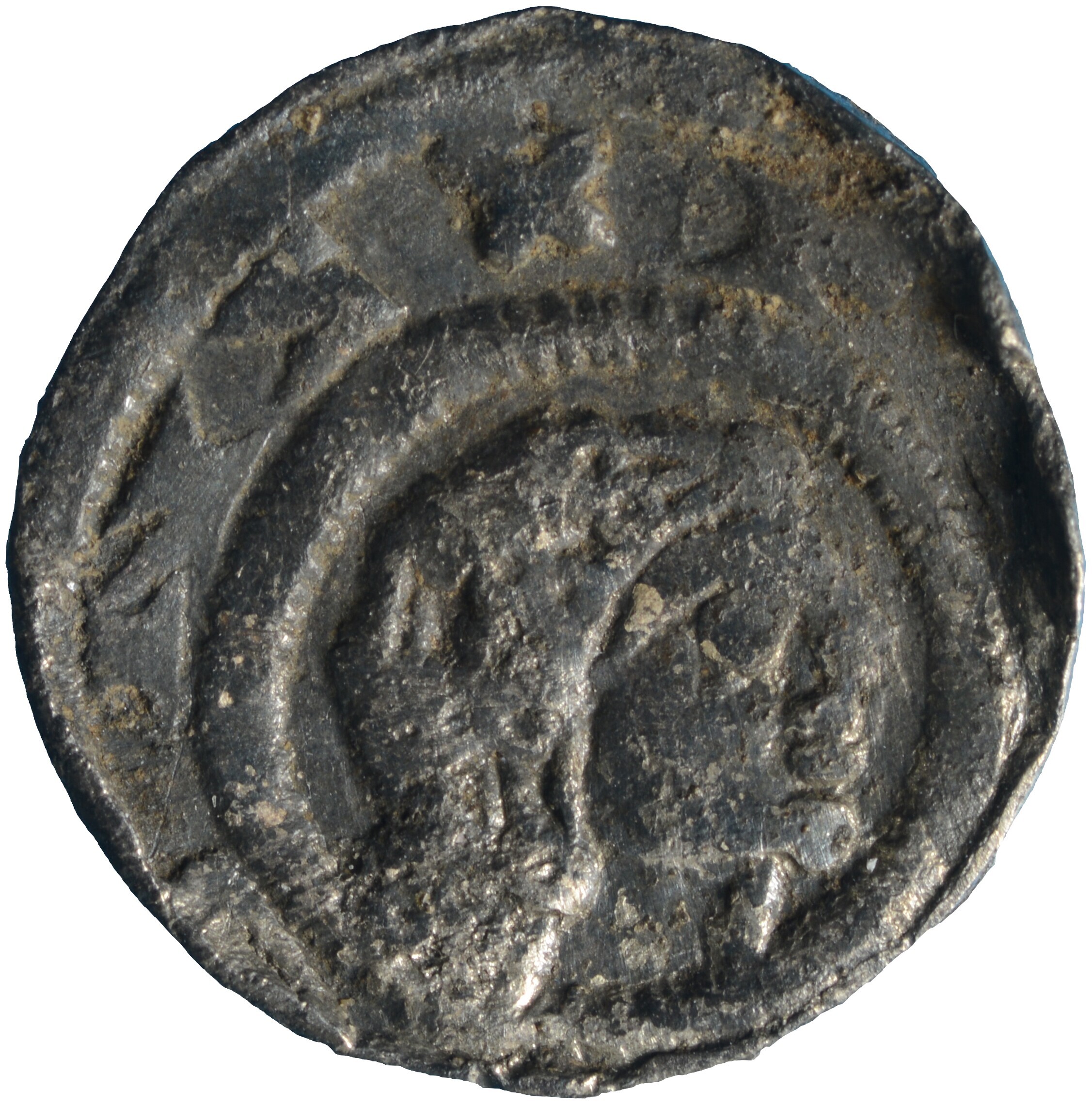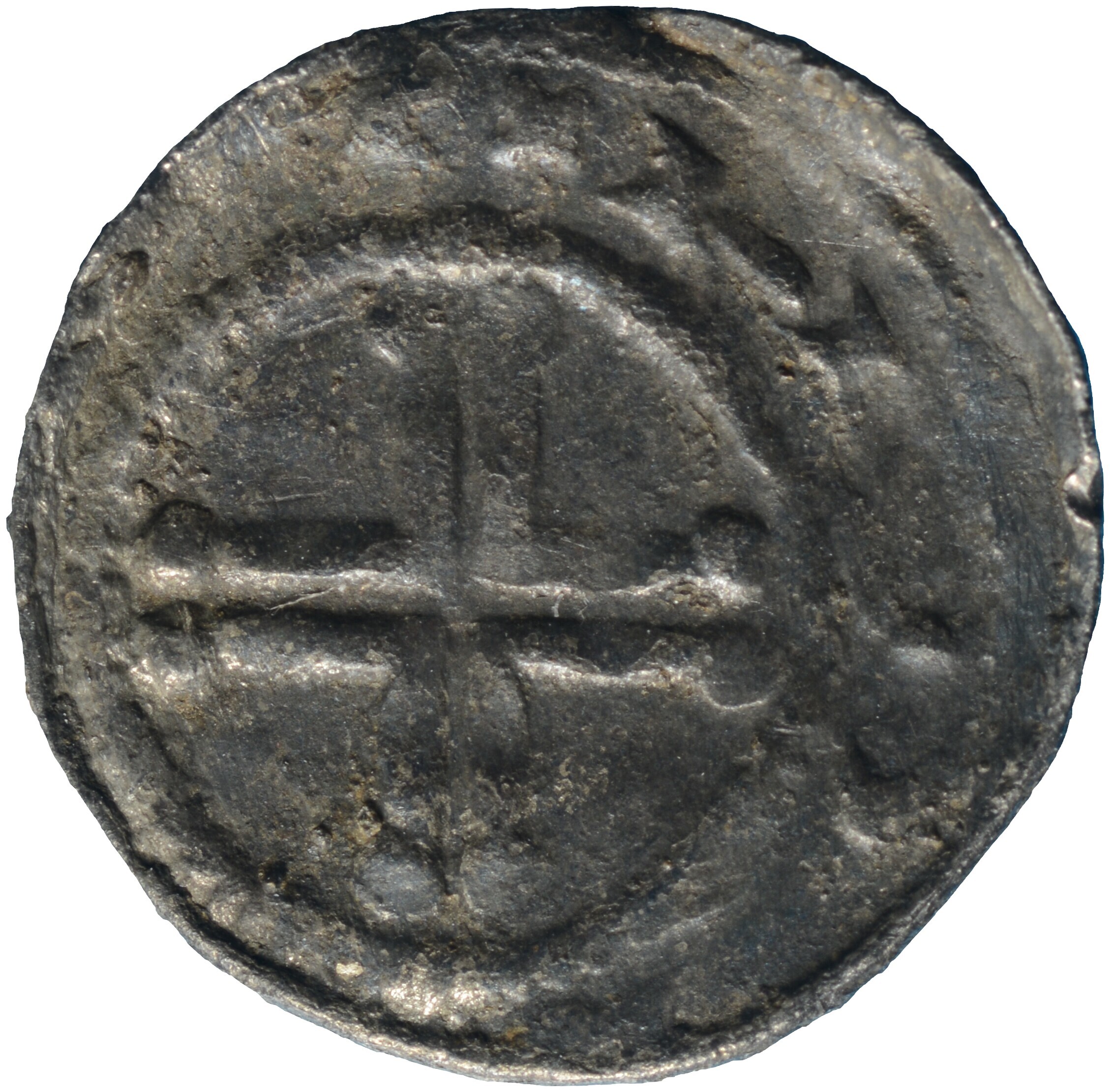 Penning; Holland Graafschap (1049-1581); Floris IV / Willem II (1222-1235-1256); vz.: hoofd met gravenmuts naar rechts binnen parelcirkel, met omschrift xF[LORE]NS; kz.: kort dubbellijnig kruis met puntvorming uiteinde binnen parelcirkel, met omschrift xH[OLLAN]T; muntplaats: Dordrecht?; gewicht: 0.59 gram; referentie: Grolle 9.1a of 10.1.1, Hengel (1986) C15A, Hengel (1998) C15