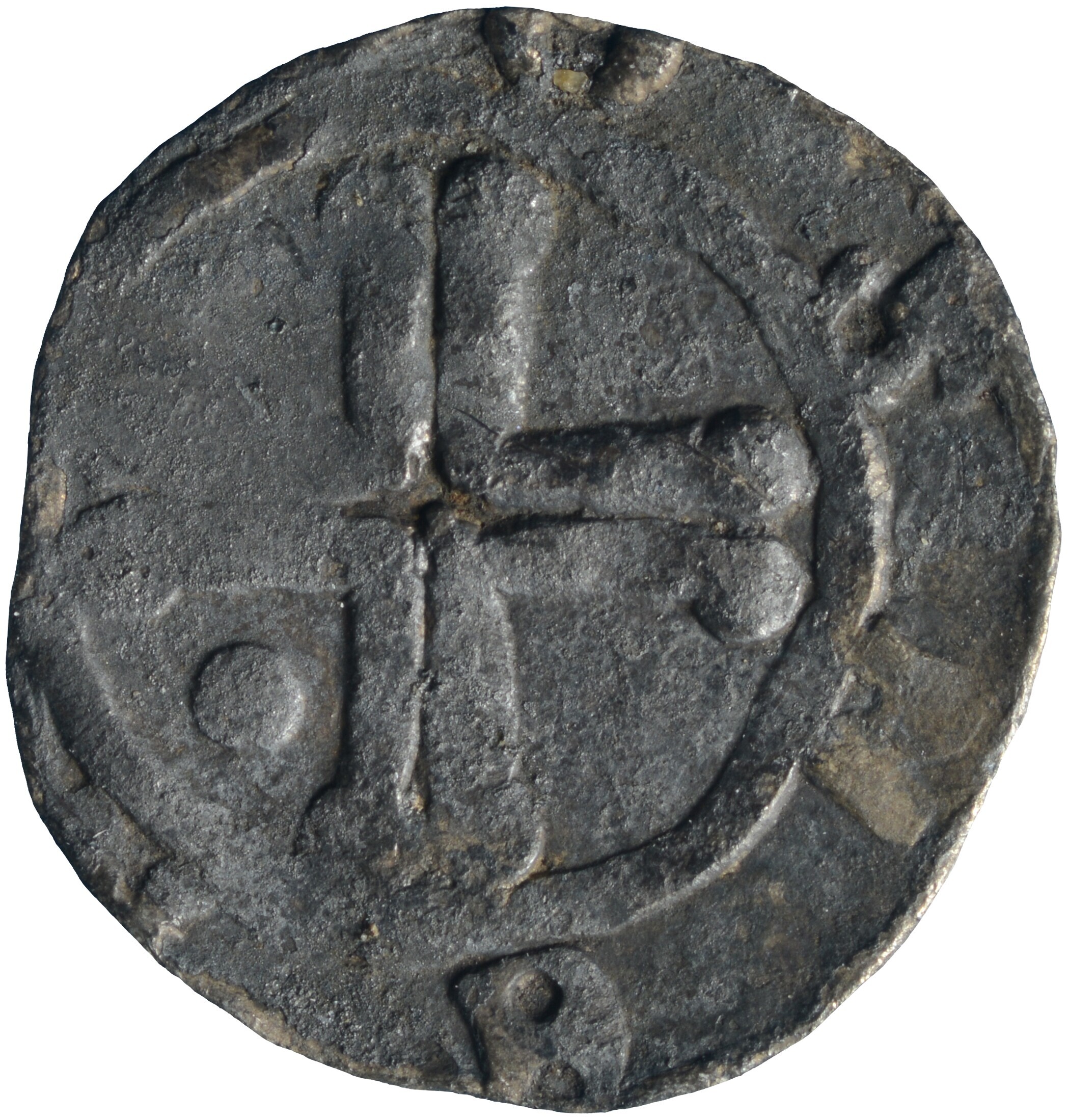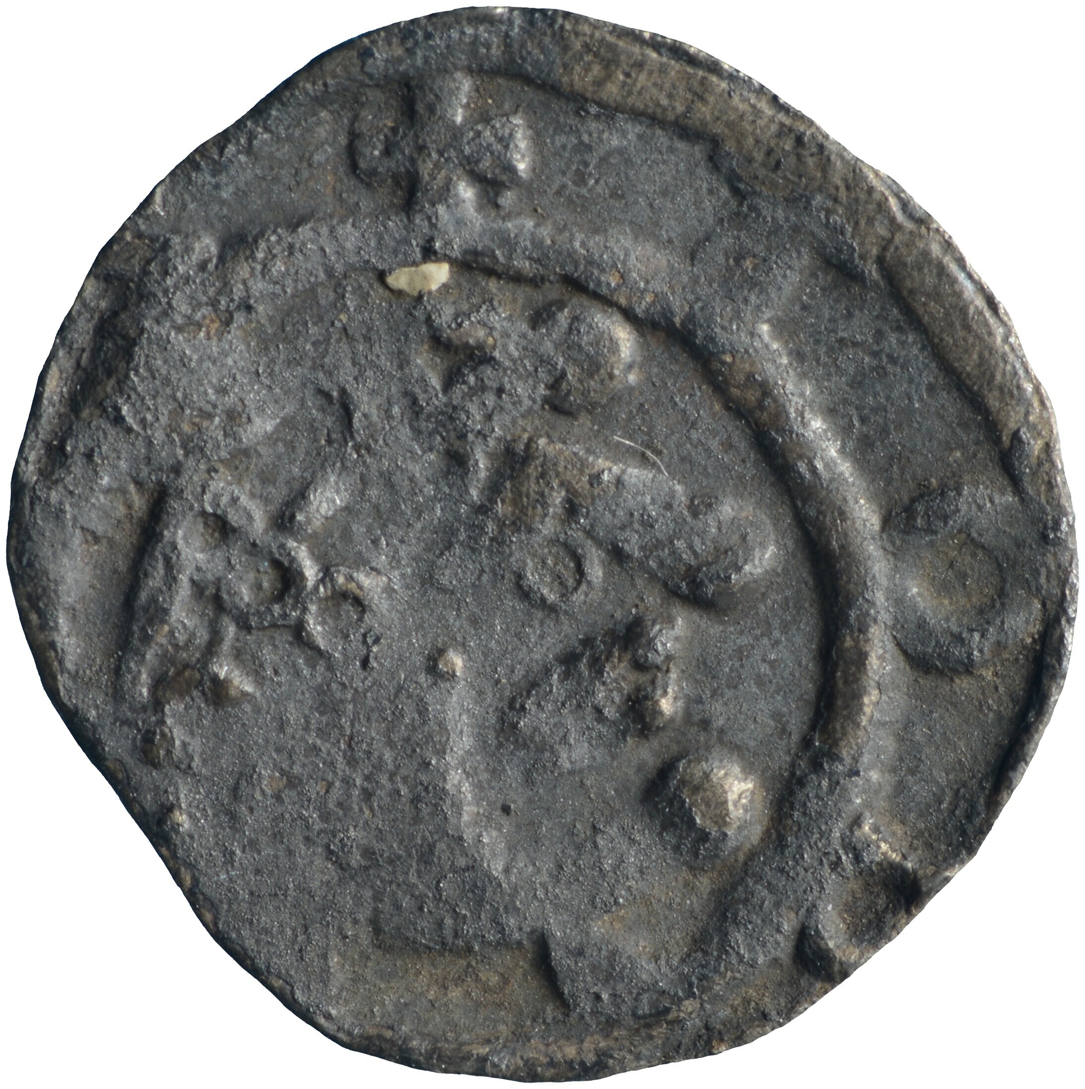 Penning; Duitsland; Kleef Graafschap (1020-1417); Dirk VI (1202-1260); vz.: hoofd met gravenmuts naar rechts binnen parelcirkel, met omschrift xTOD[ERID]S; kz.: kort dubbellijnig kruis met puntvorming uiteinde met in één van de kwadranten een punt binnen parelcirkel, met omschrift [+N]OSNE[N]; muntplaats: Huissen; gewicht: 0.48 gram; referentie: Hengel: 13.1A