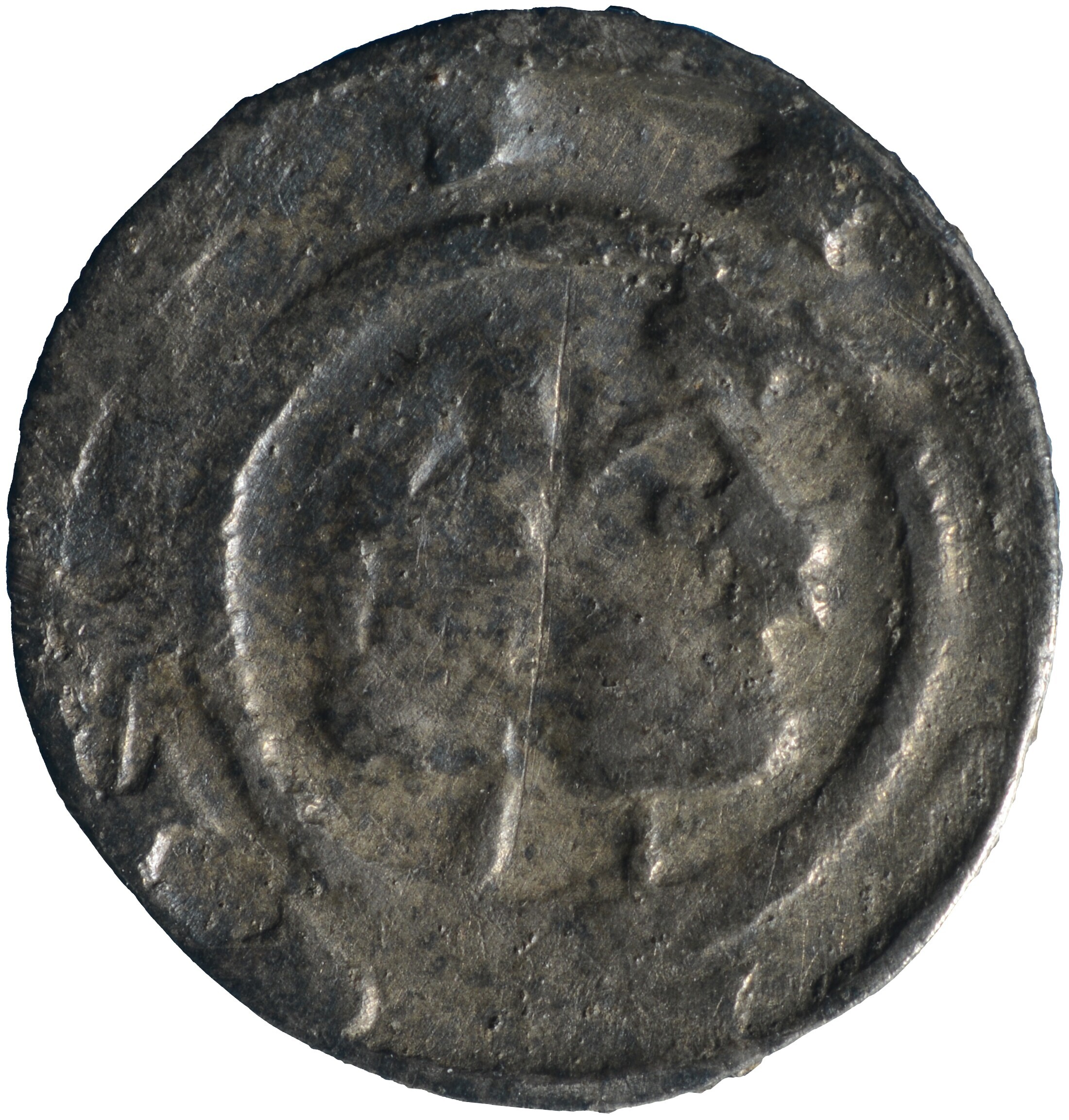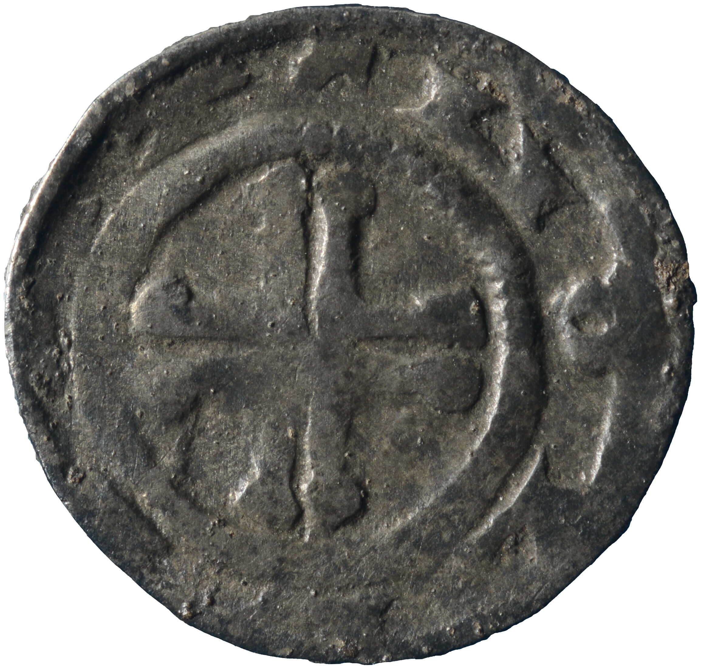 Penning; Holland Graafschap (1049-1581); Floris IV / Willem II (1222-1235-1256); vz.: hoofd met gravenmuts naar rechts binnen parelcirkel, met omschrift x[FLORE]N[S]; kz.: kort dubbellijnig kruis met puntvorming uiteinde binnen parelcirkel, met omschrift xHOL[LAN]T; muntplaats: Dordrecht?; gewicht: 0.60 gram; referentie: Grolle 9.1a of 10.1.1, Hengel (1986) C15A, Hengel (1998) C15
