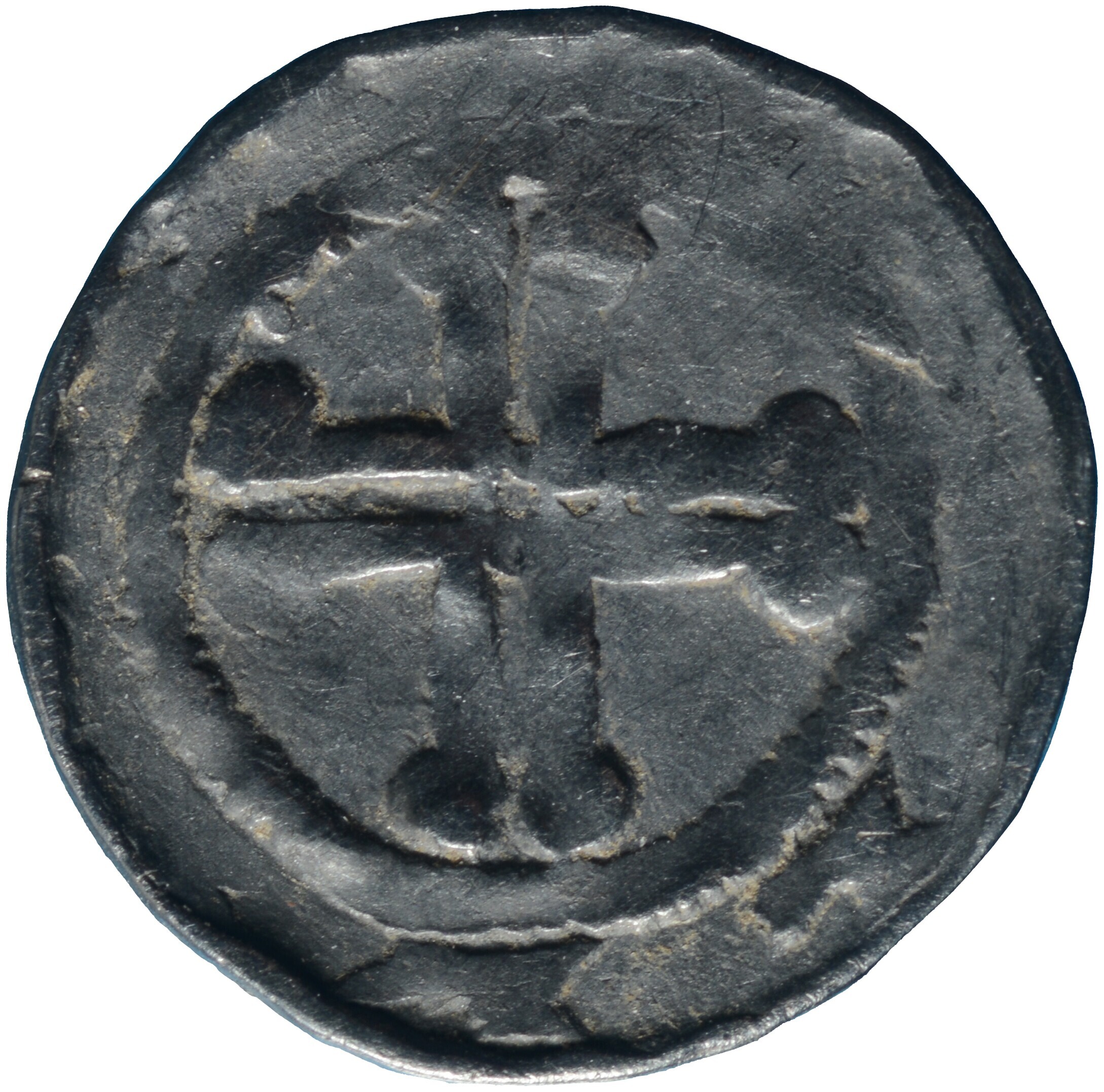 Penning; Holland Graafschap (1049-1581); Floris IV / Willem II (1222-1235-1256); vz.: hoofd met gravenmuts naar rechts binnen parelcirkel, met omschrift [xFLOR]EN[S]; kz.: kort dubbellijnig kruis met puntvorming uiteinde binnen parelcirkel, met omschrift [xHO]LL[ANT]; muntplaats: Dordrecht?; gewicht: 0.61 gram; referentie: Grolle 9.1a of 10.1.1, Hengel (1986) C15A, Hengel (1998) C15