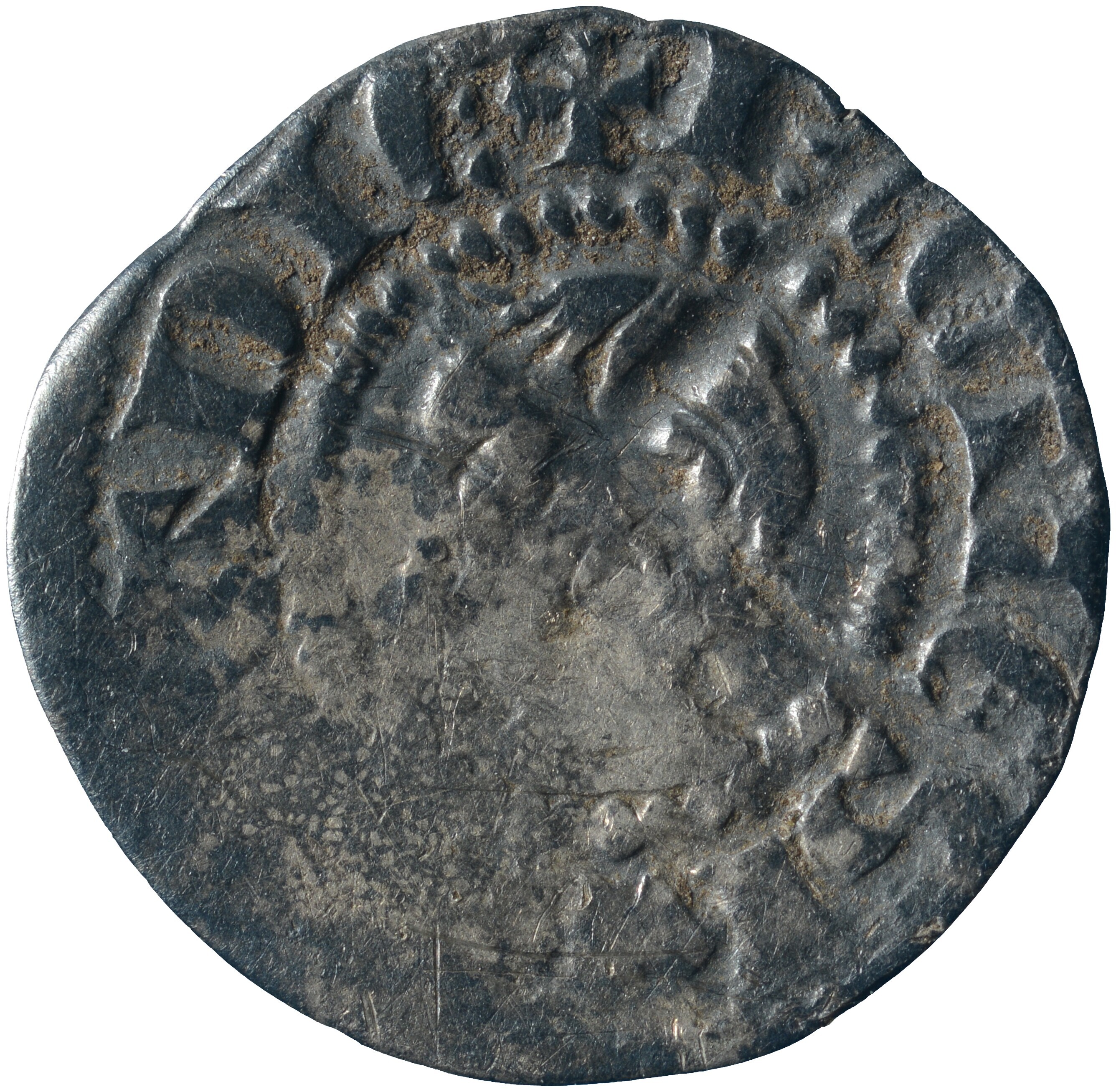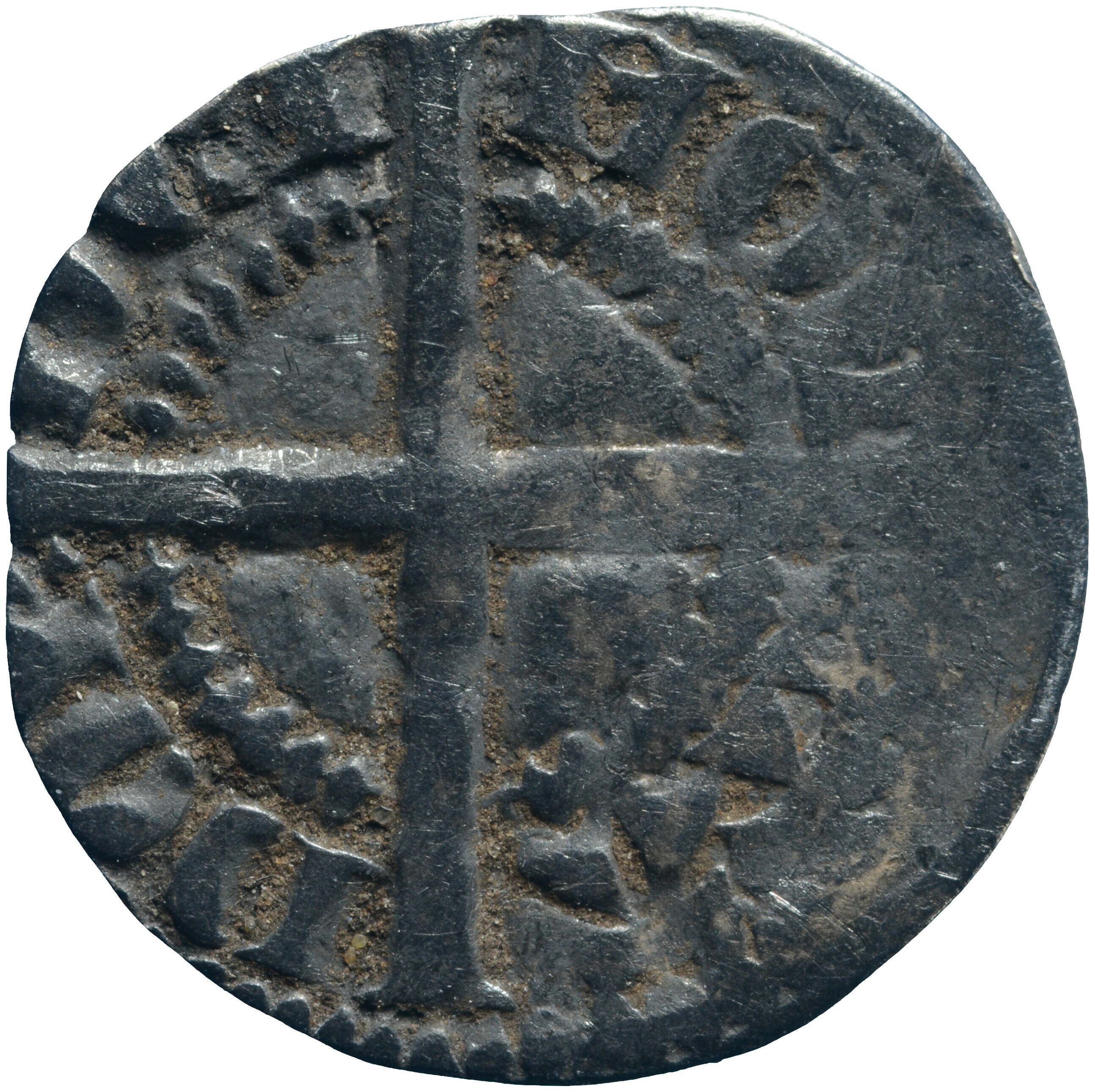 Penning; Holland Graafschap (1049-1581); Jan I (1296-1299); vz.: hoofd naar links binnen parelcirkel, met omschrift +I:COMES H[OLLA]DIE; kz.: lang gevoet kruis binnen parelcirkel, met omschrift MON / [E]TA / DOR / D’CI; muntplaats: Dordrecht; gewicht: 0.48 gram; referentie: Grolle 12.3.1a, Hengel (1986) C47-2, Hengel (1998) C47