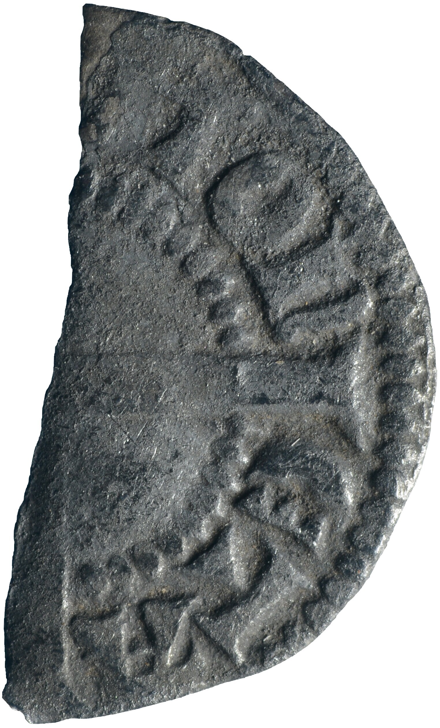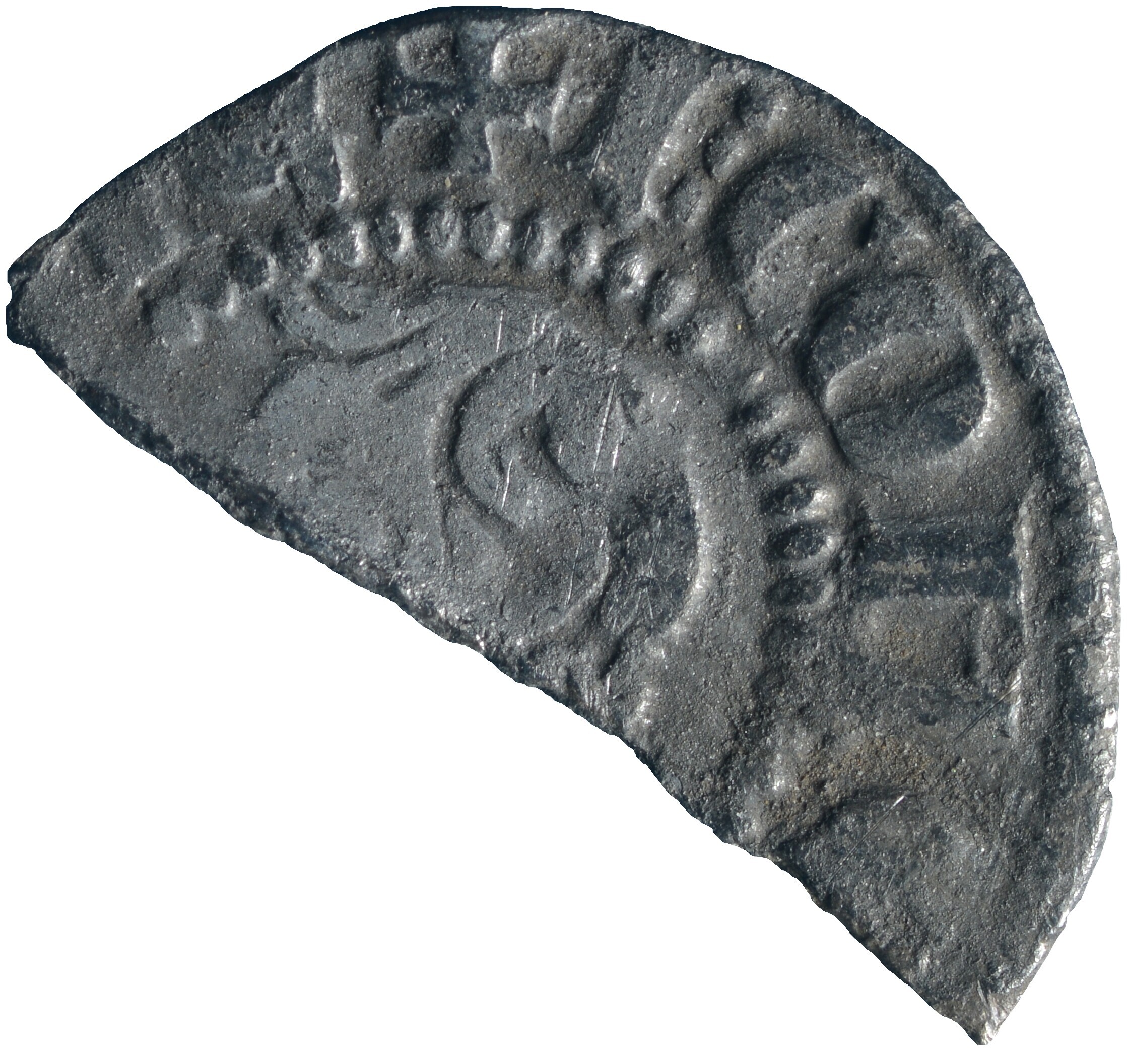 Penning; Holland Graafschap (1049-1581); Jan I (1296-1299); vz.: hoofd naar links binnen parelcirkel, met omschrift +I:COM[ES HOLLA’DI]E; kz.: lang gevoet kruis binnen parelcirkel, met omschrift MON / ETA / [DOR / D’CI]; muntplaats: Dordrecht; gewicht: 0.29 gram; referentie: Grolle 12.3.1a/b, Hengel (1986) C46 t/m C48, C46 t/m C48. Gebroken