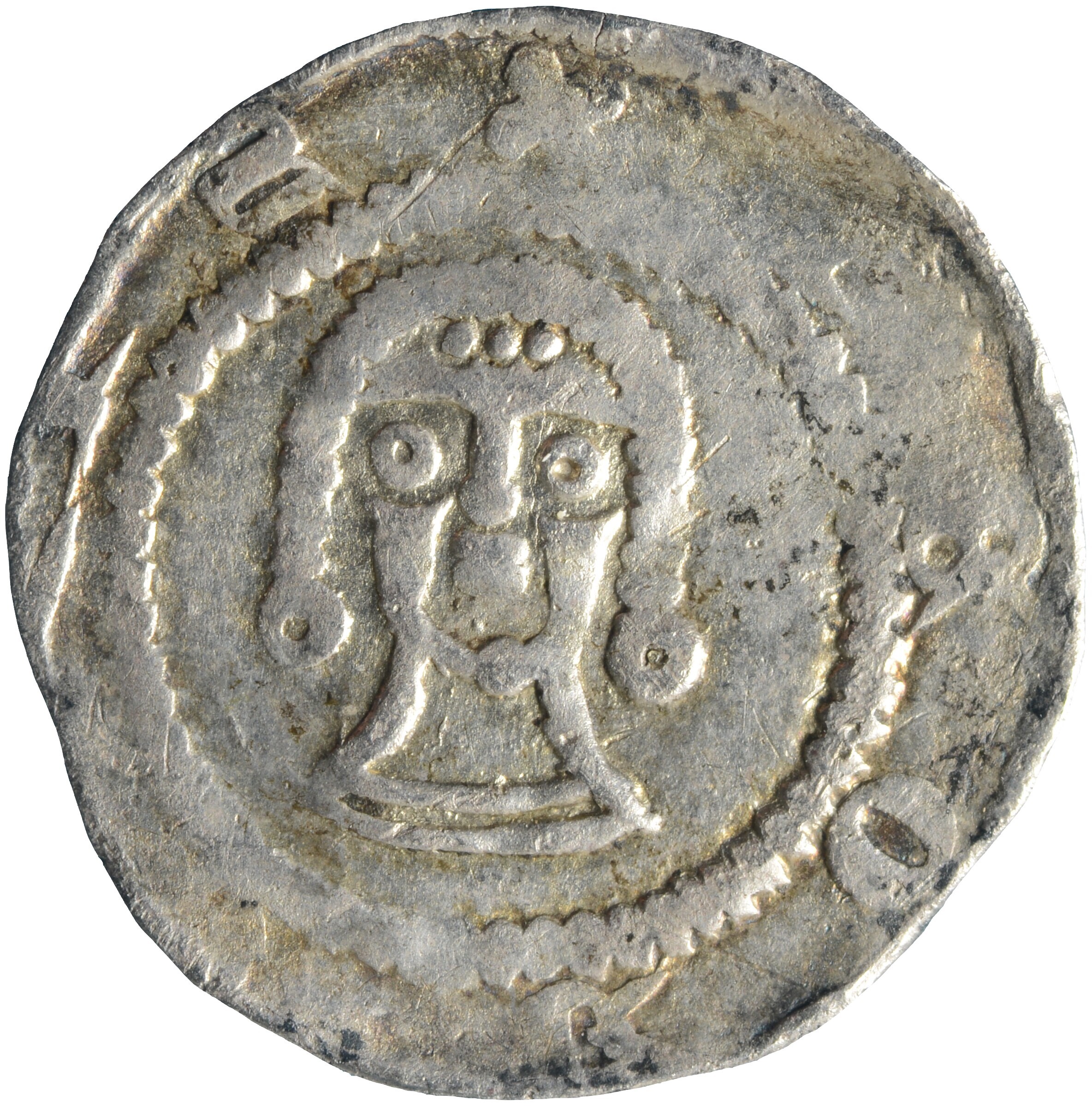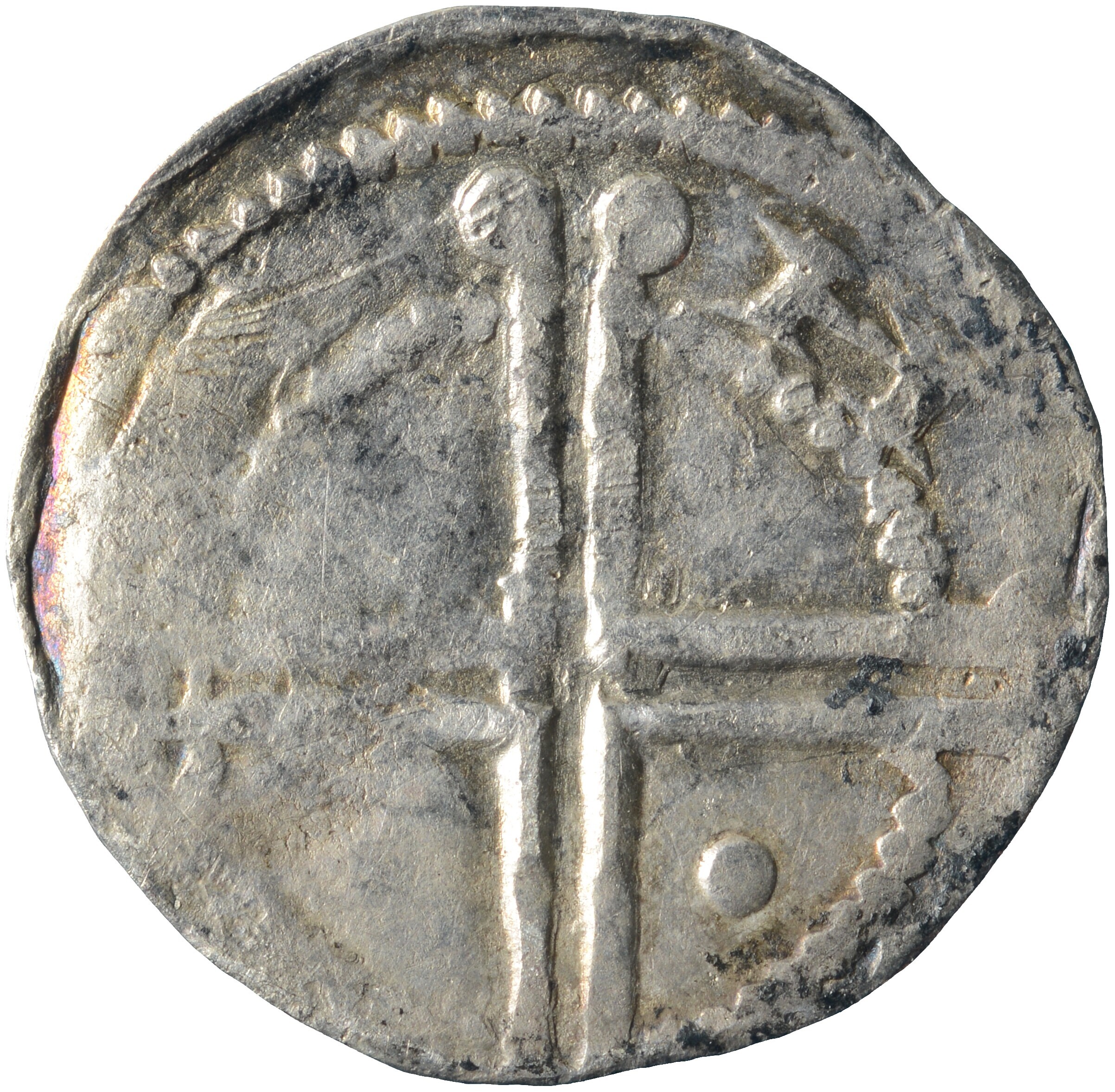 Penning; Duitsland; Kleef Graafschap (1020-1417); Dirk VI (1202-1260); vz.: aanziende buste binnen parelcirkel, met omschrift x[T]EOD[...]; kz.: lang dubbellijnig kruis met puntvorming uiteinde binnen parelcirkel met in één van de kwadranten een punt, met omschrift [../..]/H[./..]; muntplaats: Huissen; gewicht: 0.44 gram; referentie: Noss 8