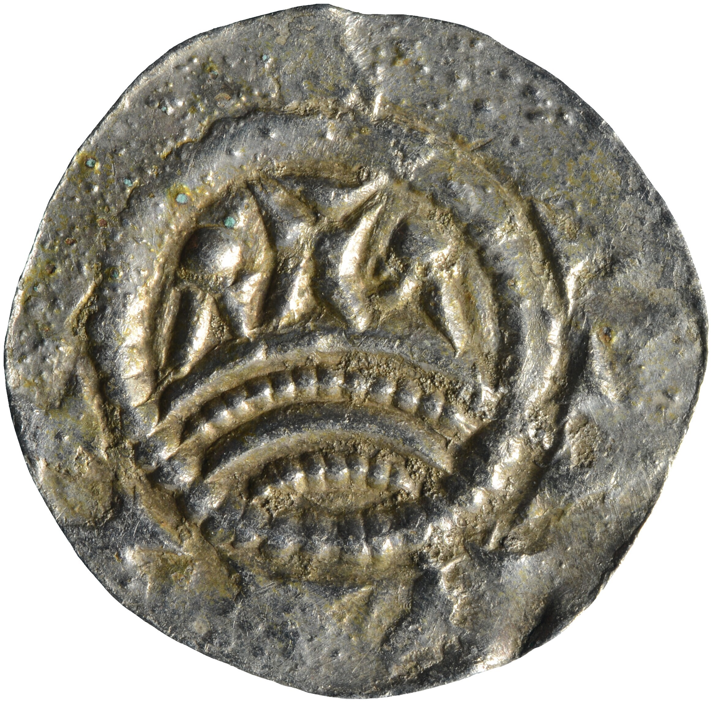 Penning; Friesland; Otto III van Zutphen (1102-1107); vz.: buste naar rechts met helm en standaard binnen parelcirkel, met omschrift: [+OD]TO - NV[I] (N retrograde); kz.: vier bogen met een kruis tussen twee torens binnen parelcirkel, met omschrift [+S]TA[...NVVS] liggend en N in retrograde); muntplaats: Stavoren?; gewicht: 0.29 gram; referentie: Ilisch 23.3, Dannenberg 1887, Scholten JMP ...