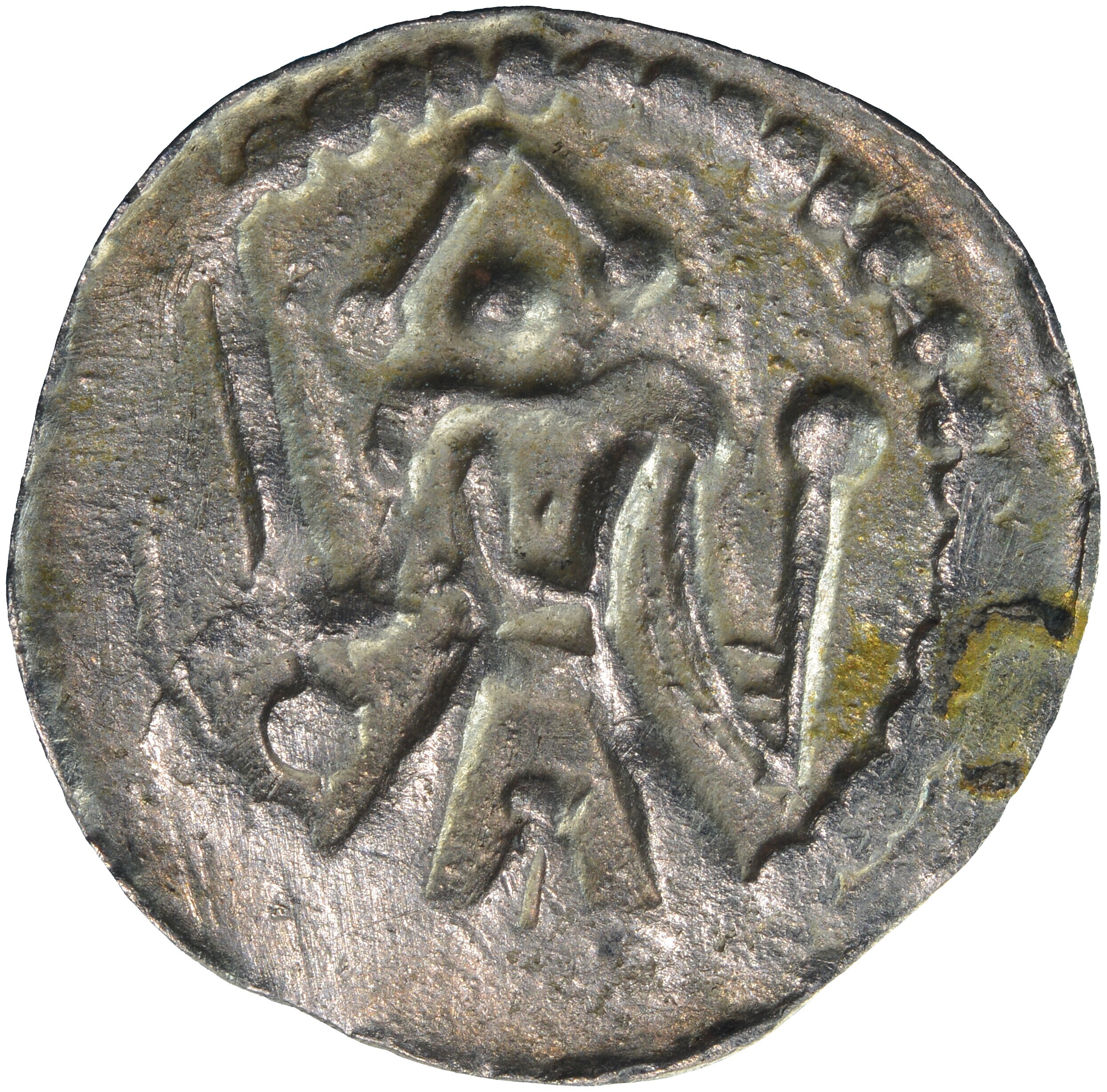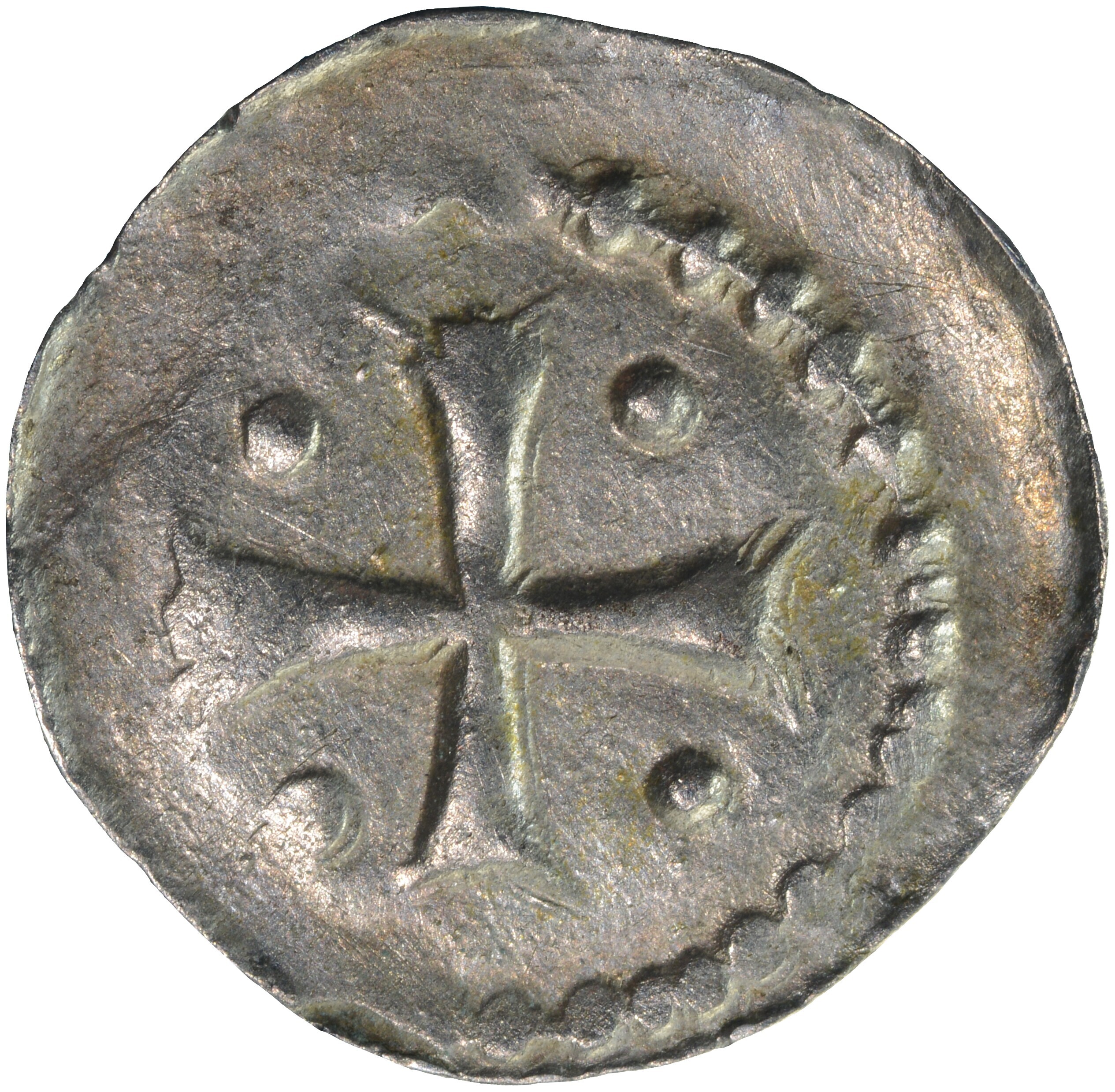 Penning; Holland Graafschap (1049-1581); Dirk VI (1121-1157); vz.: staande graaf met helm, zwaard en scepter binnen parelcirkel; kz.: kort gevorkt kruis met punten in de kwadranten binnen parelcirkel; muntplaats: onbekend; gewicht: 0.58 gram; uiterst zeldzaam; referentie: Grolle 5.2a, Hengel (1998) C0.3