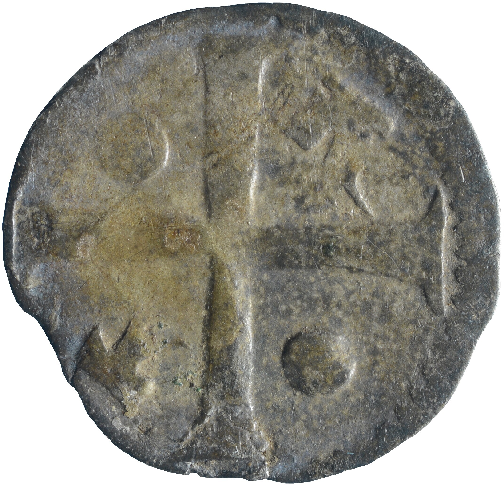 Penning; Duits Nederrijns?; 15e eeuws?; vz.: wapenschild met klimmende leeuw naar links binnen parelcirkel; kz.: kort gevoet kruis met T / • / A / • in de kwadranten binnen parelcirkel; muntplaats: onbekend; gewicht: 0.28 gram; referentie: