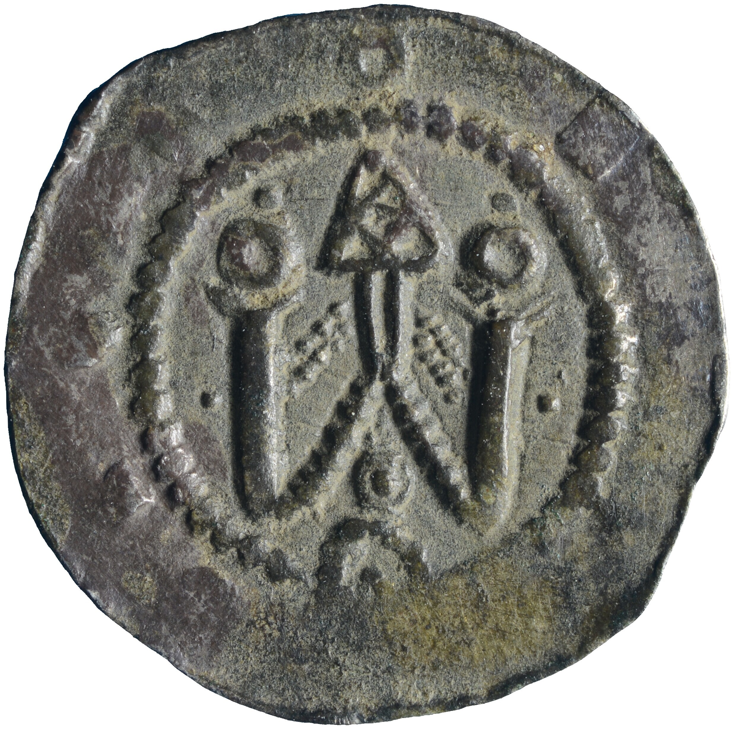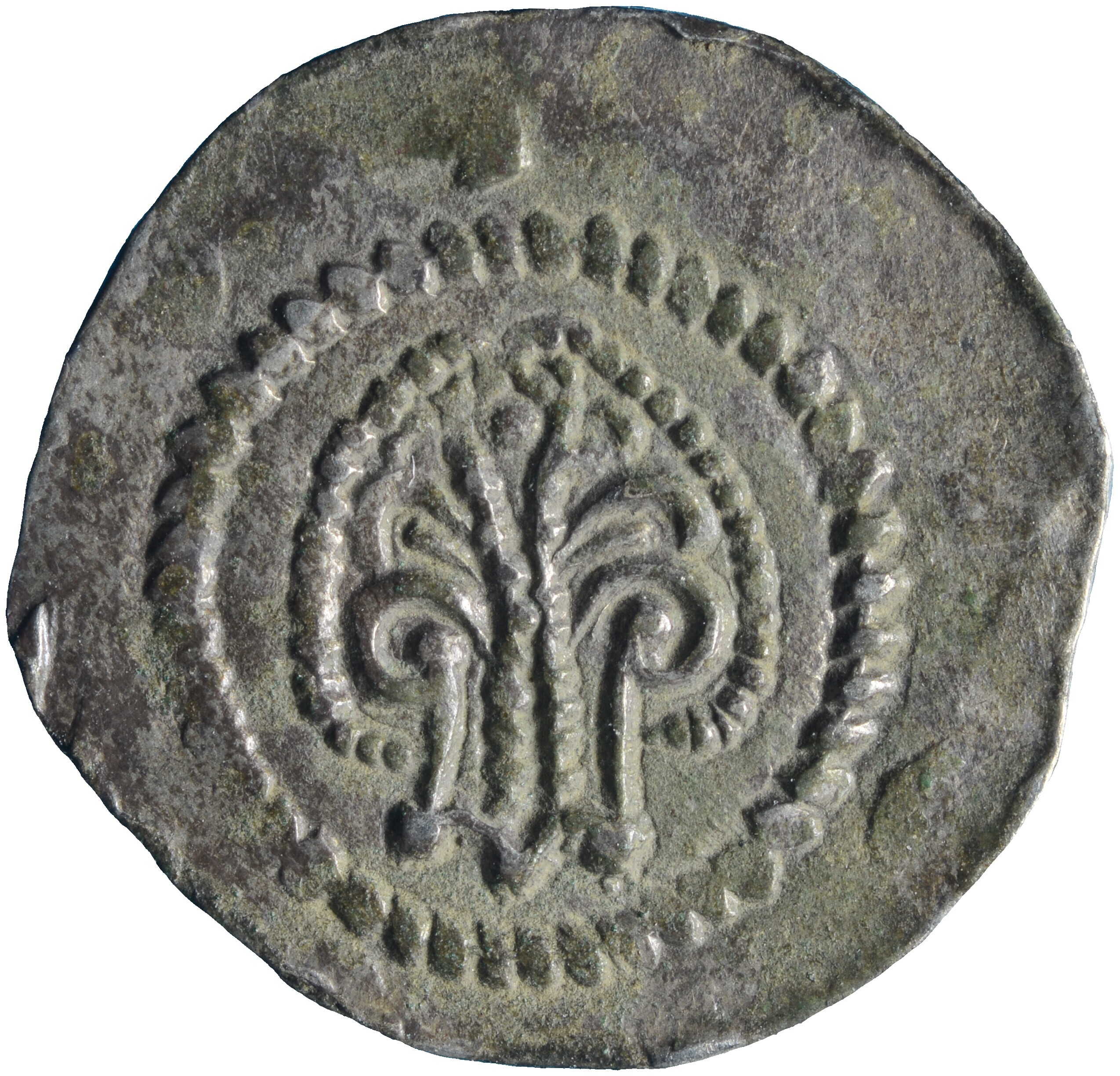 Penning; Holland Graafschap (1049-1581); Floris III (1157-1190)?; vz.: bouwwerk met drie torens binnen parelcirkel en ornamentrand; kz.: boom met wortels binnen parelcirkel en ornamentrand; muntplaats: onbekend; gewicht: 0.53 gram; uiterst zeldzaam; referentie: Hengel (1993) A7; Zeer zeldzaam. Zo’n vijf exemplaren van bekend. Enkel aan Holland toegewezen vanwege de vindplaats Egmond en Castricum
