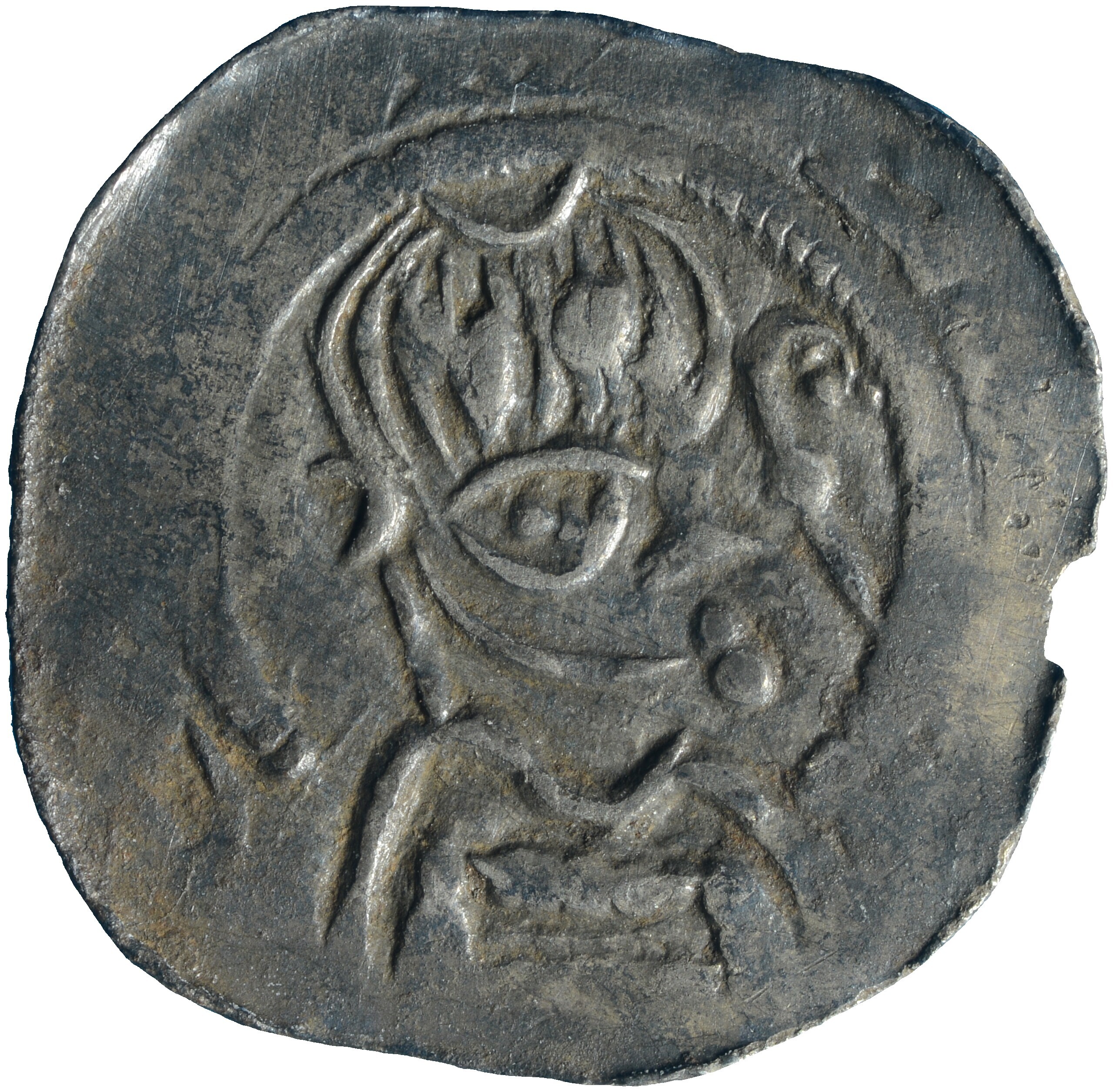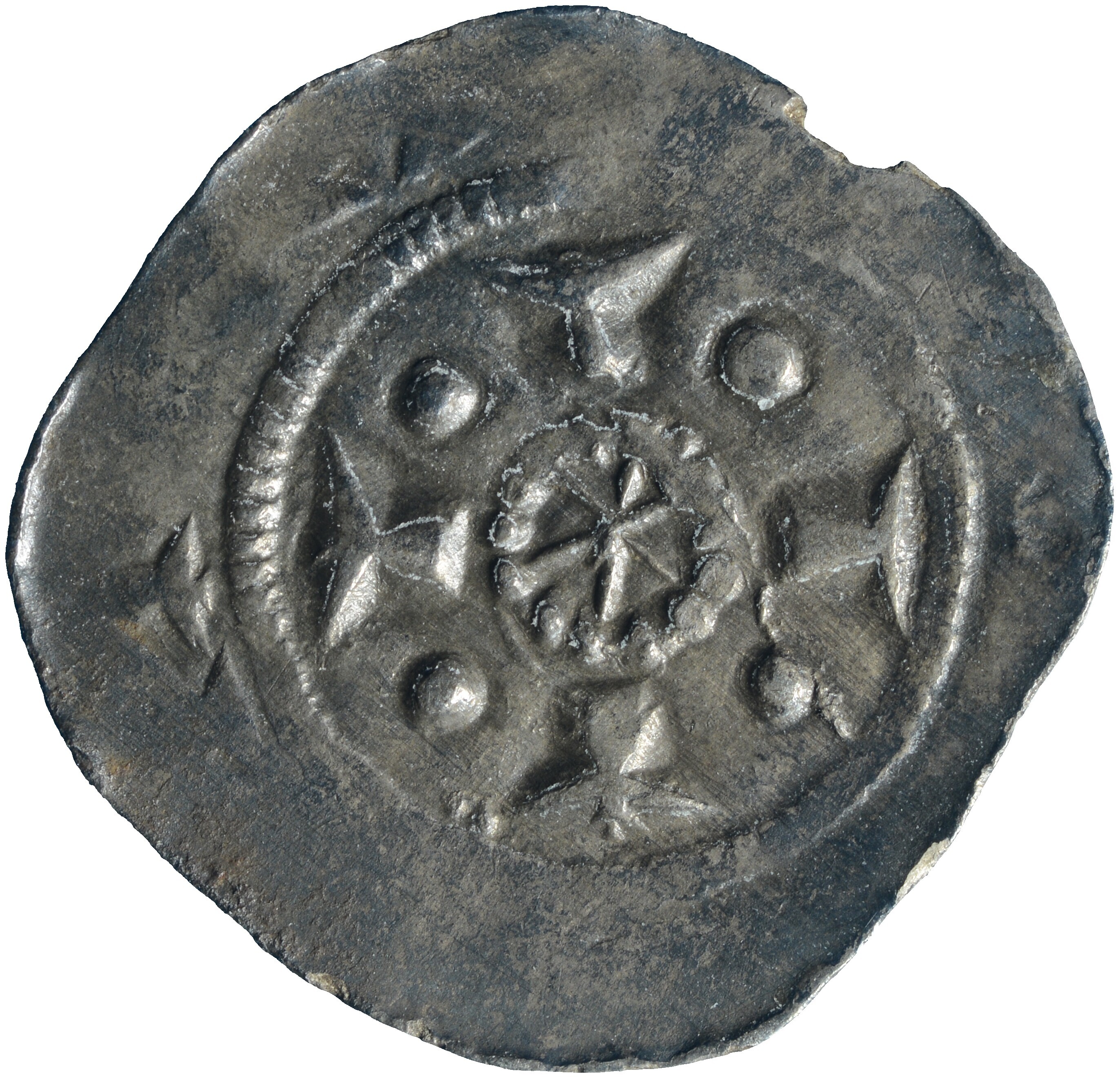 Penning; Utrecht Bisdom (1010-1528); Bisschop anoniem?; Oost-Nederland, Deventer? (ca. 1100-1150); vz.: buste met staf naar rechts, binnen parelcrikel met omschrift +[...]A[...]; kz.: kort gevoet kruis met punten in de kwadranten en ster in het hart, binnen parelcirkel met omschrift [...]MA[..]; muntplaats Deventer?; gewicht: 0.48 gram; referentie: vdChijs V.1-9 (letters omschrift kz. niet geheel overtuigend)