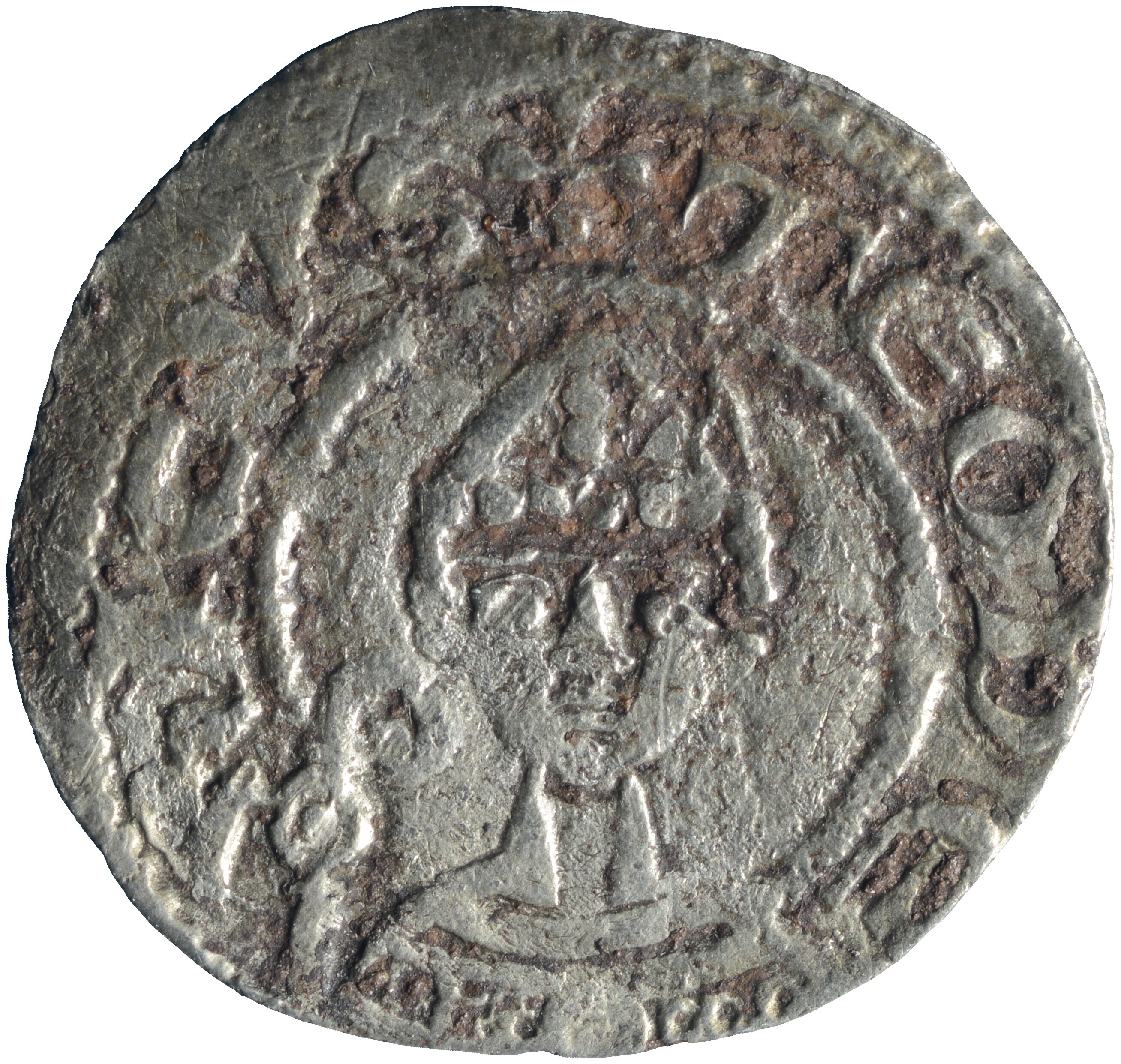 Penning; Utrecht Bisdom (1010-1528); Diederik van der Ahr (1198-1212); vz.: bisschop van voren met staf binnen parelcirkel, met omschrift +TEODE - RICVS; kz.: kort gevorkt kruis met beurtelings een ring met punt en drietandvorming voorwerp in de kwadranten binnen parelcirkel, met omschrift [+]TRAIECT[VM]; muntplaats: Utrecht; gewicht: 0.38 gram; referentie: vdChijs VI.2-5
