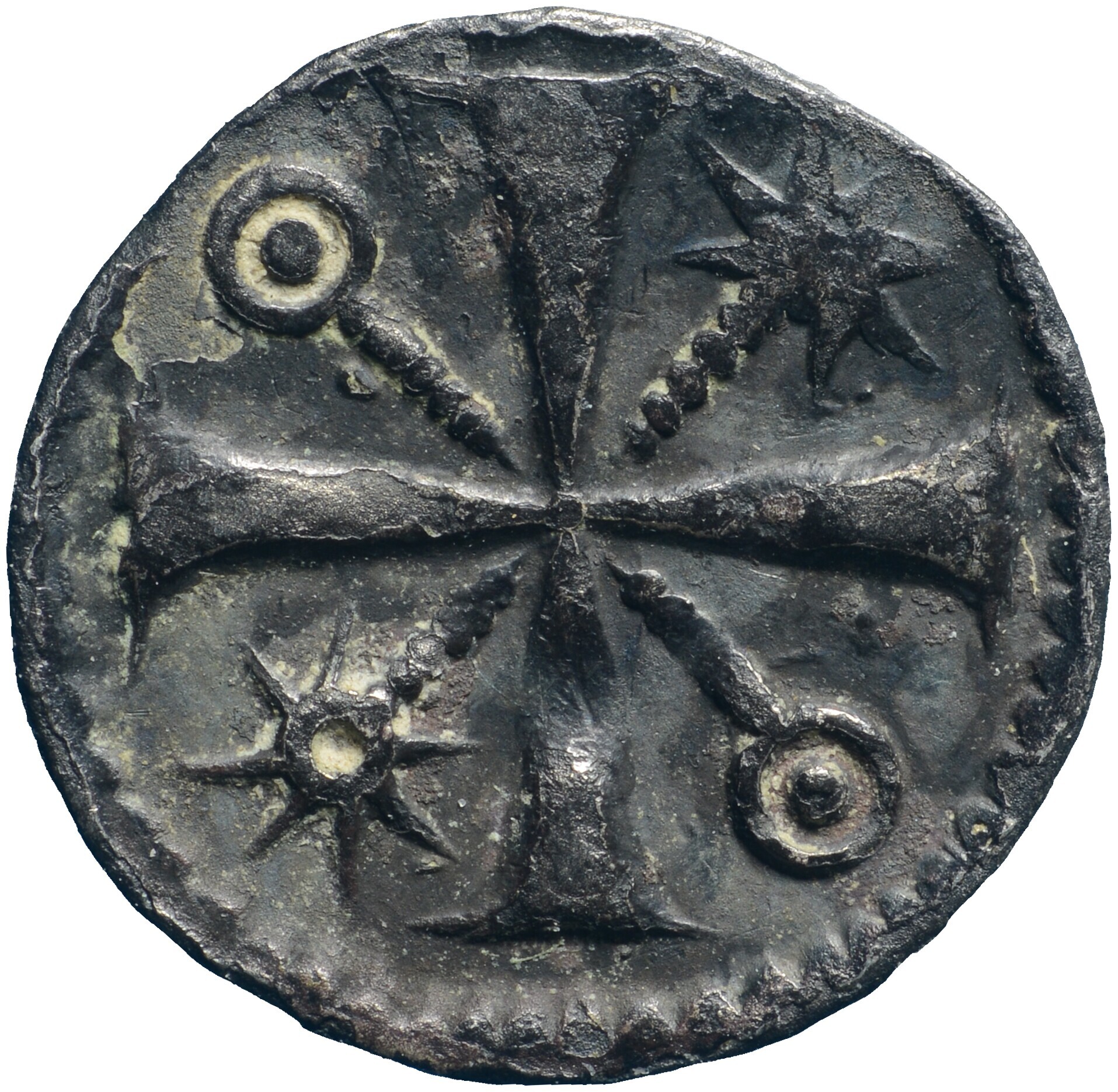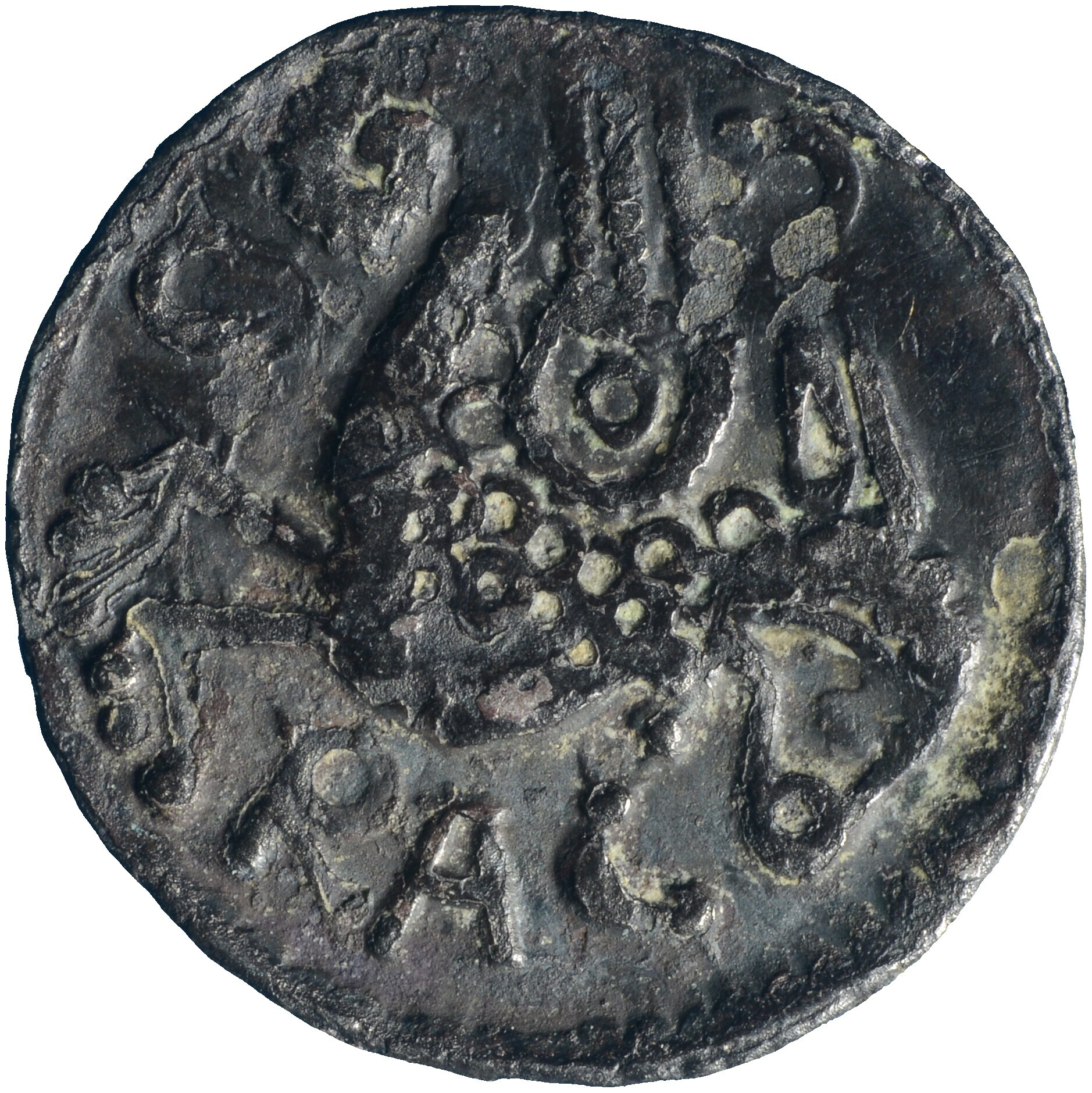 Obool; Holland Graafschap (1049-1581); Floris III (1157-1190)?; vz.: staande vogel met leeuwenkop naar rechts, met omschrift D - RACO; kz.: lang gevorkt kruis met in de kwadranten beurtelings puntcirkelstaven en ruiterspoorstaven; gewicht: 0.30 gram; muntplaats: onbekend; referentie: Hengel (1995) A9