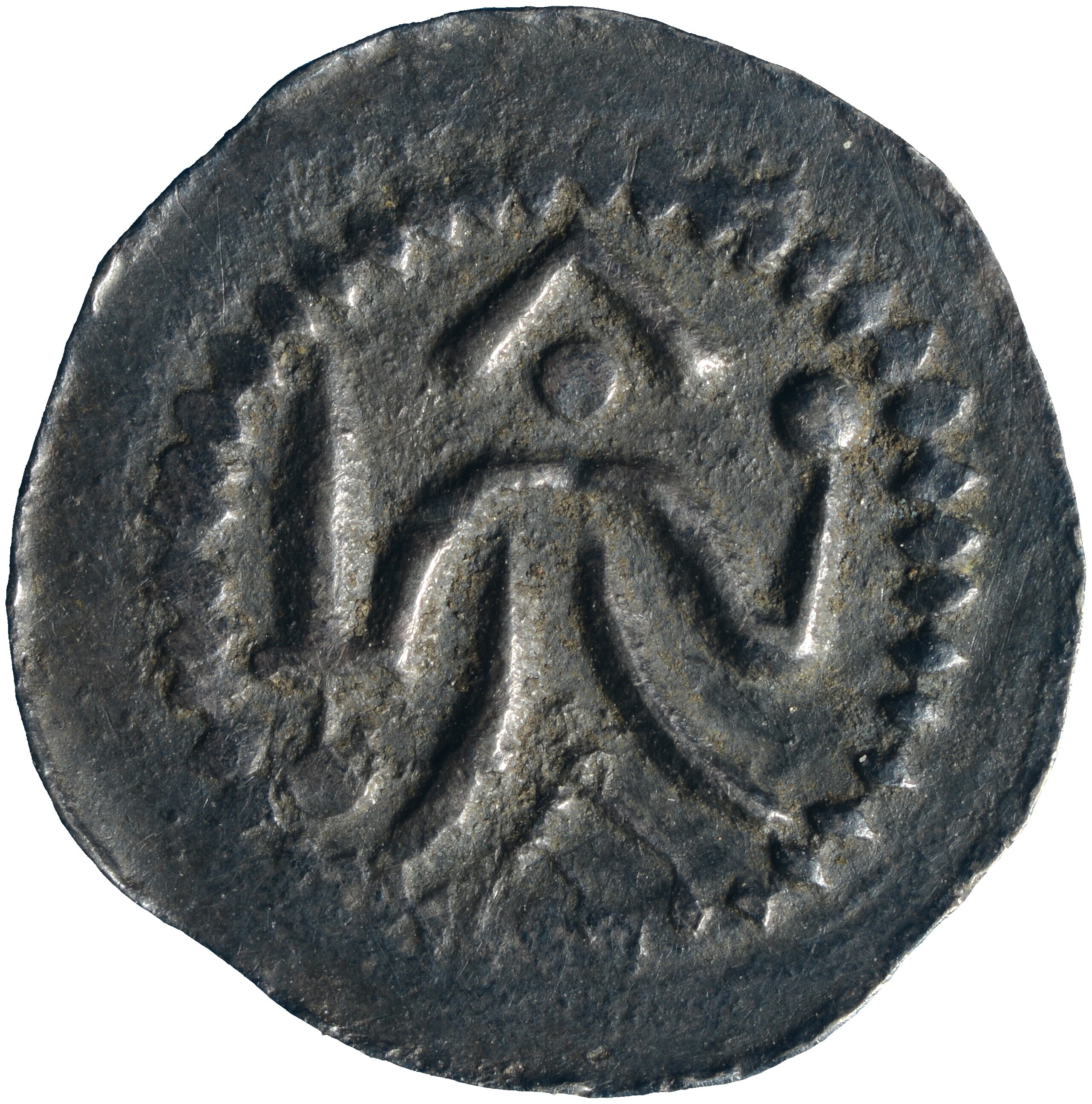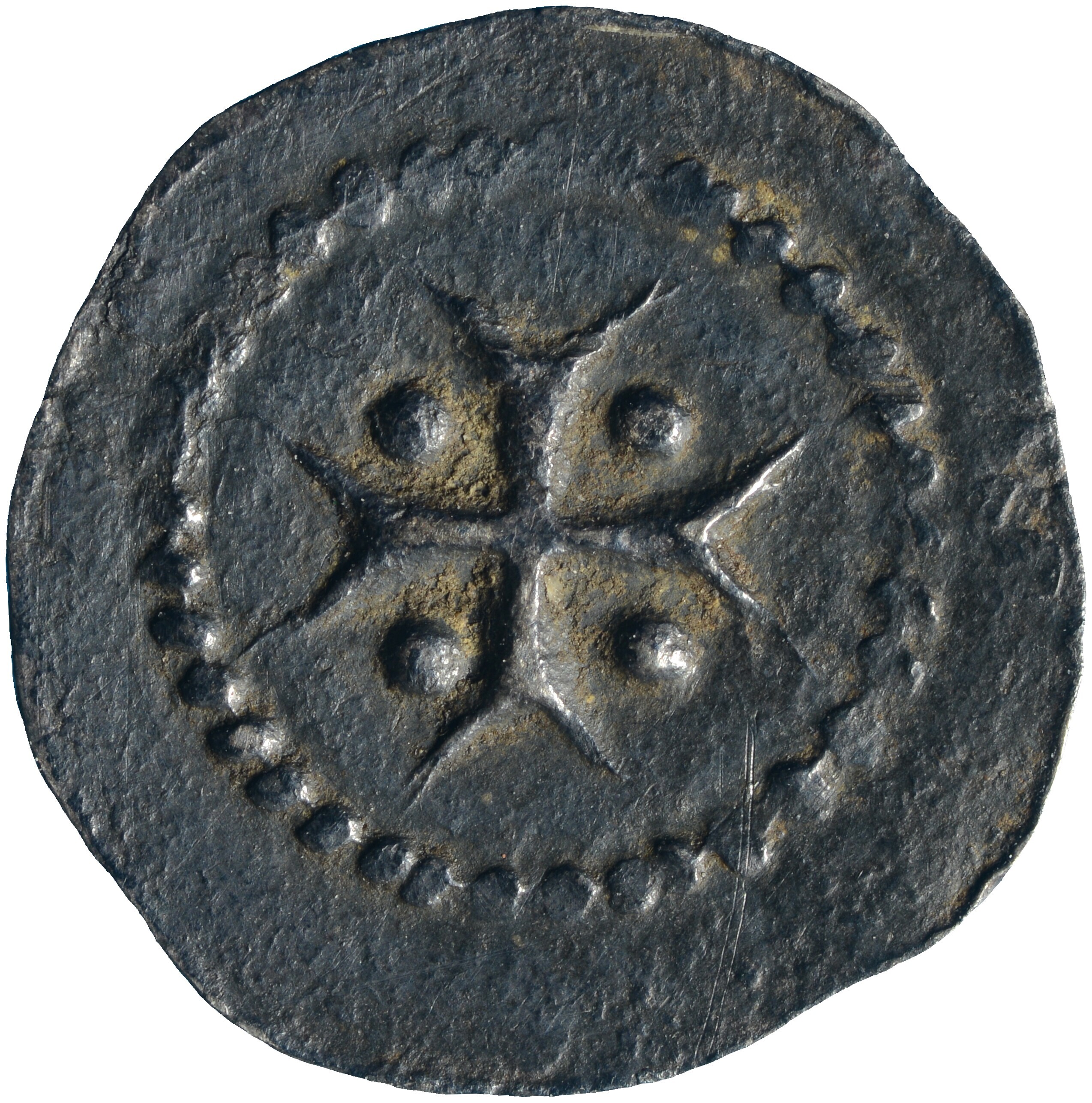 Penning; Holland Graafschap (1049-1581); Floris III (1157-1190); vz.: staande graaf met helm, zwaard en scepter binnen parelcirkel; kz.: kort gevorkt kruis met punten in de kwadranten binnen parelcirkel; muntplaats: onbekend; gewicht: 0.38 gram; uiterst zeldzaam; referentie: Grolle 5.2a, Hengel (1998) C0.3