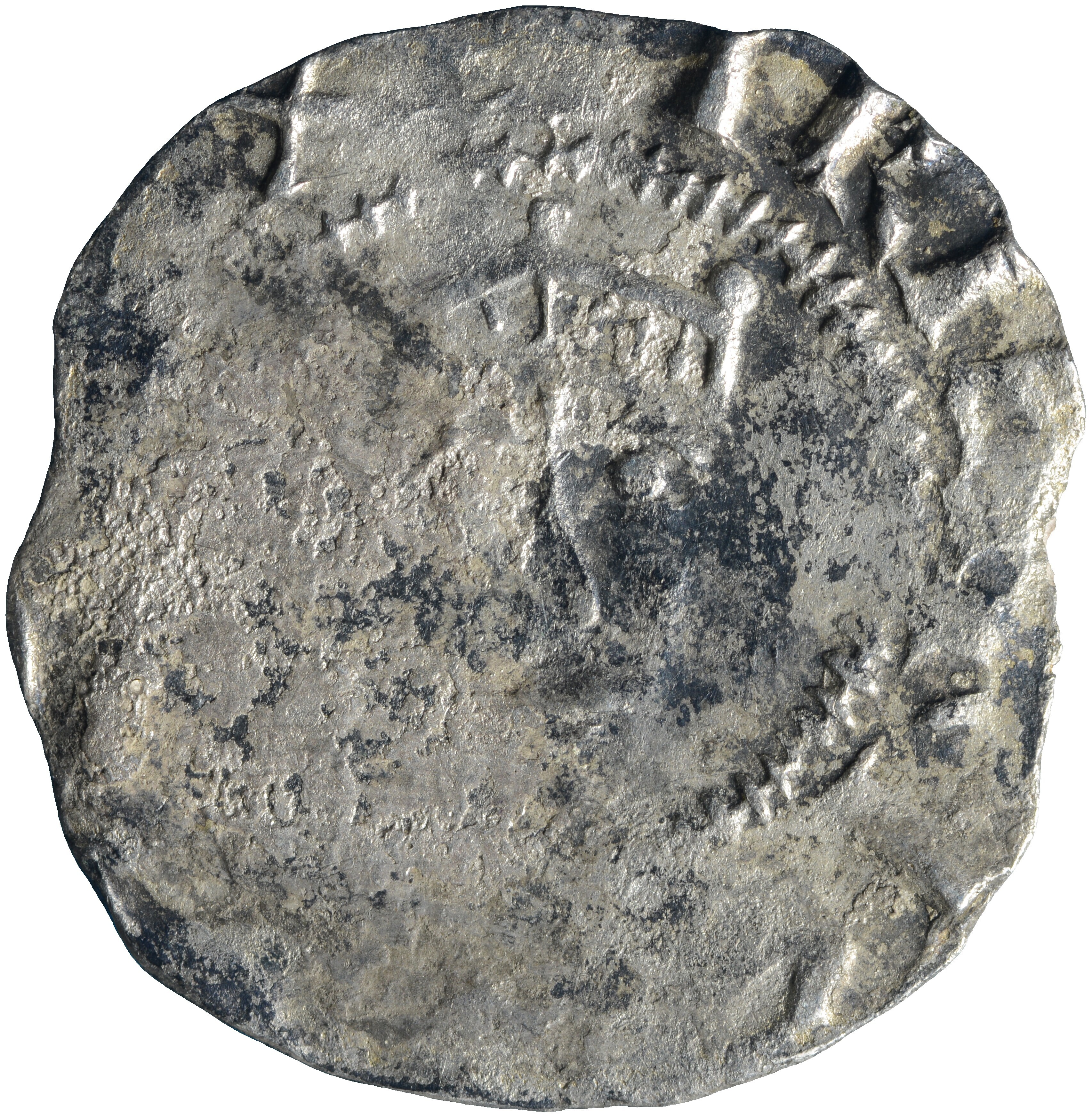Penning; Het Heilige Roomse Rijk; Hendrik II (1002-1024); vz.: hoofd met kroon van voren binnen parelcirkel, met omschrift [+]IEI[NR]I[CVSRE]X; kz.: kruis met punten binnen parelcirkel, met omschrift C - OLOGN - A; muntplaats: Tiel; gewicht: 0.95 gram; referentie: Ilisch 3.2 (vz a), Dannenberg 347 en Hävernick 147