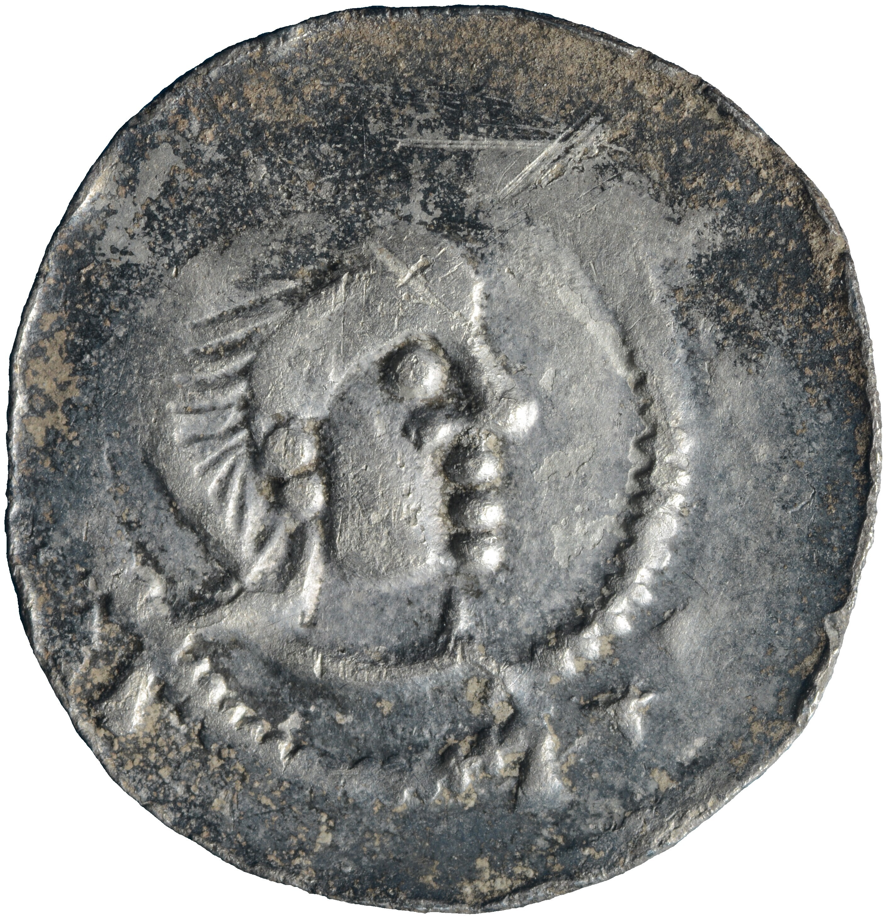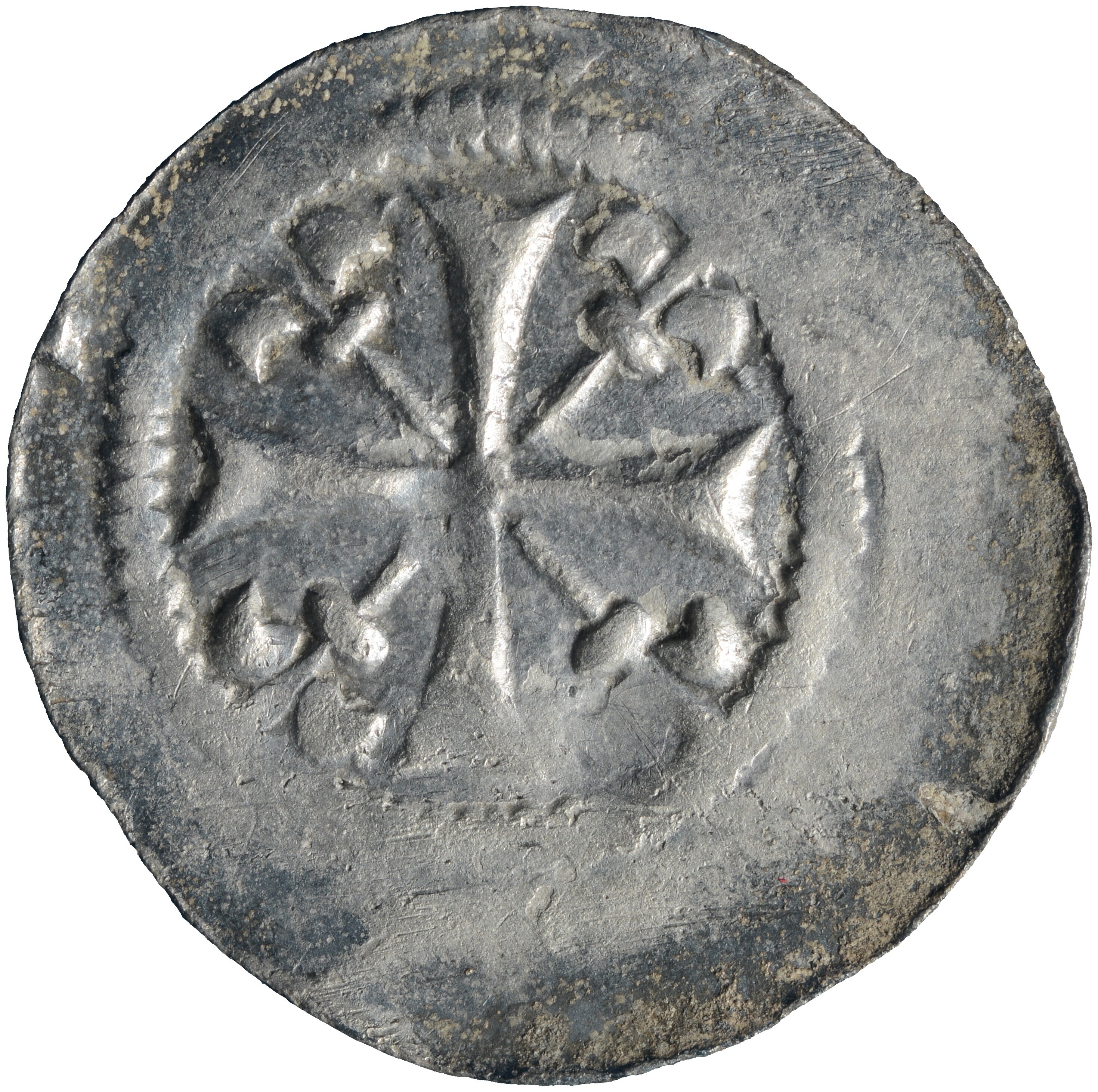 Penning; Holland Graafschap (1049-1581); Floris III (1157-1190); vz.: buste naar rechts met wild uitstaand haar, binnen parelcirkel; kz.: kort gevorkt kruis met gekruiste leliestaven met dwarsbalken binnen parelcirkel; muntplaats: onbekend; uiterst zeldzaam; referentie: Grolle 5.3.1a, Hengel (1998) C0.5