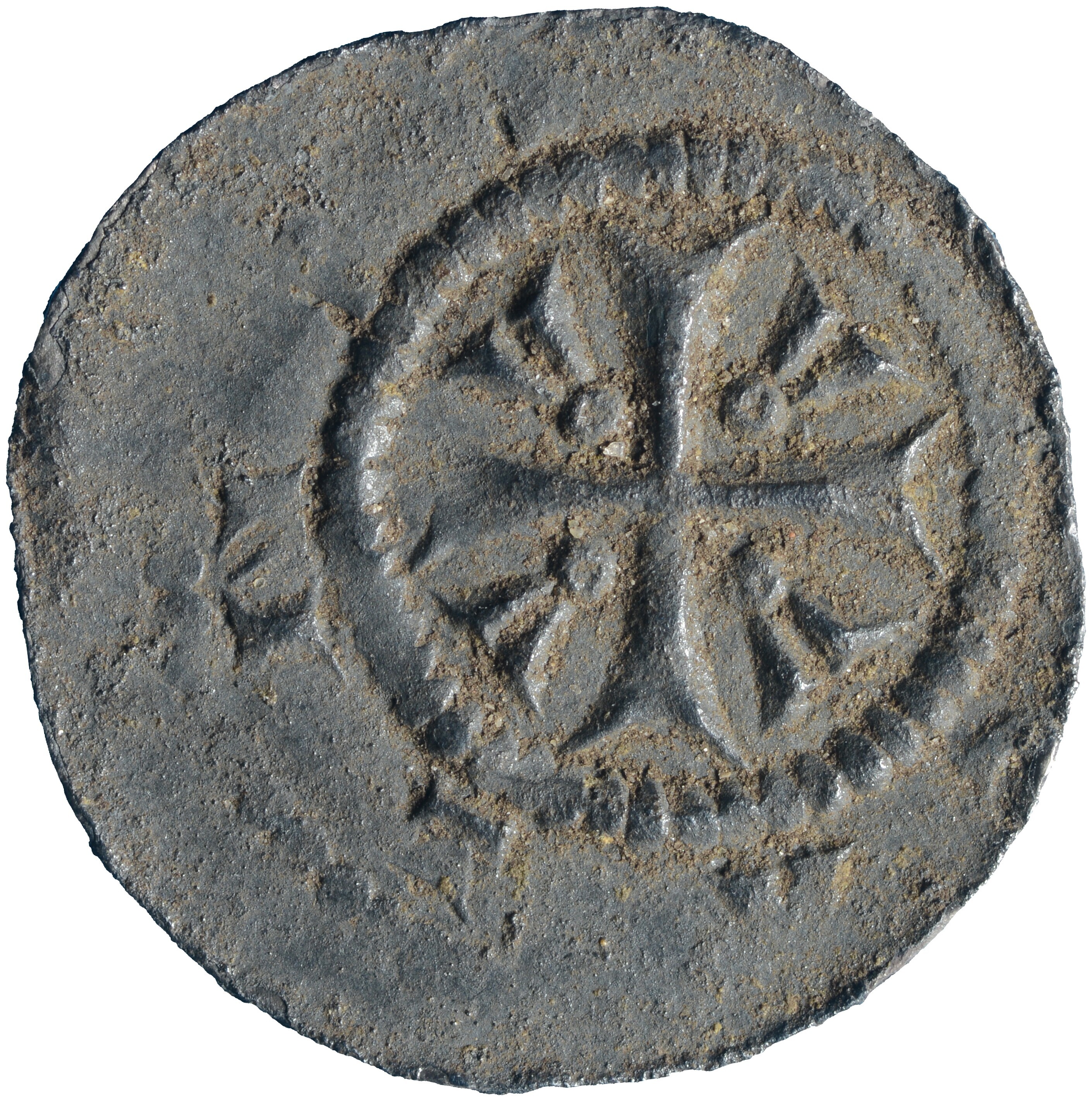 Penning; Holland Graafschap (1049-1581); Floris III? (1157-1190); vz.: buste met gravenmuts naar rechts, binnen parelcirkel met omschrift [..]VITA[.]; kz.: kort gevorkt kruis met in kwadranten V-achtige figuren; muntplaats: onbekend; gewicht: 0.63 gram; referentie: Hengel (1998) 20-2 e.v.