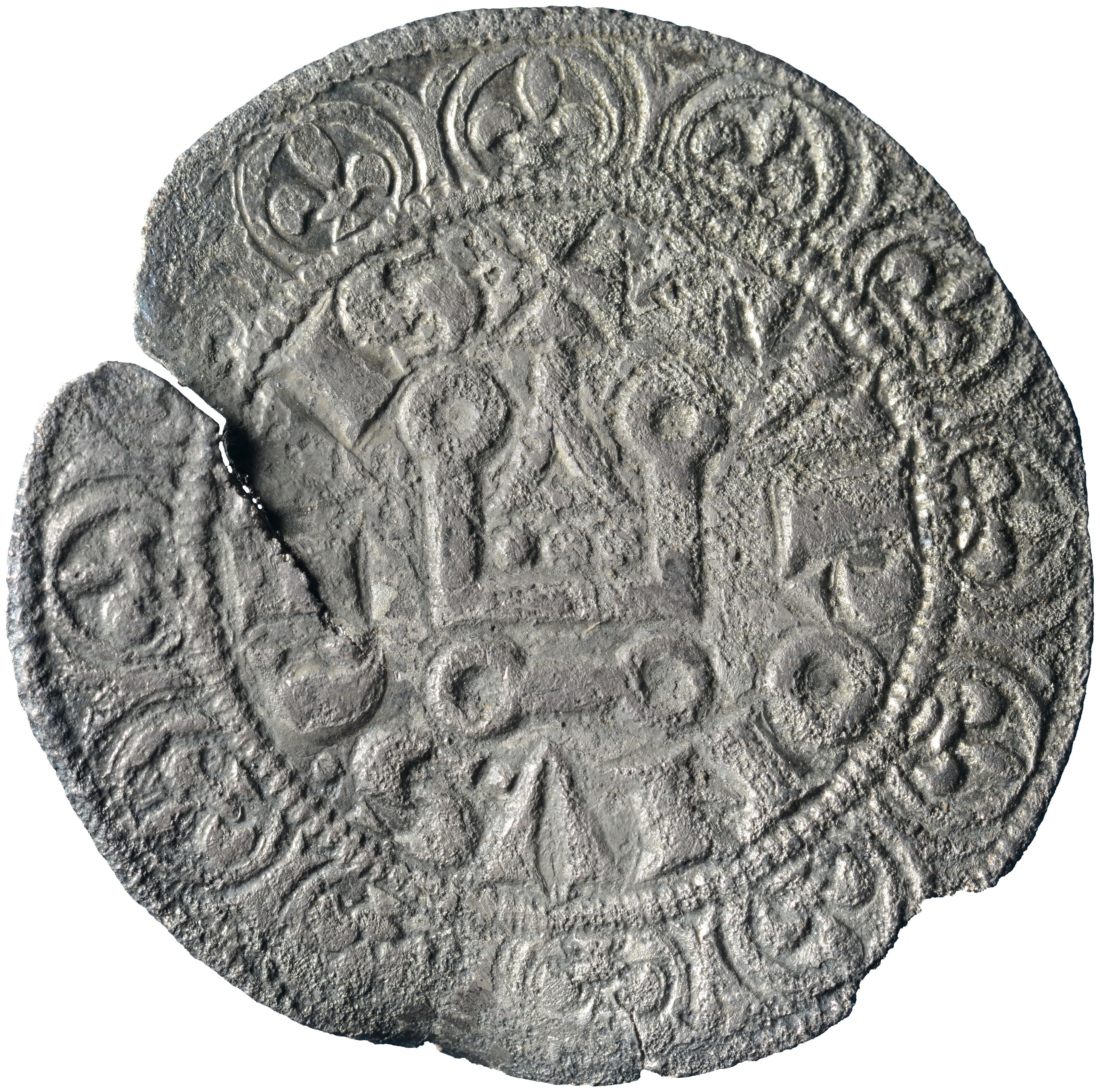 Tourse groot; Frankrijk; Philippe III (1270-1285); vz.: kort gevoet kruis binnen parelrand met omschrift: PHILIPVS•REX en BNDICTV:SIT[:N]OME:DN[I:NRI]:DEI:IHV.XPI; kz.: het kasteel van Tournois binnen parelcirkel, met omschrift: TVRONVS•CIVIS; muntplaats: Tours; gewicht: 3.44 gram; referentie: Duplessy 202