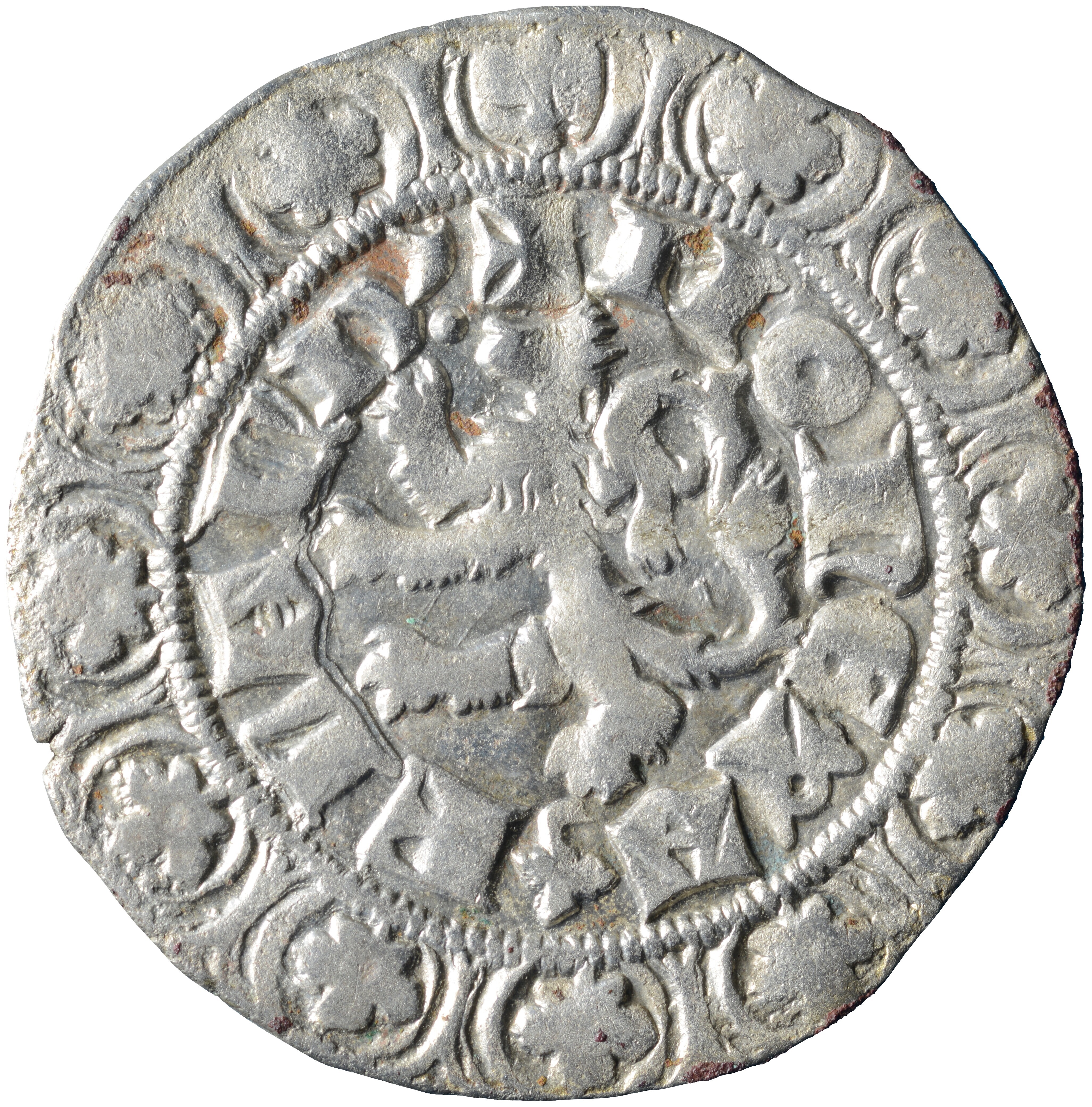 Leeuwengroot; Vlaanderen Graafschap (862-1795); Lodewijk van Male (1346-1384); vz.: klimmende leeuw naar links binnen dubbel omschrift en parelrand, met omschrift +MONETA (lelie) FLAND’.; kz.: kort gevoet kruis binnen dubbel omschrift en parelrand, met omschrift +BNDICTV:SIT:NOME:DNI:NRI:IHV:XPI (dubbele punten zijn drie punten boven elkaar); LVD / OVI / C'×CO / MES; muntplaats: Brugge, Gent of Mechelen; gewicht: ...
