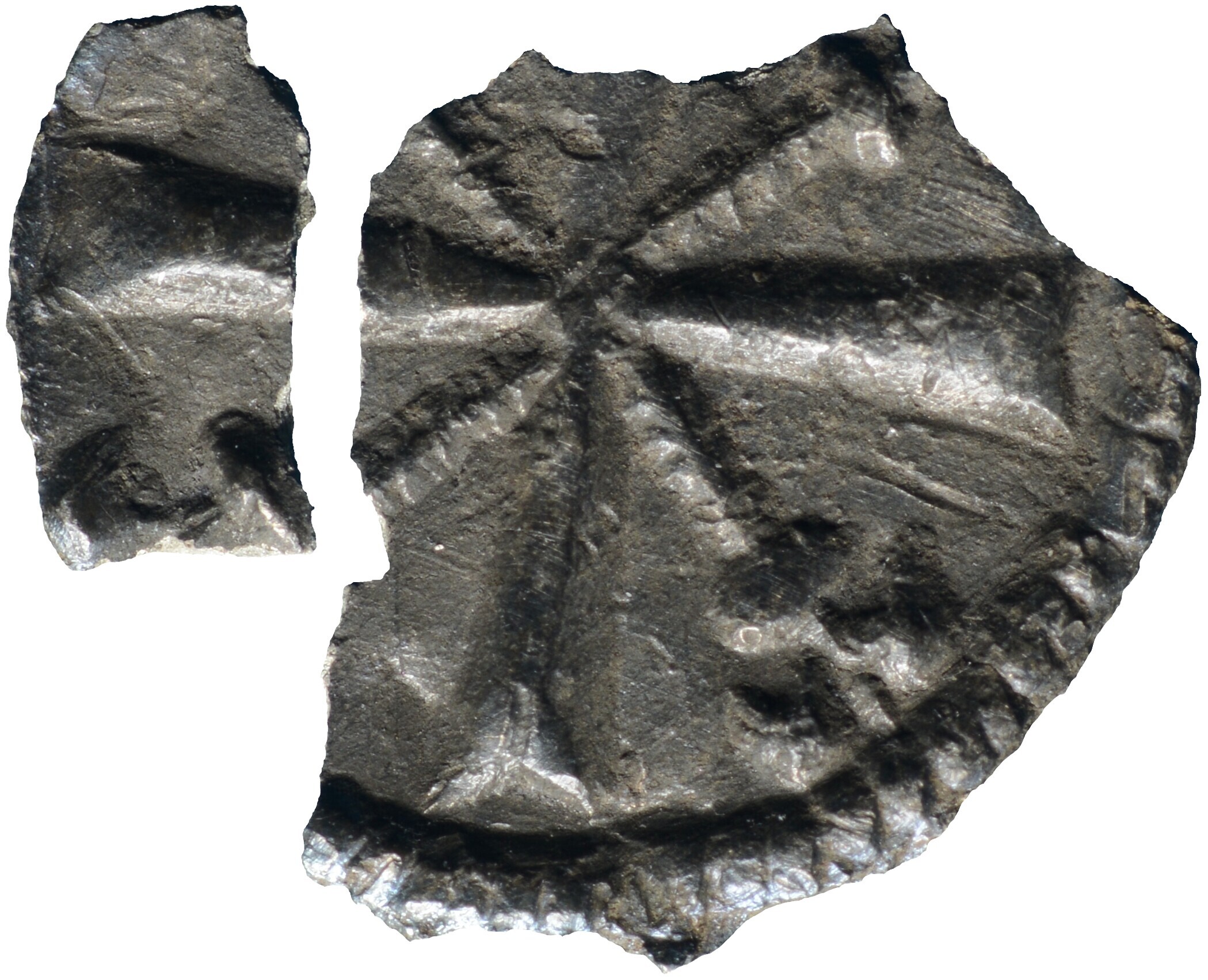 Penning; Holland Graafschap (1049-1581); Floris III (1157-1190); vz.: buste naar rechts met wild uitstaand haar binnen parelcirkel en ornamentrand bestaande uit driehoeken en cirkels; kz.: kort gevorkt kruis met gekruiste leliestaven met dwarsbalken binnen parelcirkel en ornamentrand bestaande uit driehoeken en cirkels; muntplaats: onbekend; gewicht: 0.17 gram; uiterst zeldzaam; referentie: Grolle 5.3.1a, Hengel (1998) C0.5; ...