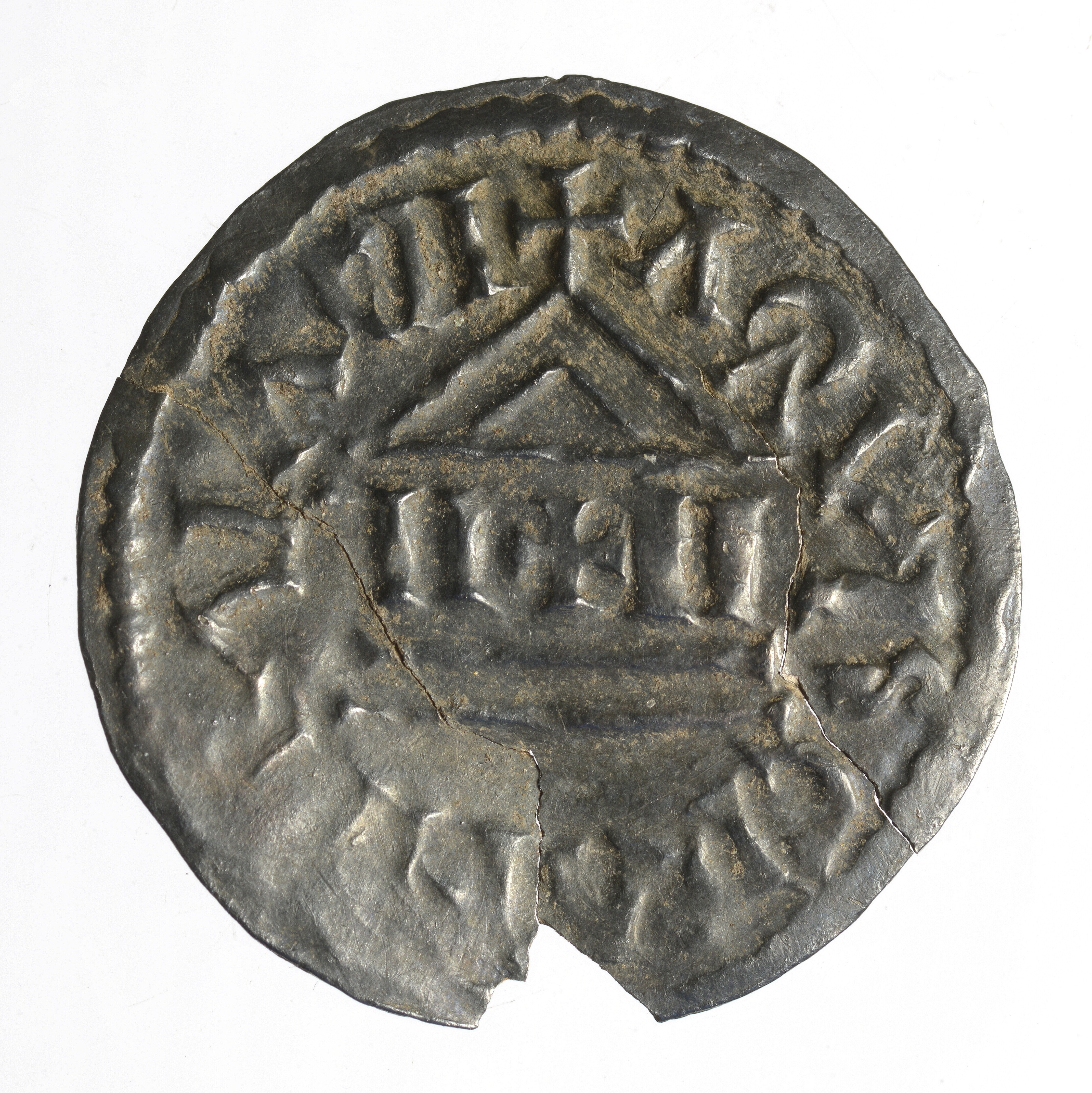 Denarius; Karolingische Rijk; Lodewijk de Vrome (814-840); vz.: kort gevoet kruis met punten binnen parelcirkel, met omschrift +IIIVDOVICVSII.OP; kz.: tempel binnen parelcirkel, met omschrift +AQVISCPAN.AIACII; muntplaats: Aken; gewicht: 1.47 gram; uniek; referentie: Morrison / Grunthal -, Grierson / Blackburn -; Class III volgens Couplands methode (tempel met plaatsnaam)