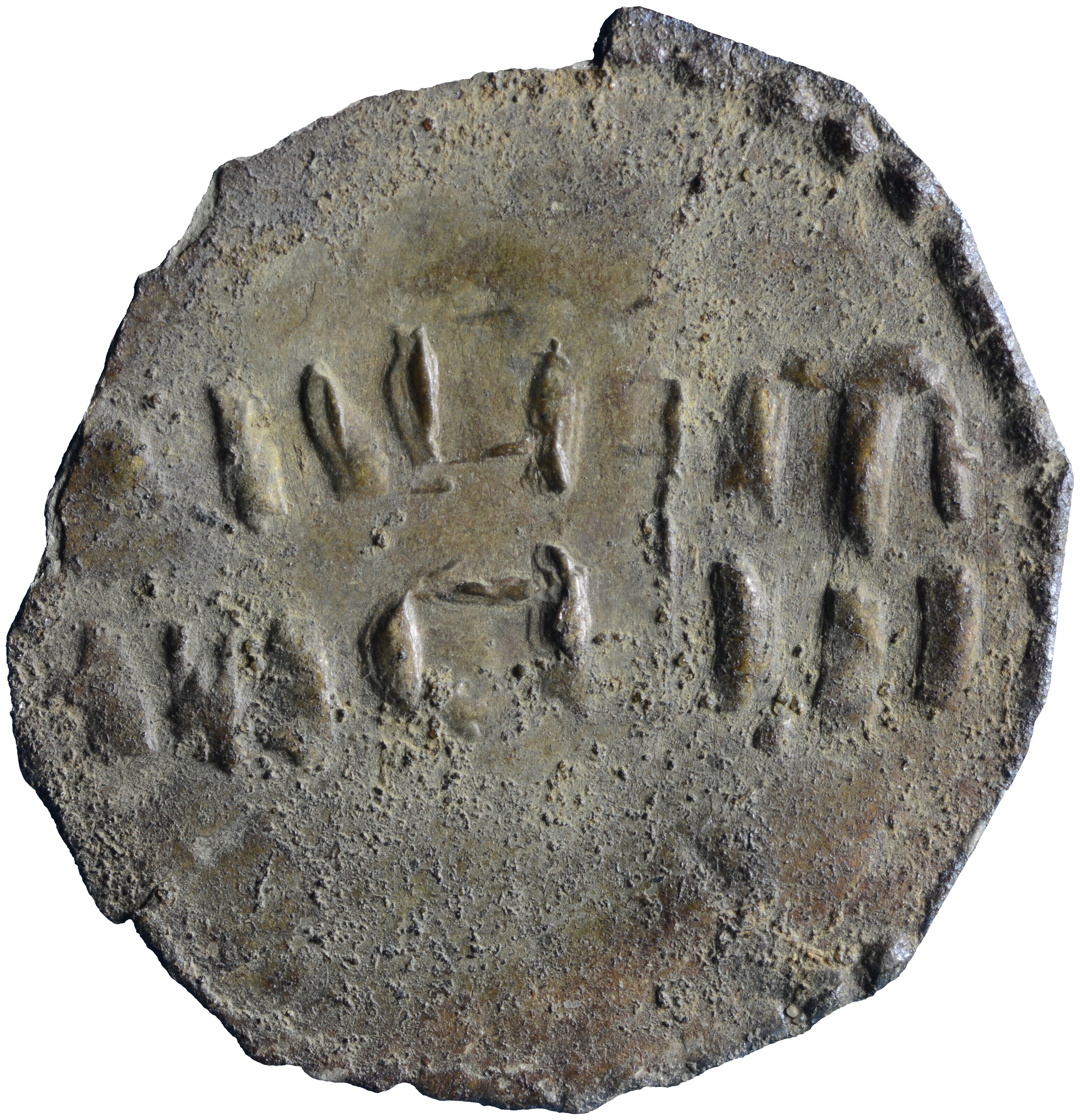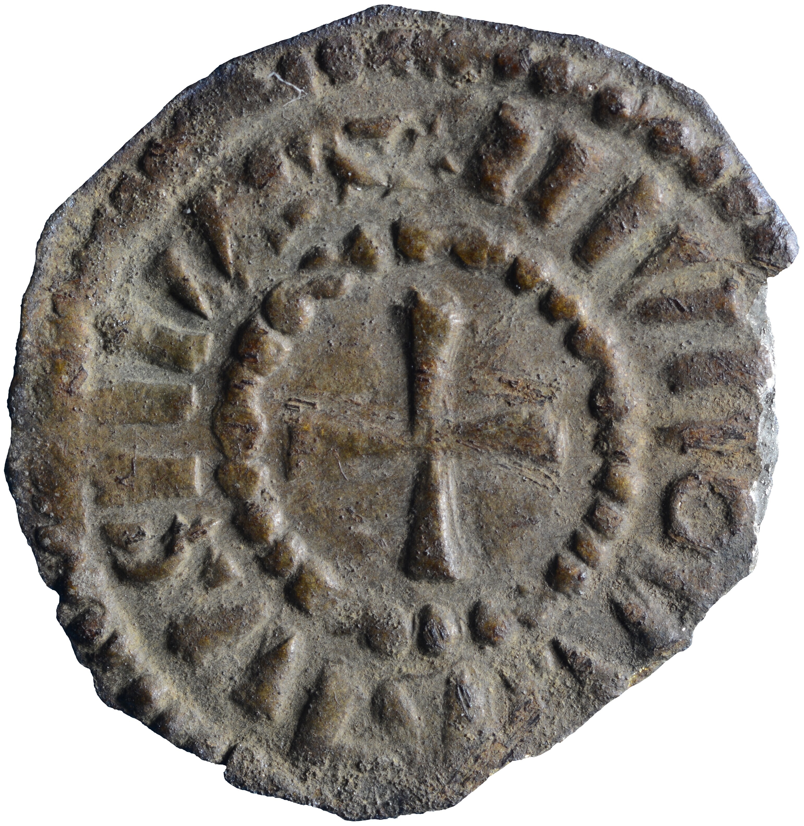 Denarius; Karolingische Rijk; Lodewijk het kind (899-911), navolging; vz.: kort gevoet kruis binnen parelcirkel, met omschrift IIIVIIOVICVSIII; kz.: tekst in twee regels NNIIII - IIICHIII binnen parelcrikel; muntplaats: Dorestad?; gewicht: 0.55 gram; zeer zeldzaam; referentie: Morrison / Grunthal 1550 vergelijkbaar, Grierson / Blackburn 830-831 vergelijkbaar; Illisch 7.2; rand uitgebroken; NUMIS 1010609; dit exemplaar is afgebeeld ...