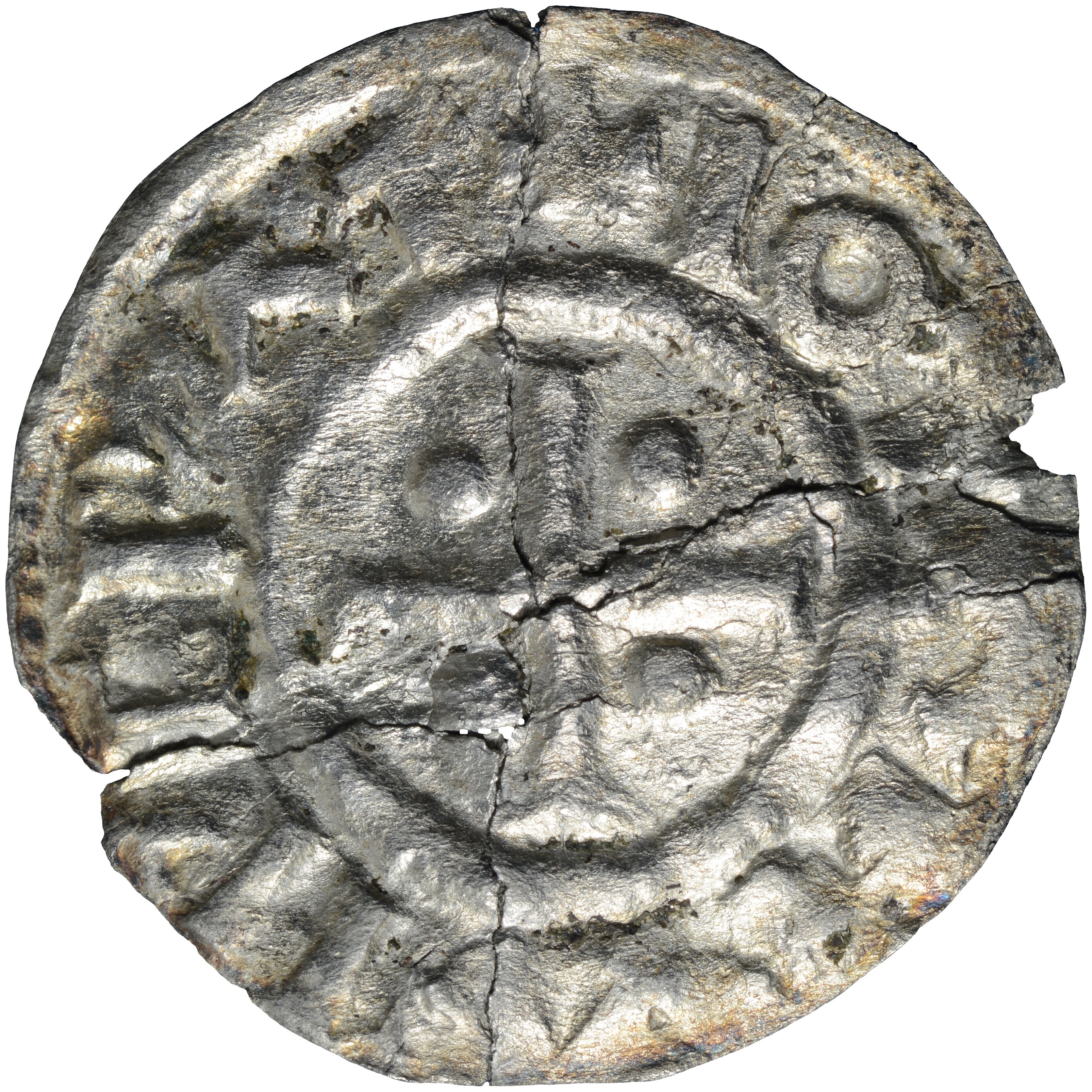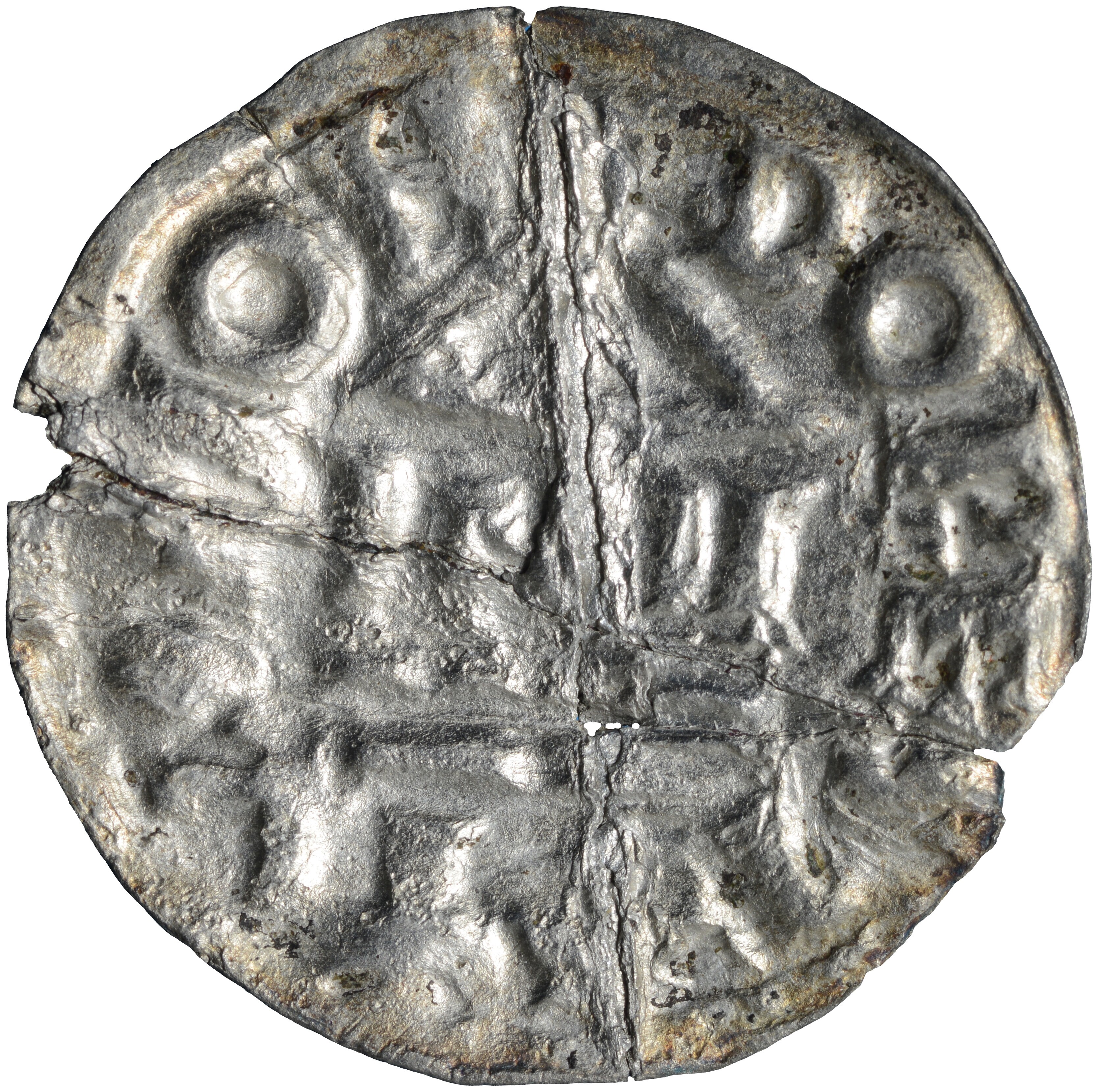 Denarius; Karolingische Rijk; Lotharius I (840-855); vz.: kort gevoet kruis met punten in de kwadranten binnen parelcirkel met omschrift +IOTAMVS IPERAT; kz.: tempel binnen parelcrikel, met omschrift:+DORESTATVS MON; muntplaats: gewicht: 1.31 gram; Dorestad; referentie: Morrison / Grunthal 525-530 var (afwijkende tekst op de voorzijde)