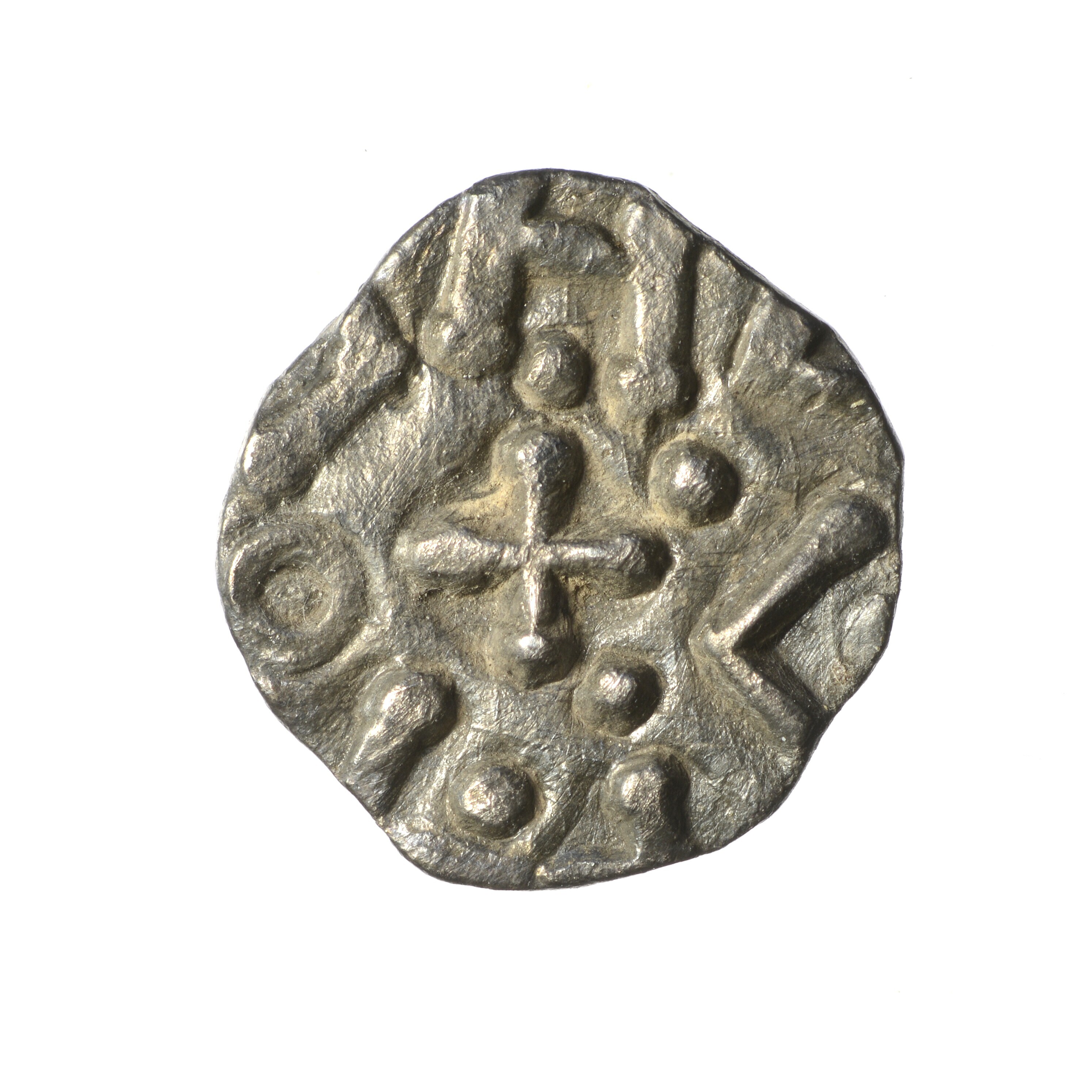 Sceatta, serie D, type 8; Angelsaksen; anoniem; vz.: cirkel met er omheen drie rechte hoeken en een streep binnen een standaard, kruisen, V's, lijnen en punten aan de rand ; kz.: kort kruis met er omheen onbekende tekst; muntplaats: onbekend; gewicht: 1.03 gram; referentie: Seaby 840; datering overgenomen uit Velde / Klaassen pagina 40