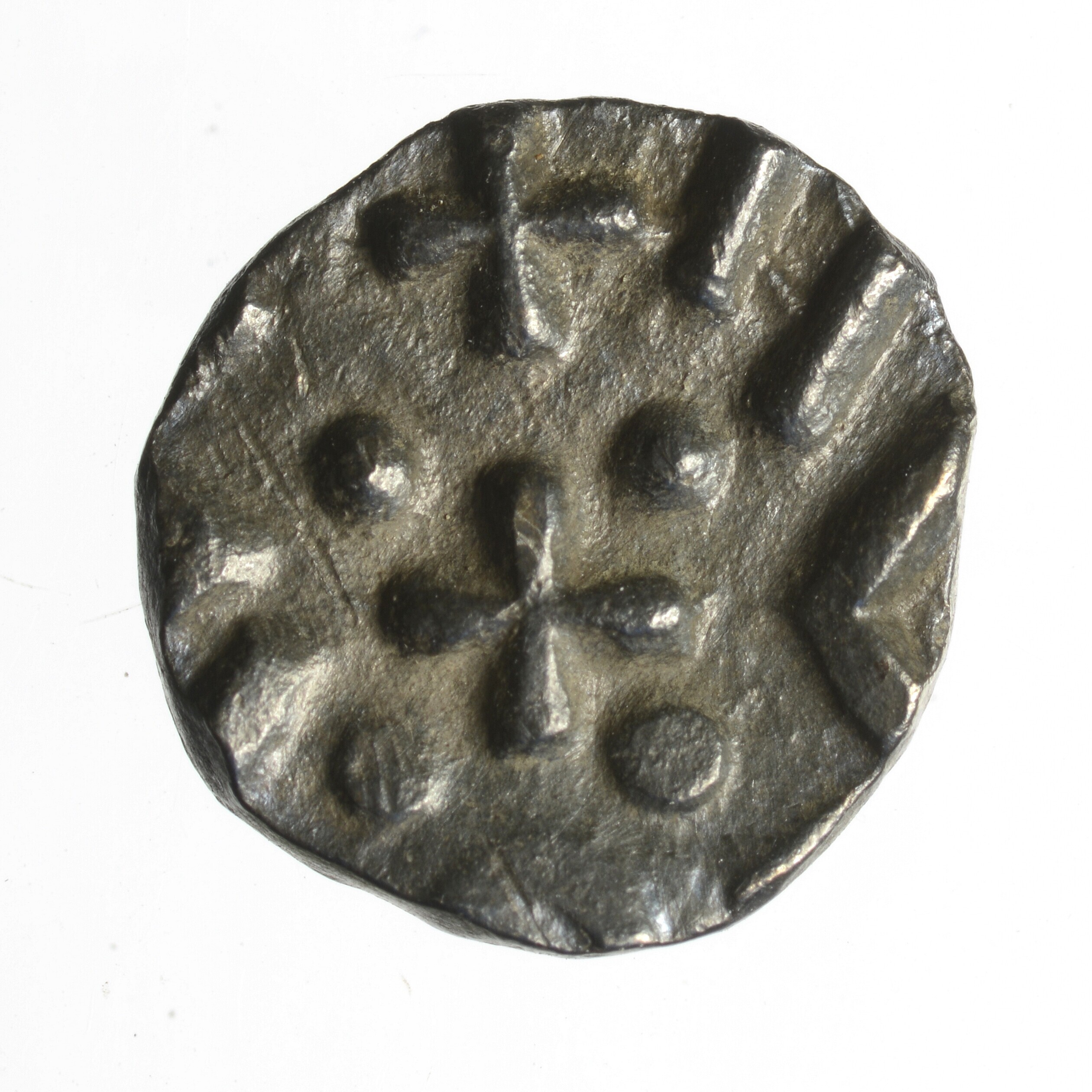 Sceatta; serie D, type 2c; Angelsaksen; vz.: buste naar rechts met A erachter en ervoor gedegradeerde runen; kz.: kruis met punten in de kwadranten omgeven door gedegradeerde letters; muntplaats: onbekend; gewicht: 1.16 gram; referentie: