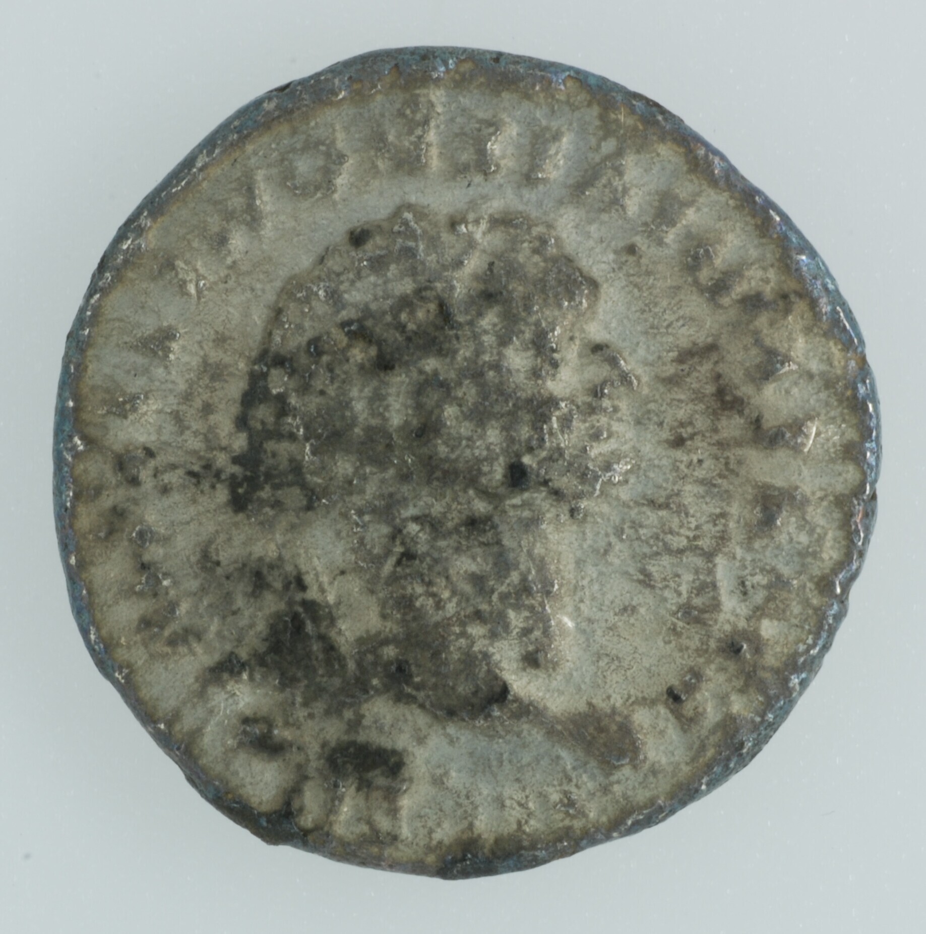 Denarius; Romeinse Keizerrijk; Domitianus als Caesar (Titus 79-81); vz.: CAESAR DIVI F DOMITIANVS COS VII, gelauwerd hoofd naar rechts; kz.: PRINCEPS IVVENTVTIS, naar links staande geit in bladerkrans; muntplaats: Rome; gewicht: 2.12 gram; RIC III 49; Castricum Oosterbuurt, Archeologische Kroniek NH 2002, 26, nr. 3; NUMIS: 1006475