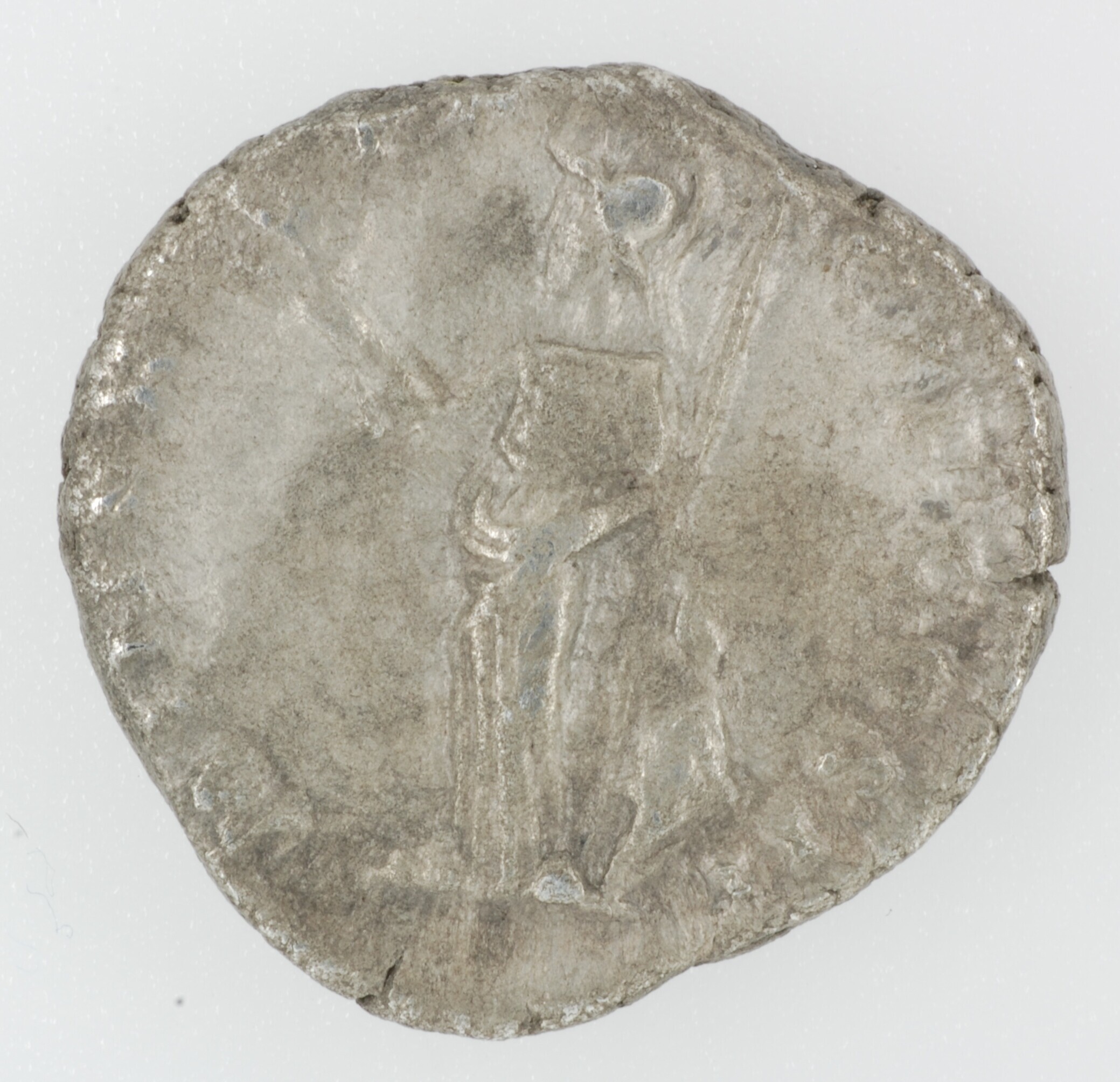 Denarius; Romeinse Keizerrijk; Clodius Albinus (193-197); vz.: D CLOD SEPT ALBIN CAES, buste naar rechts; kz.: MINER PACIF COS II, naar links staande Minerva, een olijftak vasthoudend, speer en schild op de grond; muntplaats: Rome; gewicht: 2.10 gram; referentie: RIC IVa 7; Castricum Oosterbuurt, Archeologische Kroniek NH 2002, 26, nr. 12 of 13; NUMIS 1006499 ...
