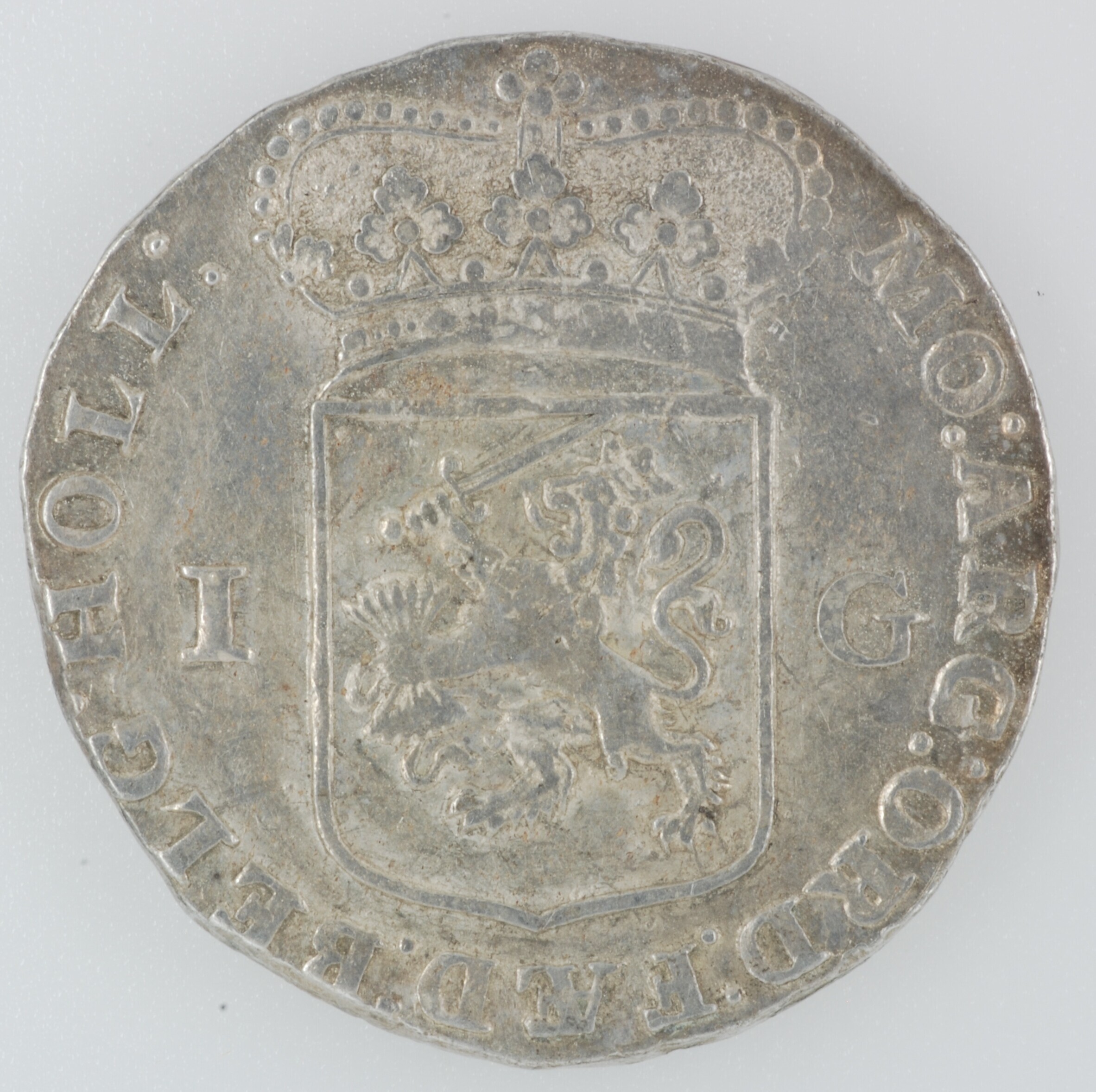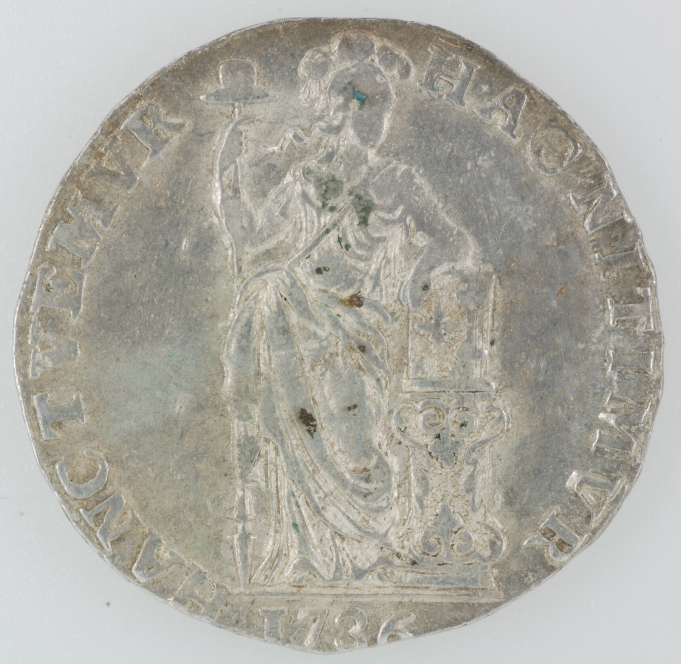 Gulden; Holland Provincie (1581-1795); vz.: gekroond generaliteitswapen met ter weerszijden waardeaanduiding 1 – G, met omschrift MO:ARG:ORD:FAED:BELG:HOLL:; kz.: Nederlands maagd, in de rechterhand een speer waarop een vrijheidshoed, met de linkerelleboog steunend op een rechtop op een zuil staande bijbel met in afsnede 1736, met omschrift HAC NITIMVR – HANC TVEMVR; muntplaats: Dordrecht; referentie: Delmonte ...