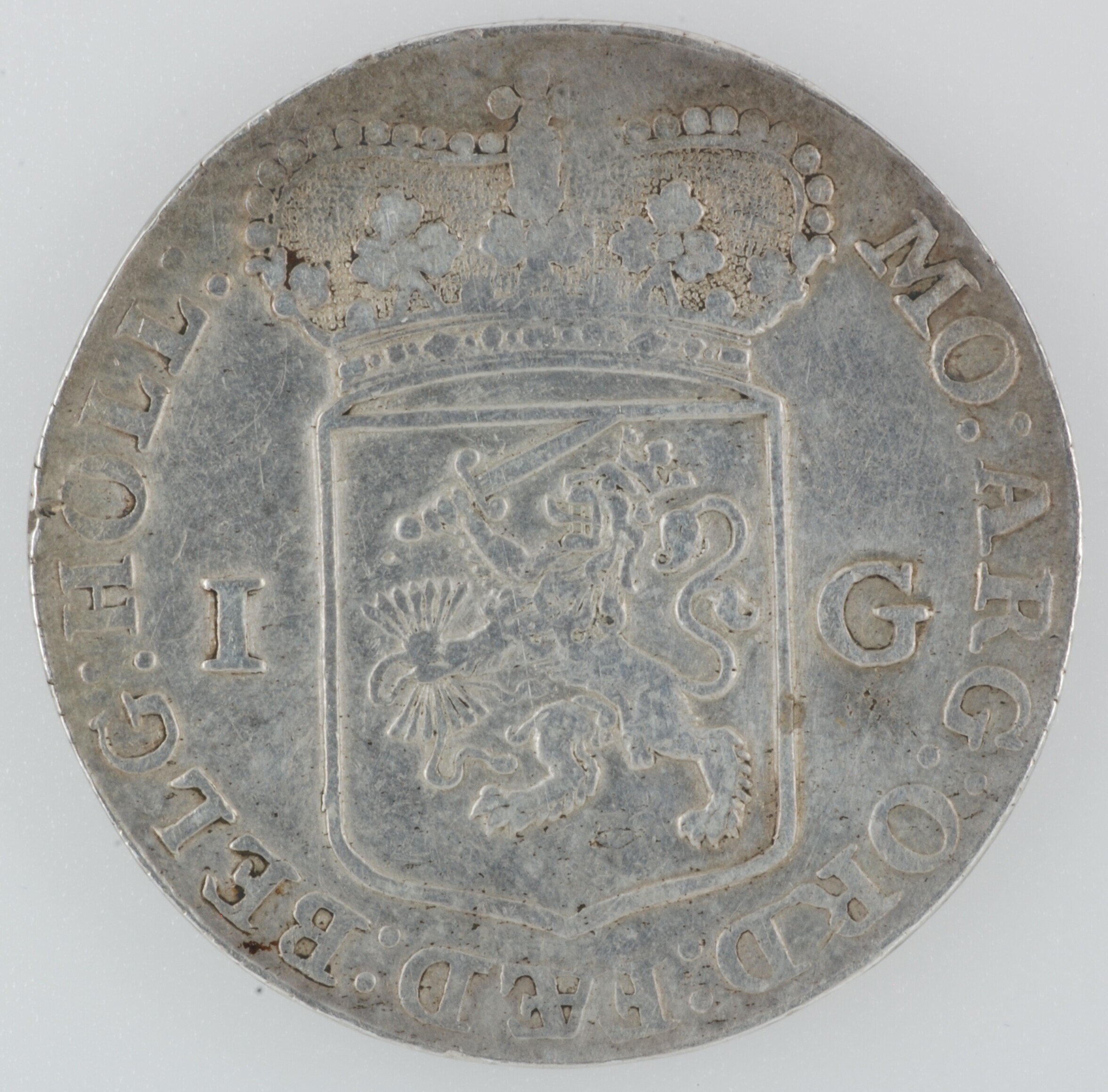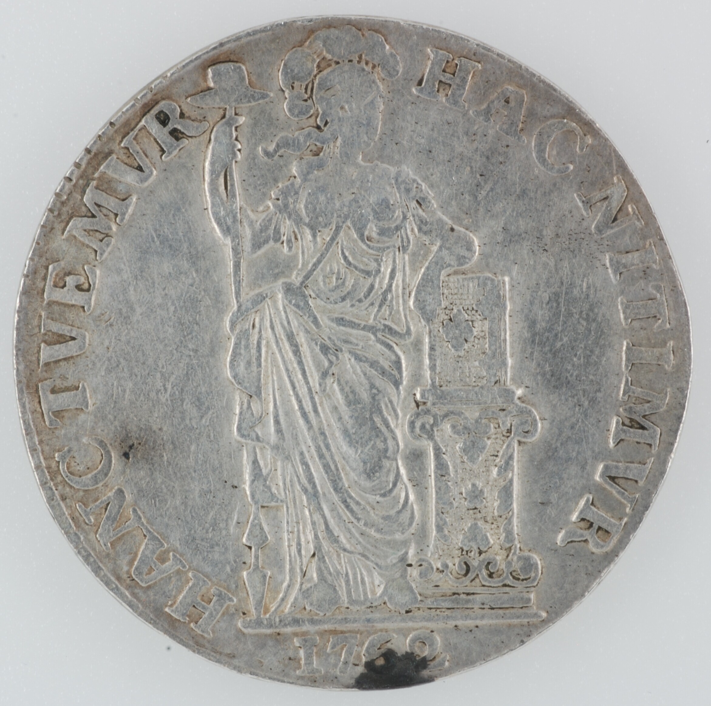 Gulden; Holland Provincie (1581-1795); vz.: gekroond generaliteitswapen met ter weerszijden waardeaanduiding 1 – G, met omschrift MO:ARG:ORD:FAED:BELG:HOLL:; kz.: Nederlands maagd, in de rechterhand een speer waarop een vrijheidshoed, met de linkerelleboog steunend op een rechtop op een zuil staande bijbel met in afsnede 1762, met omschrift HAC NITIMVR – HANC TVEMVR; muntplaats: Dordrecht; referentie: Delmonte ...